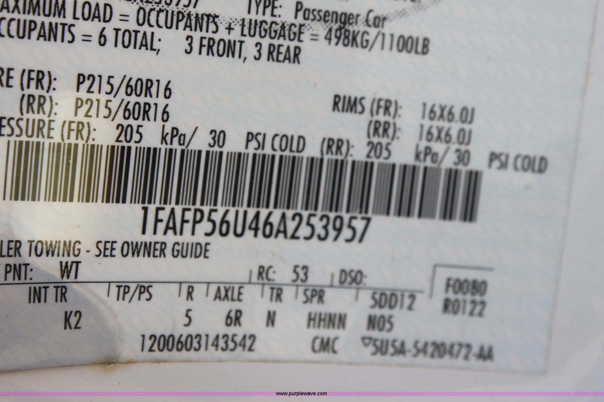 Purple Wave is selling a used Passenger Vehicle in Kansas. This item is a 2006 Ford Taurus SEL with the following: 127,717 miles on odometer, 3.0L V6 EFI engine, Automatic transmission, AC and heat, Tilt, Cruise, AM/FM/CD, Power windows, locks, mirrors, and seats, 215/60R16 tires, Equip# 43