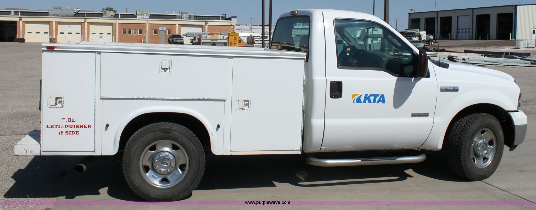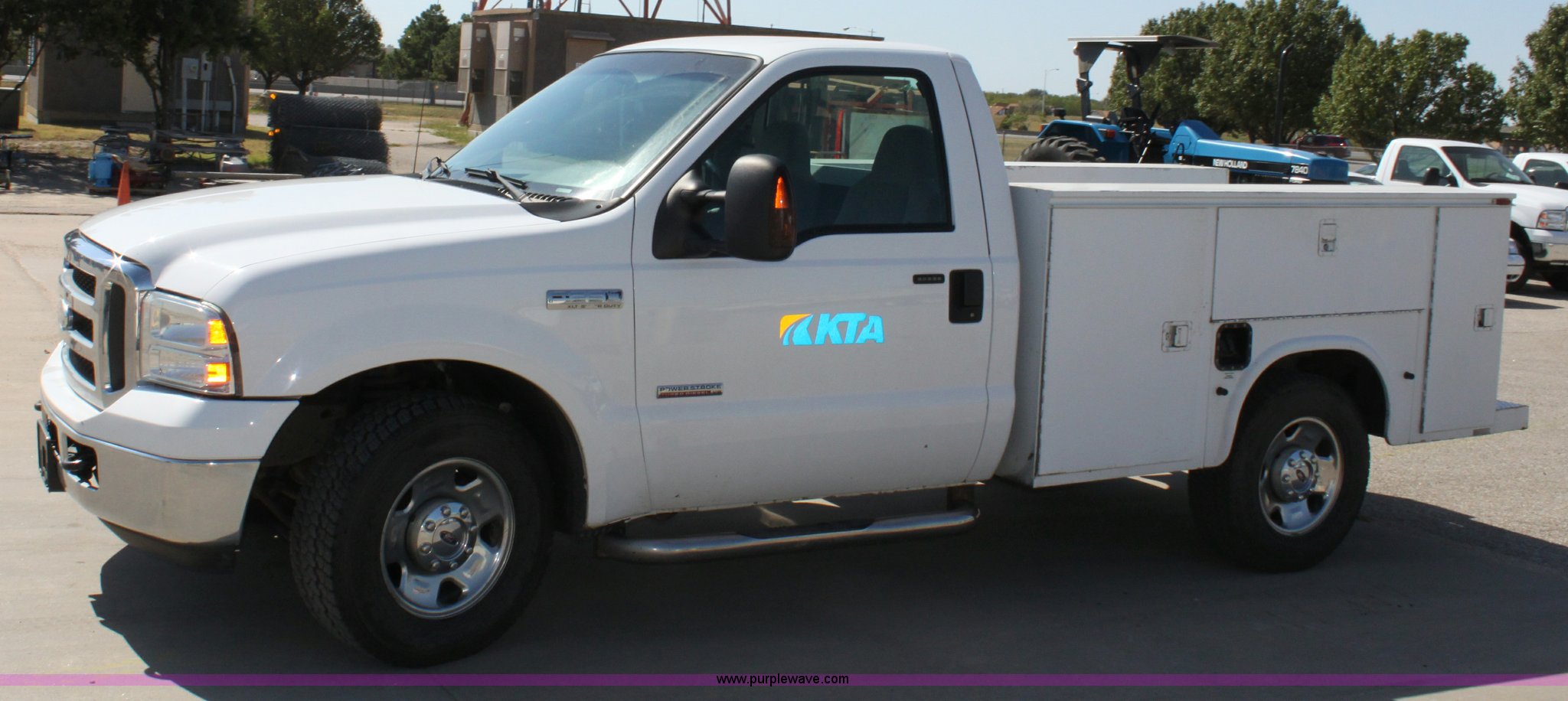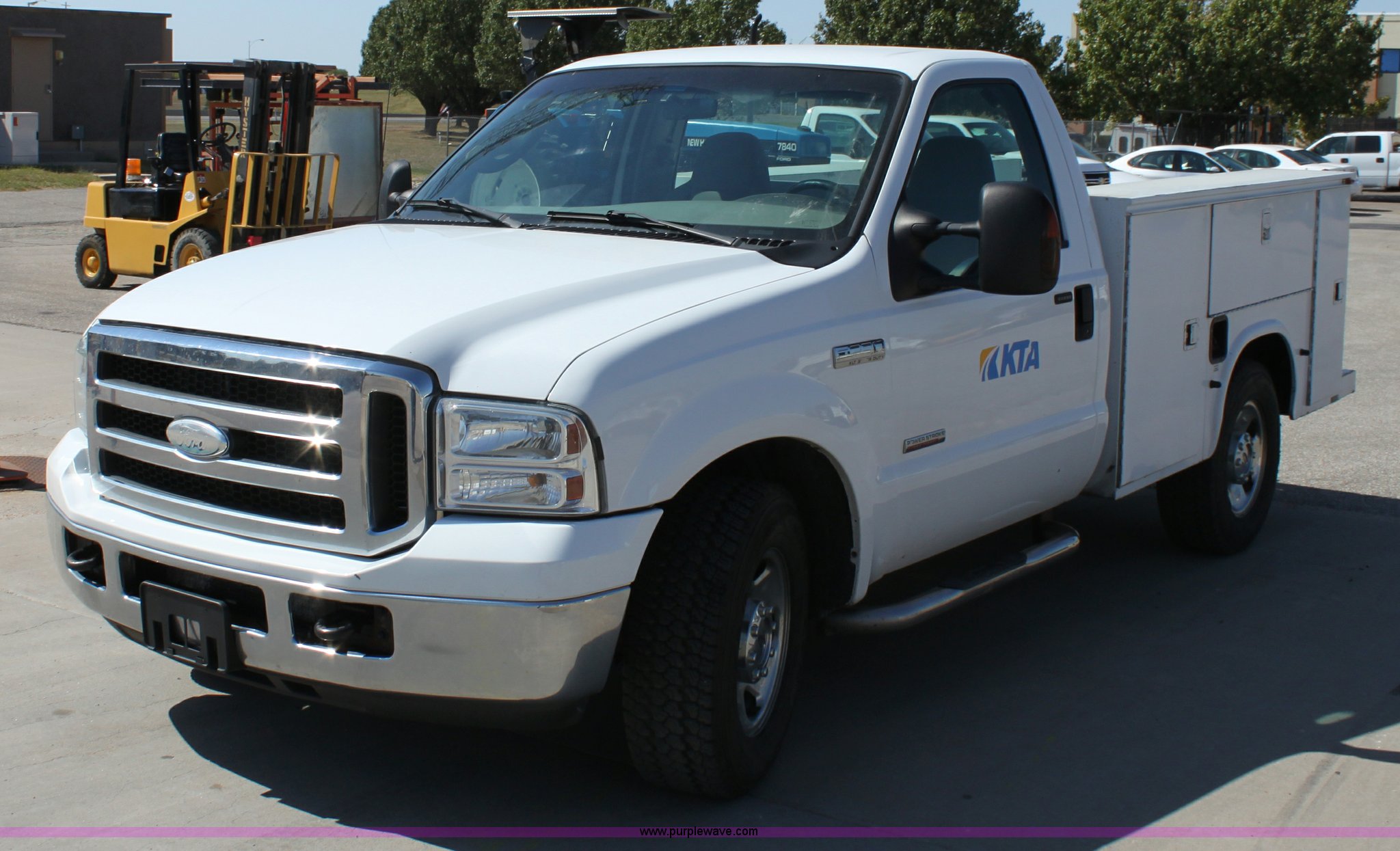 Purple Wave is selling a used Service Truck in Kansas. This item is a 2005 Ford F250 XLT Super Duty pickup truck with the following: 160,906 miles on odometer, Powerstroke 6.0L V8 diesel engine, Automatic transmission, AC and heat, Tilt, Cruise, AM/FM/CD, Power windows, locks, and mirrors, Reese brake controller, Nerf bars, Utility bed, Pintle hitch, Trailer wiring, 265/70R17 tires, Equip# 2045
