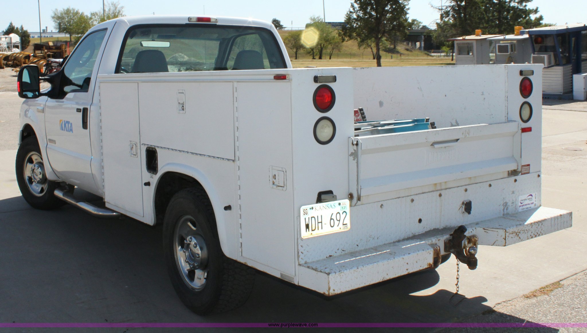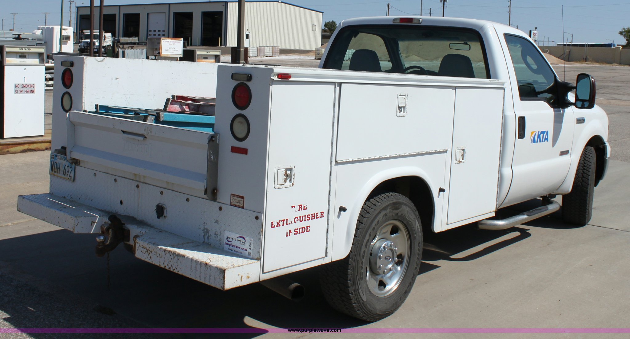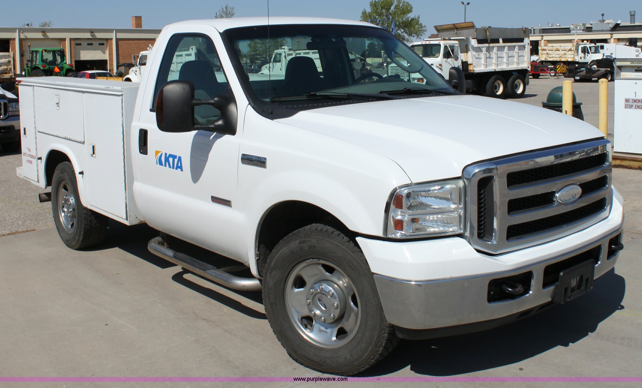 Purple Wave is selling a used Service Truck in Kansas. This item is a 2005 Ford F250 XLT Super Duty pickup truck with the following: 160,906 miles on odometer, Powerstroke 6.0L V8 diesel engine, Automatic transmission, AC and heat, Tilt, Cruise, AM/FM/CD, Power windows, locks, and mirrors, Reese brake controller, Nerf bars, Utility bed, Pintle hitch, Trailer wiring, 265/70R17 tires, Equip# 2045
