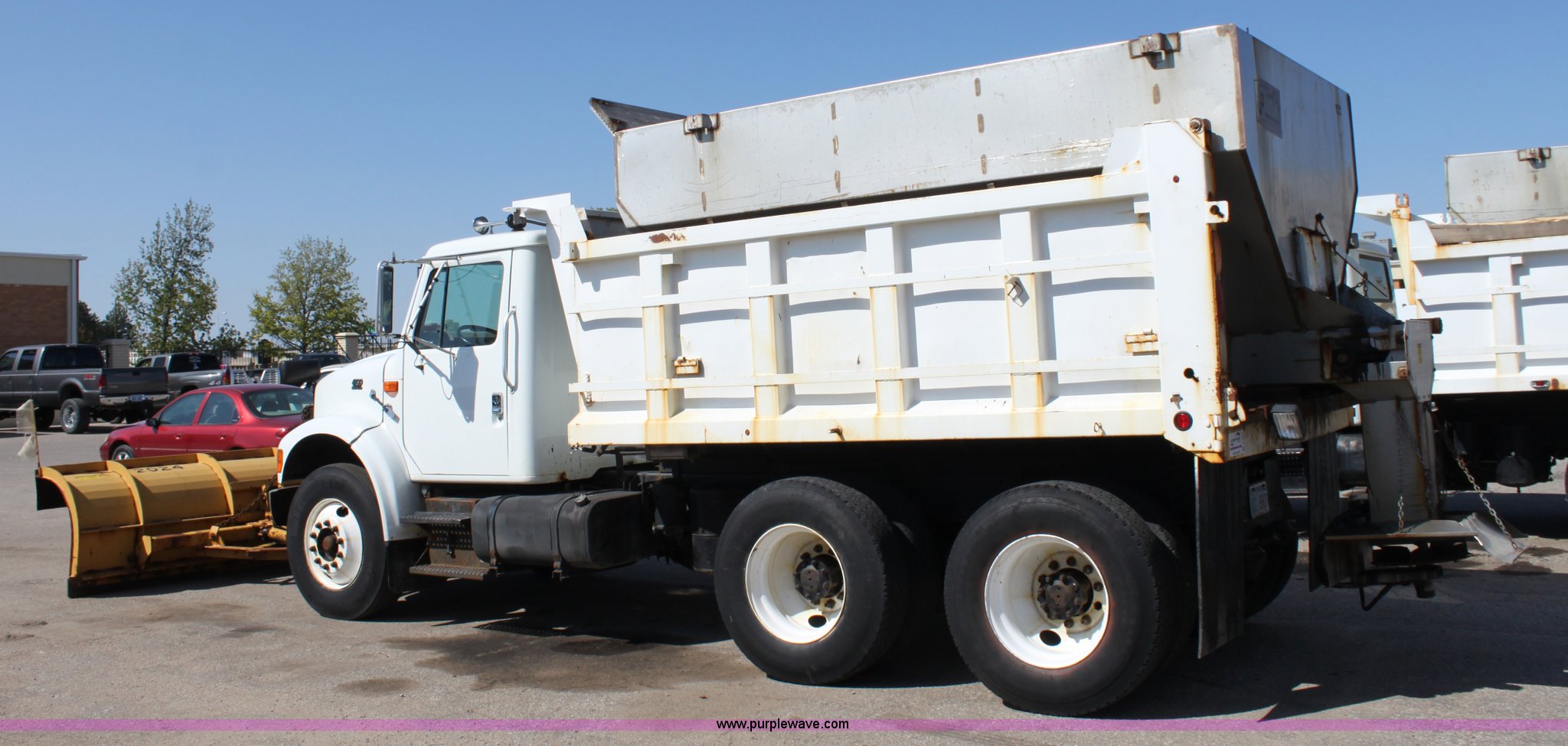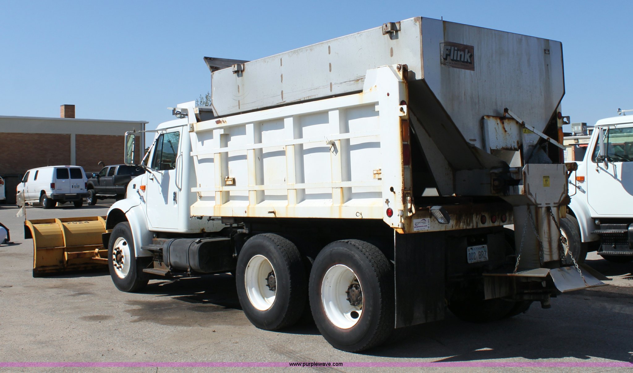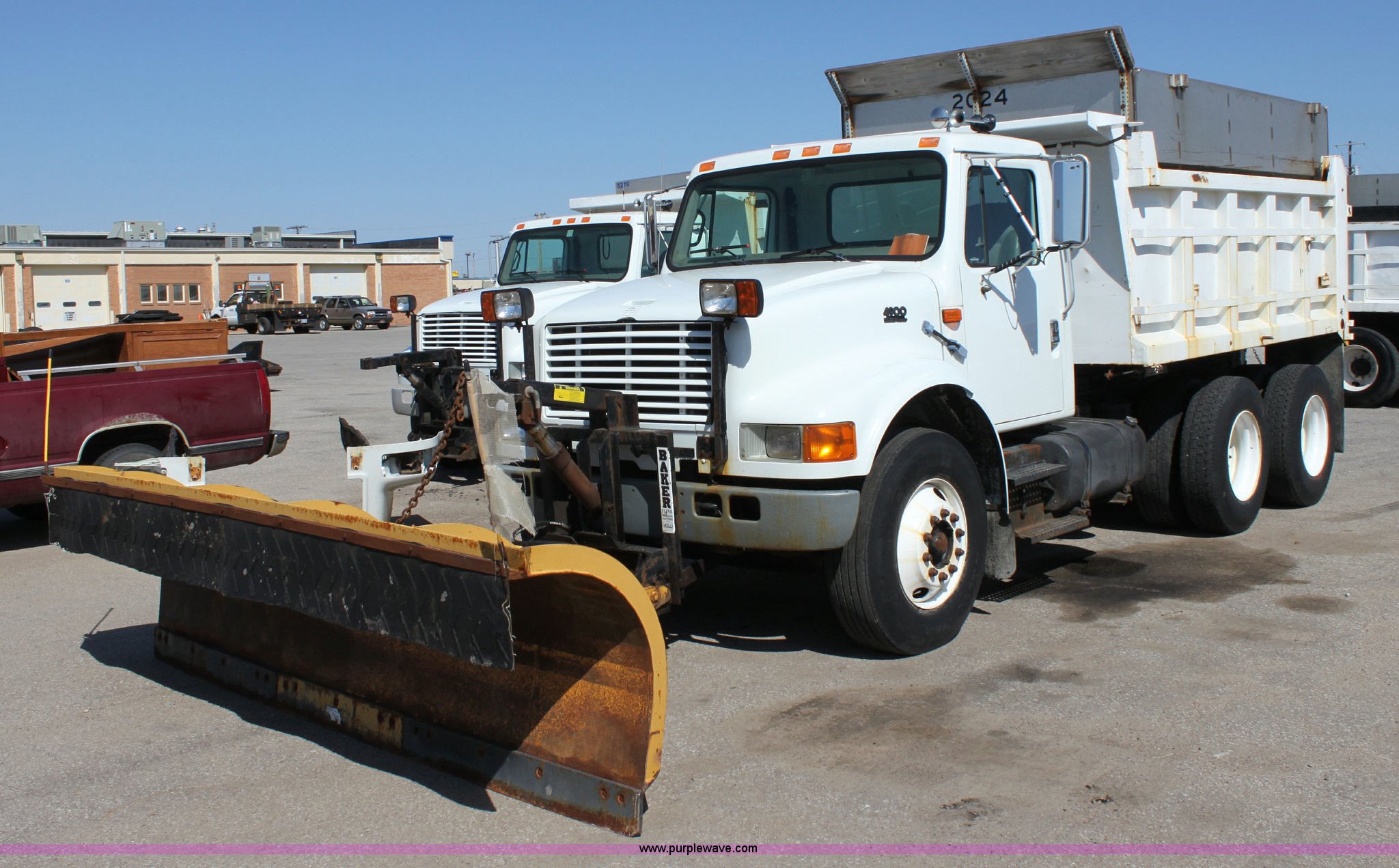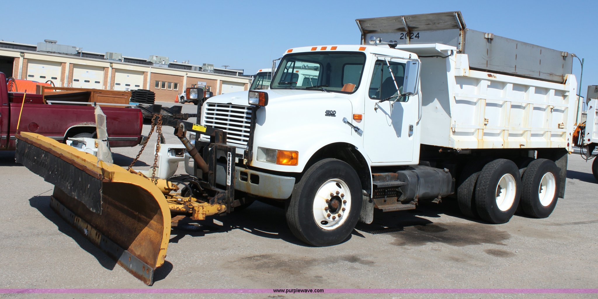 Purple Wave is selling a used Construction Dump Truck in Kansas. This item is a 1999 International 4900 tandem axle dump truck with plow and spreader with the following: 78,123 miles on odometer, 4,092 hours on meter, Navistar DT530 8.7L diesel engine, Allison automatic transmission, Low clutch pressure, AC and heat, AM/FM/Cassette, Heated mirrors, Cruise, Power windows, Suspension seat, Chelsea PTO, Locking power divider, Greesen in-cab plow controls, Air operated end gate, Flink 11' snow plow, Flink stainless steel spreader, Air brakes, Rear hydraulic remotes, Pintle hitch, 11R22.5 tires, Equip# 2024