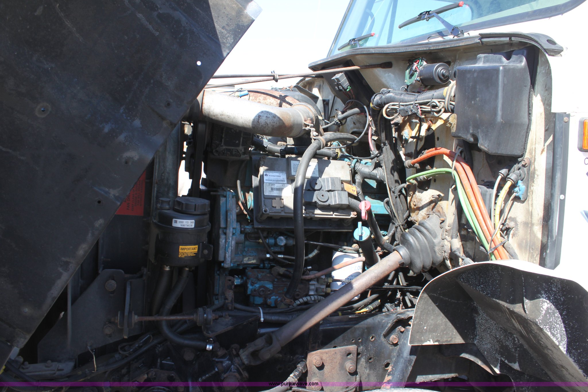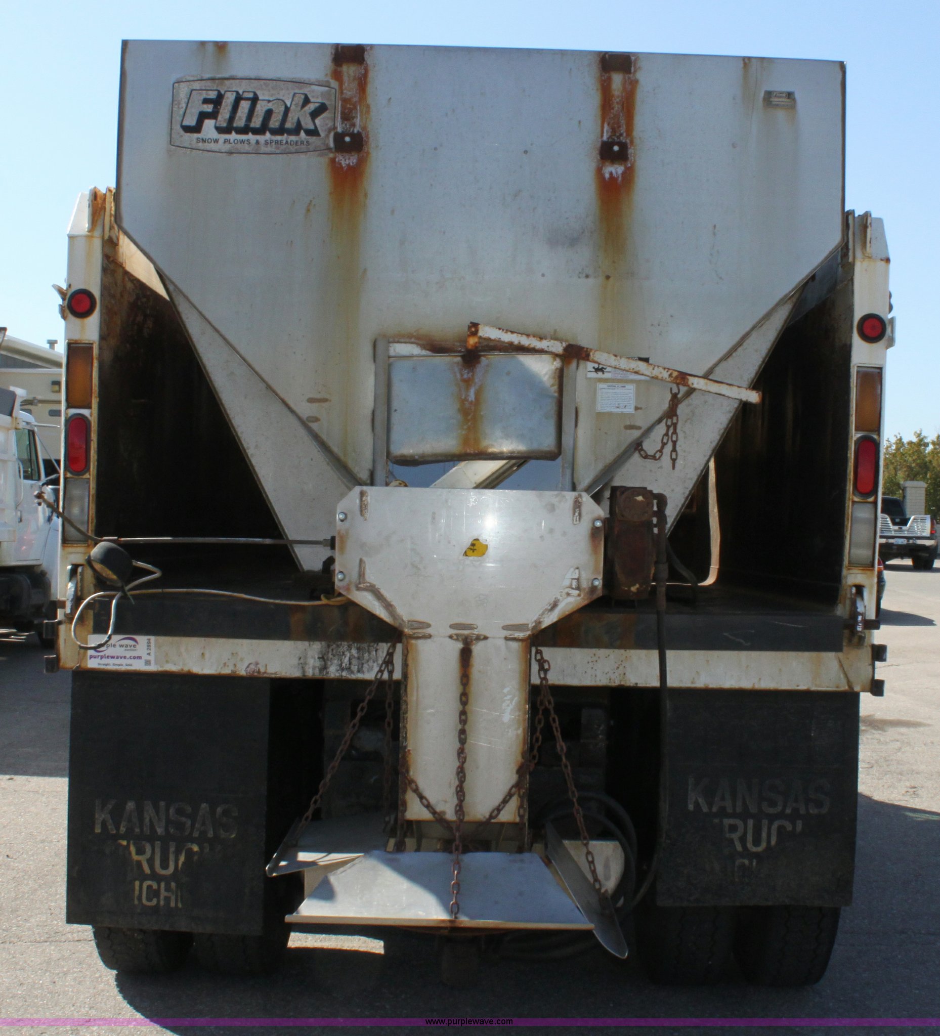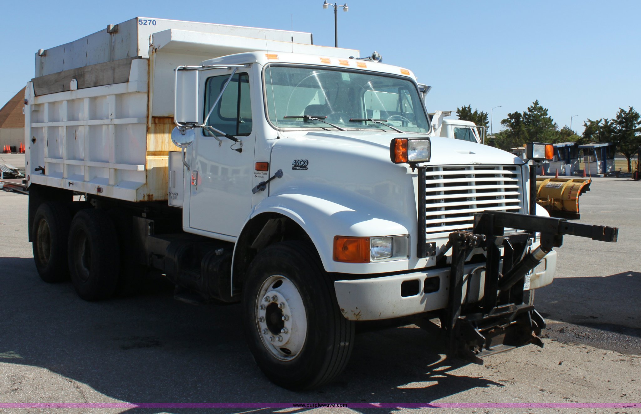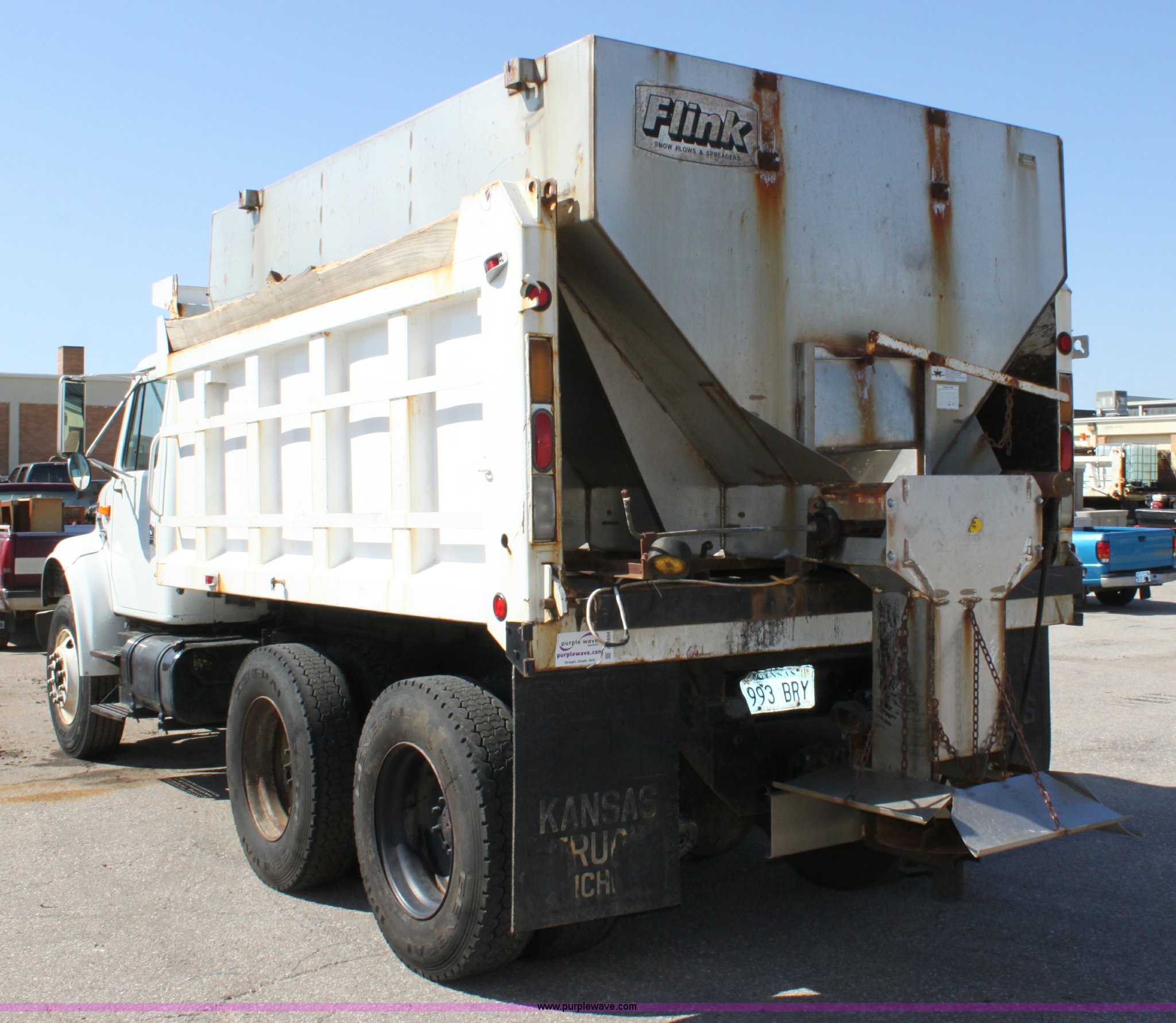 Purple Wave is selling a used Construction Dump Truck in Kansas. This item is a 2000 International F4900 tandem axle dump truck with the following: 81,490 miles on odometer, 4,772 hours on meter, Navistar DT530 8.7L diesel engine, Allison automatic transmission, AC and heat, AM/FM/Cassette, Heated mirrors, Cruise, Power windows, Suspension seat, Chelsea PTO, Locking power divider, Prodigy brake controller, Force spreader controls, In-cab plow controls, Air operated end gate, Flink stainless steel spreader, Air brakes, Rear hydraulic remotes, Pintle hitch, Trailer wiring, 295/75R22.5 tires, Motorola radio not included, Equip# 2046