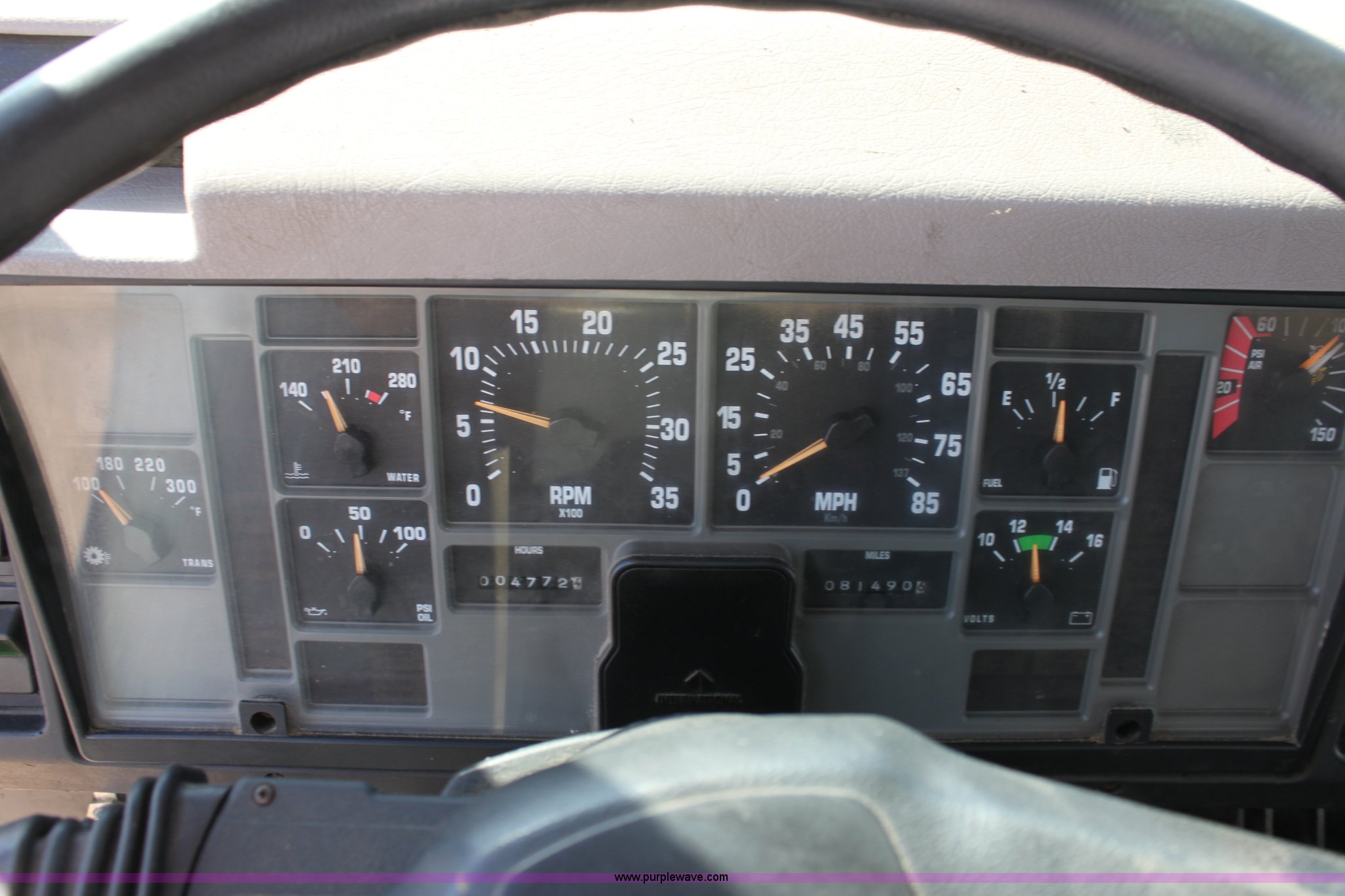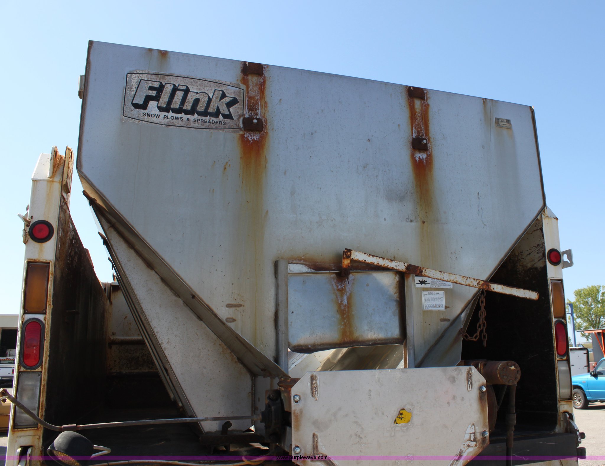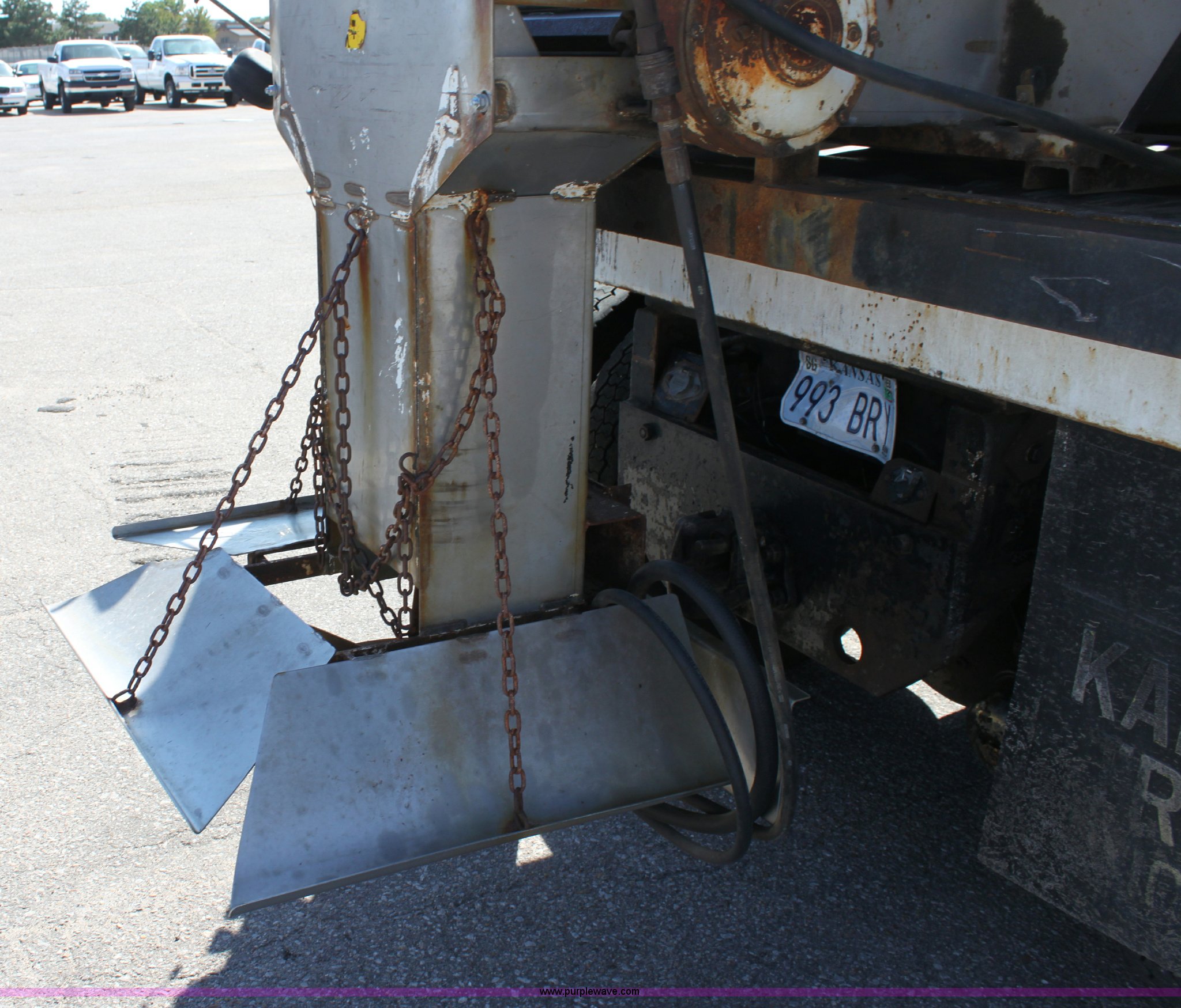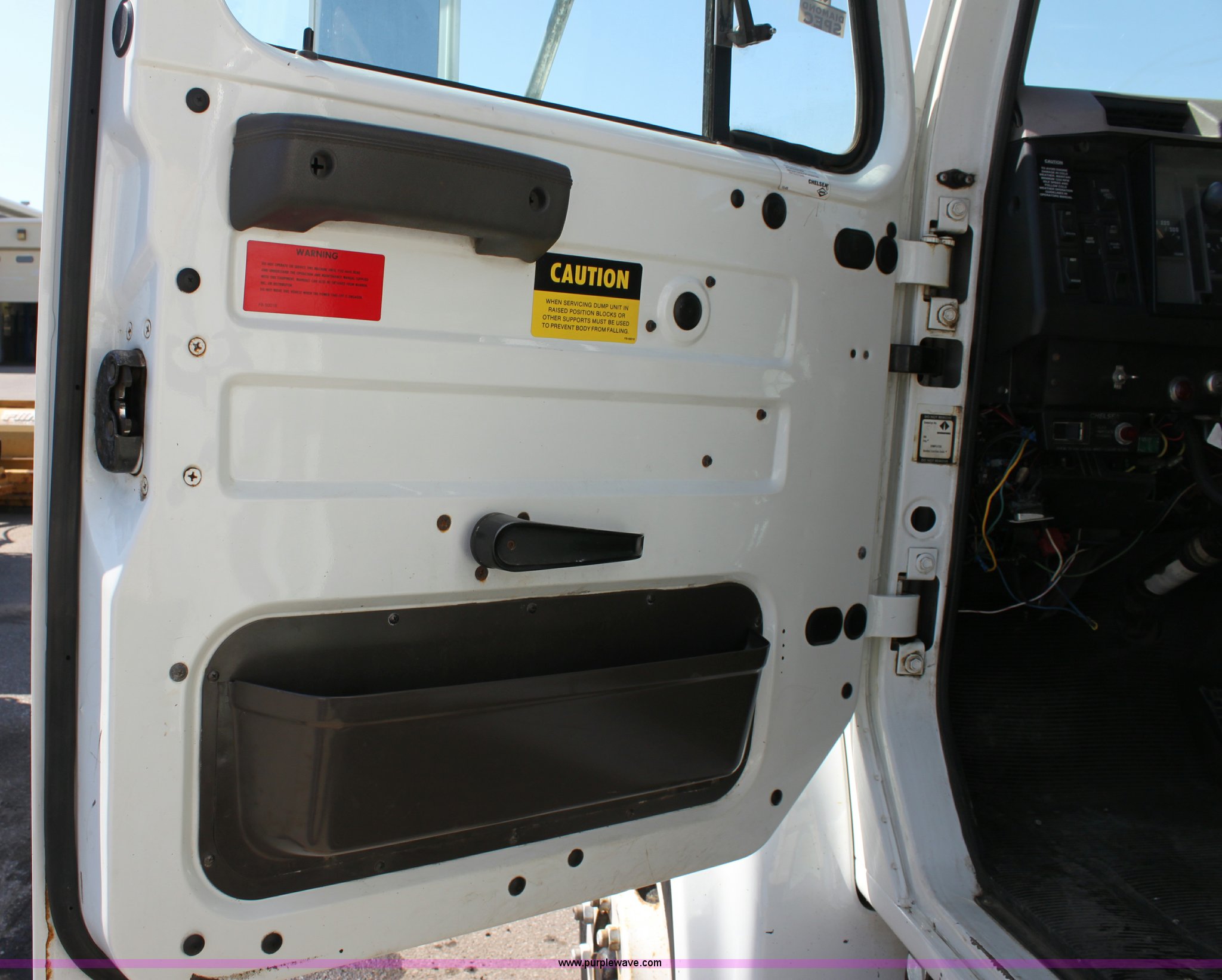 Purple Wave is selling a used Construction Dump Truck in Kansas. This item is a 2000 International F4900 tandem axle dump truck with the following: 81,490 miles on odometer, 4,772 hours on meter, Navistar DT530 8.7L diesel engine, Allison automatic transmission, AC and heat, AM/FM/Cassette, Heated mirrors, Cruise, Power windows, Suspension seat, Chelsea PTO, Locking power divider, Prodigy brake controller, Force spreader controls, In-cab plow controls, Air operated end gate, Flink stainless steel spreader, Air brakes, Rear hydraulic remotes, Pintle hitch, Trailer wiring, 295/75R22.5 tires, Motorola radio not included, Equip# 2046
