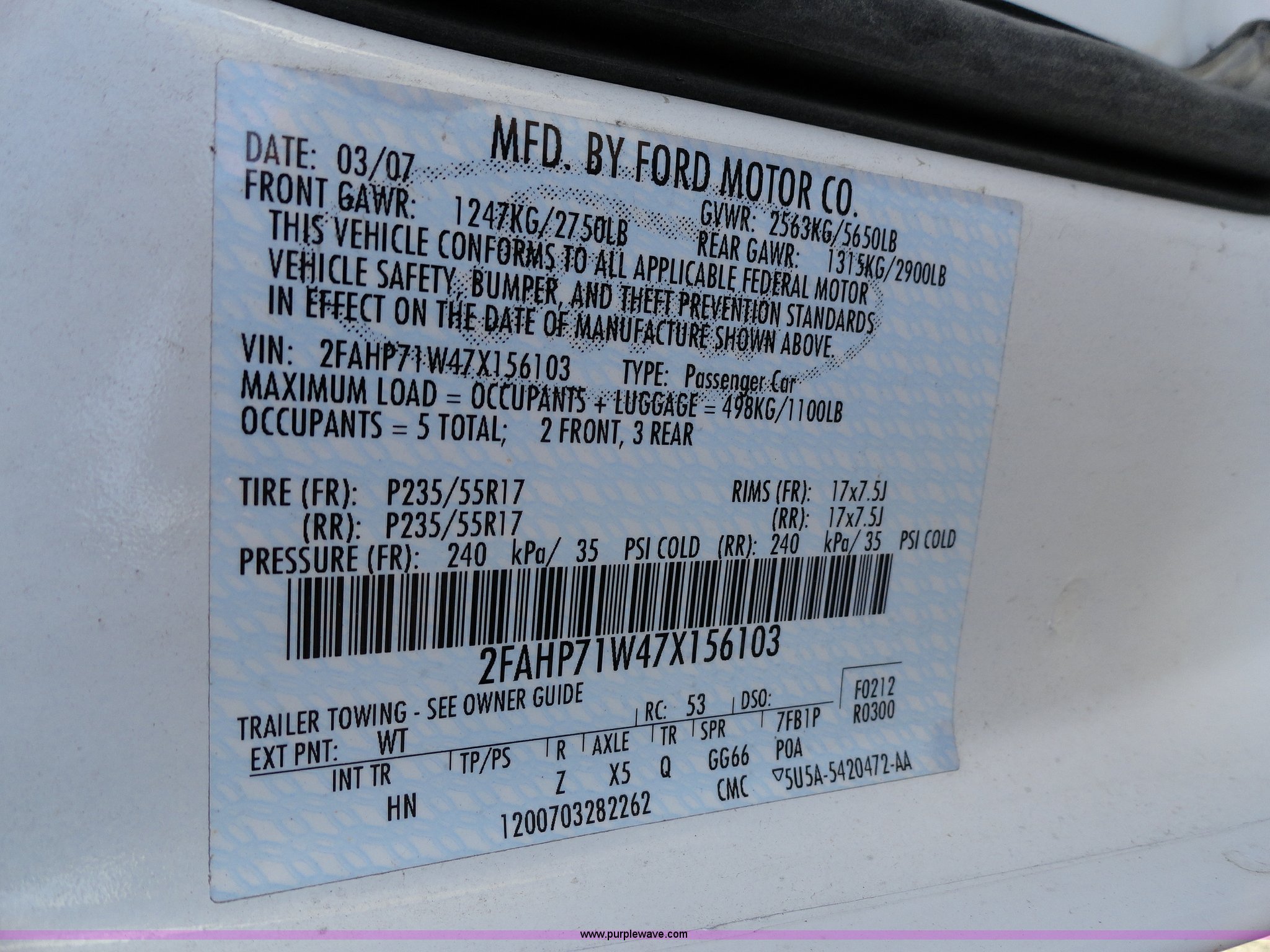 2007 Ford Crown Victoria Police Interceptor. 98,996 miles on odometer, 4.6L V8 EFI engine, Automatic transmission, AC and heat, Tilt, Cruise, AM/FM, Power windows, locks, mirrors, and seats, Cloth seats Driver seat cosmetic damage, 235/55R17 tires, Weak battery, Equip# 5961. 2FAHP71W47X156103. Shipping quotes available. Kansas Turnpike Authority. 3939 SW Topeka Blvd. Topeka, KS 66609