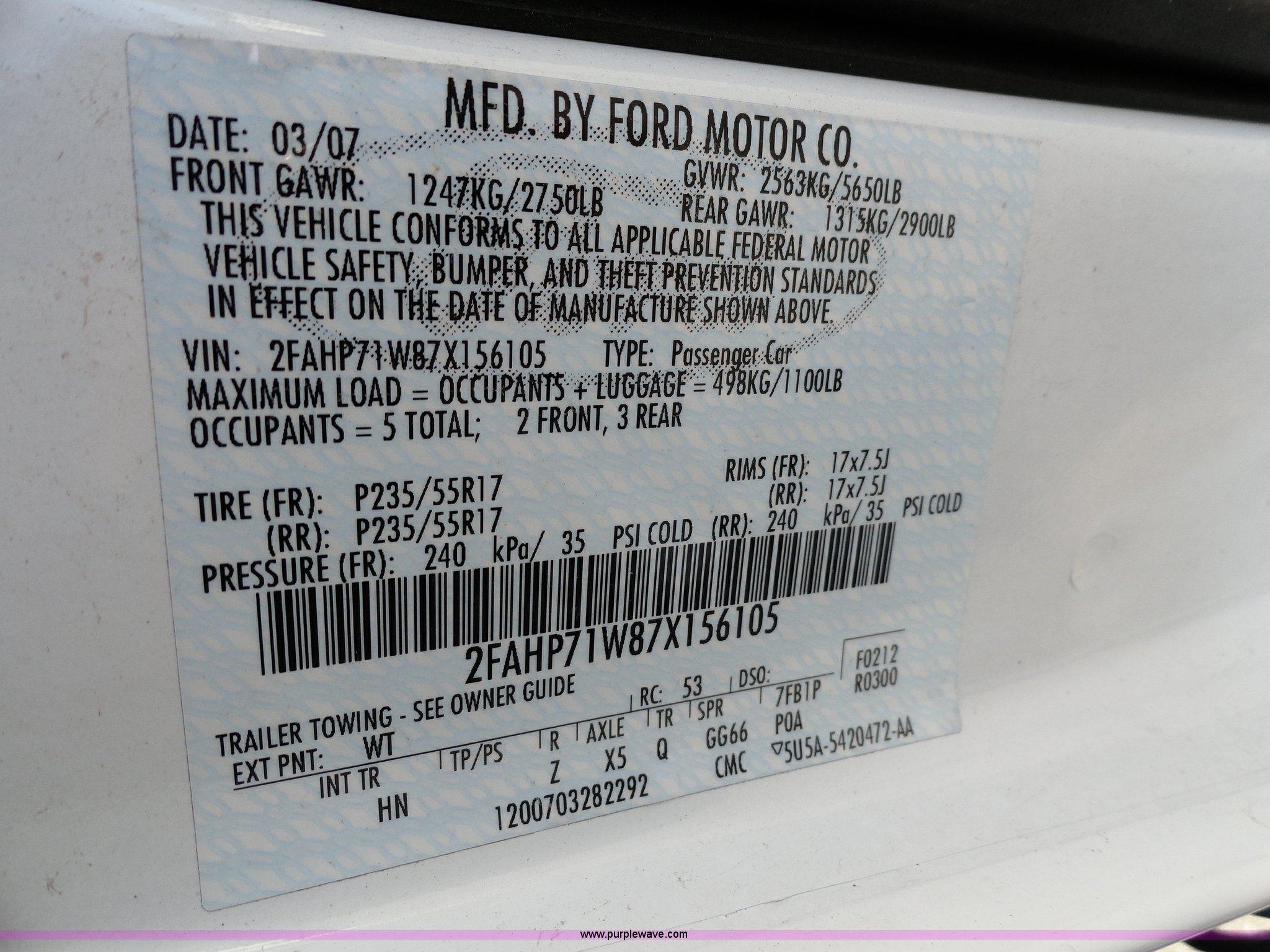 2007 Ford Crown Victoria Police Interceptor. 94,617 miles on odometer, 4.6L V8 EFI engine, Automatic transmission, AC and heat, Tilt, Cruise, AM/FM, Power windows, locks, mirrors, and seats, Cloth seats, 235/55R17 tires, Weak battery, Paint peeling, Equip# 5967. 2FAHP71W87X156105. Shipping quotes available. Kansas Turnpike Authority. 3939 SW Topeka Blvd. Topeka, KS 66609
