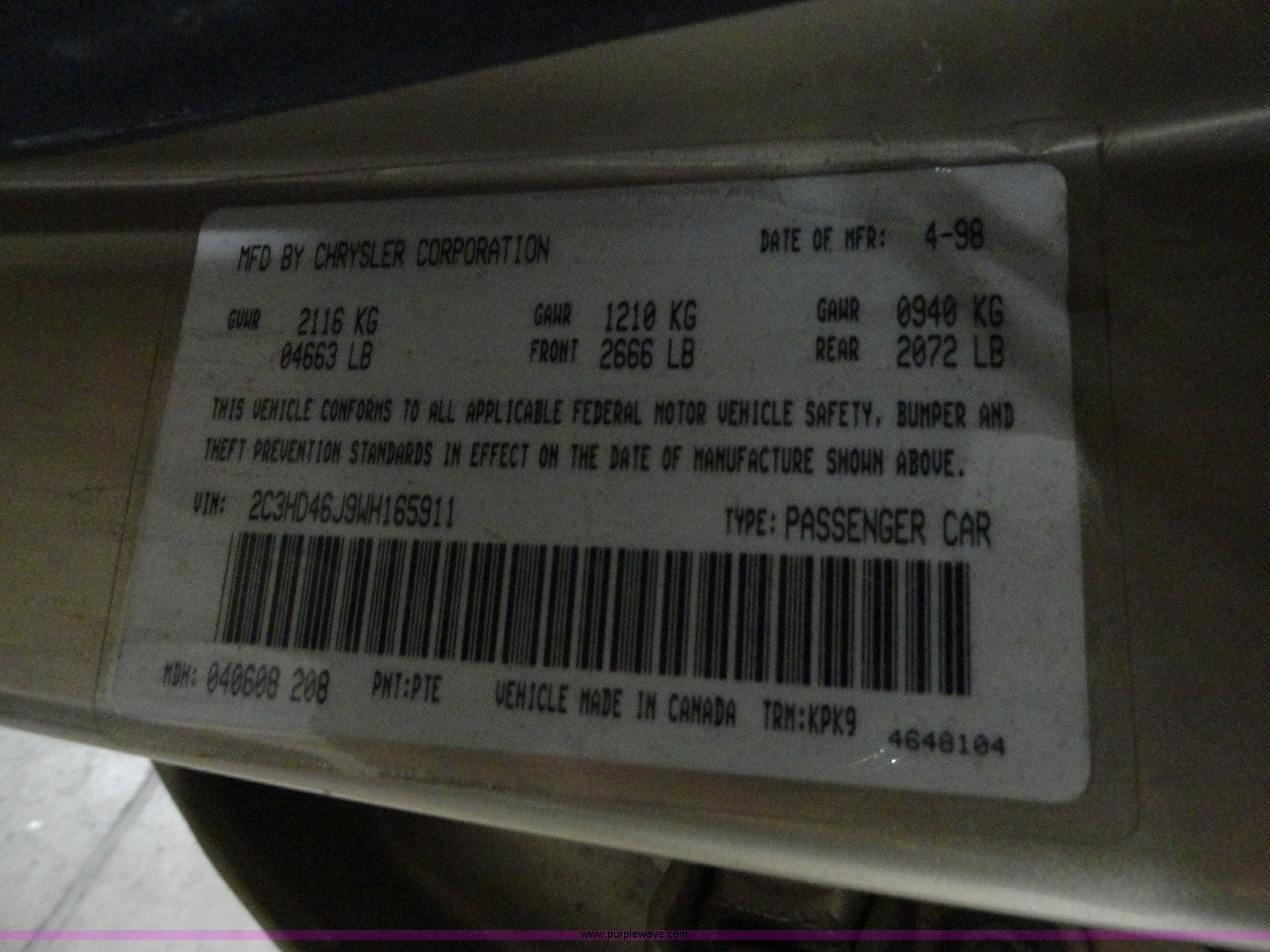 Purple Wave is selling a used Passenger Vehicle in Kansas. This item is a 1998 Chrysler Concorde LXi with the following: 92,491 miles on odometer, 3.2L V6 SFI engine, Automatic transmission, AC and heat, Tilt, Cruise, AM/FM, Power windows, locks, mirrors, and seats, Vinyl seats, Compass and temp display unit, 225/60R16 tires, Small tear in interior hood lining, Exterior scratches, Weak battery, Interior cosmetic damage