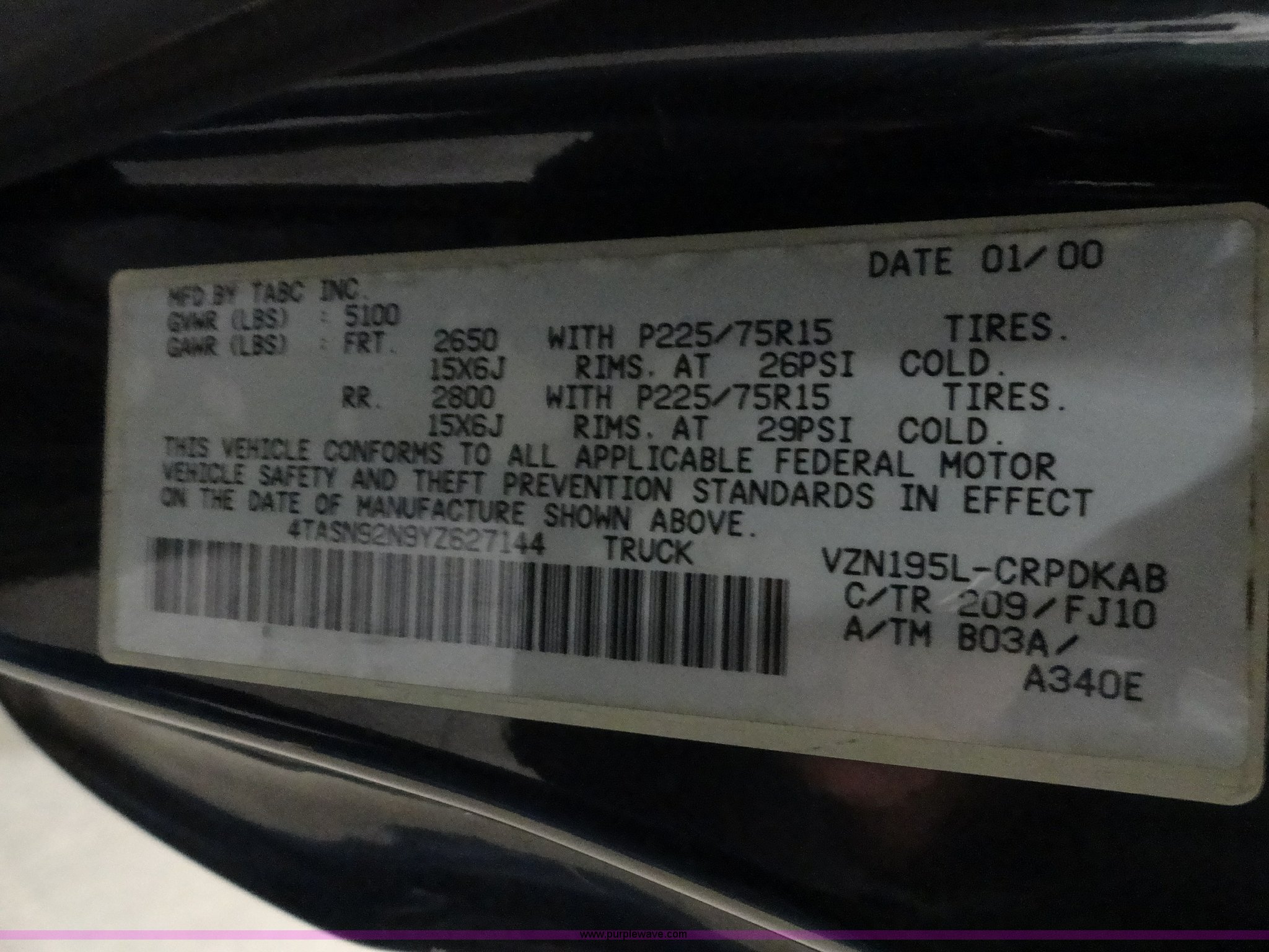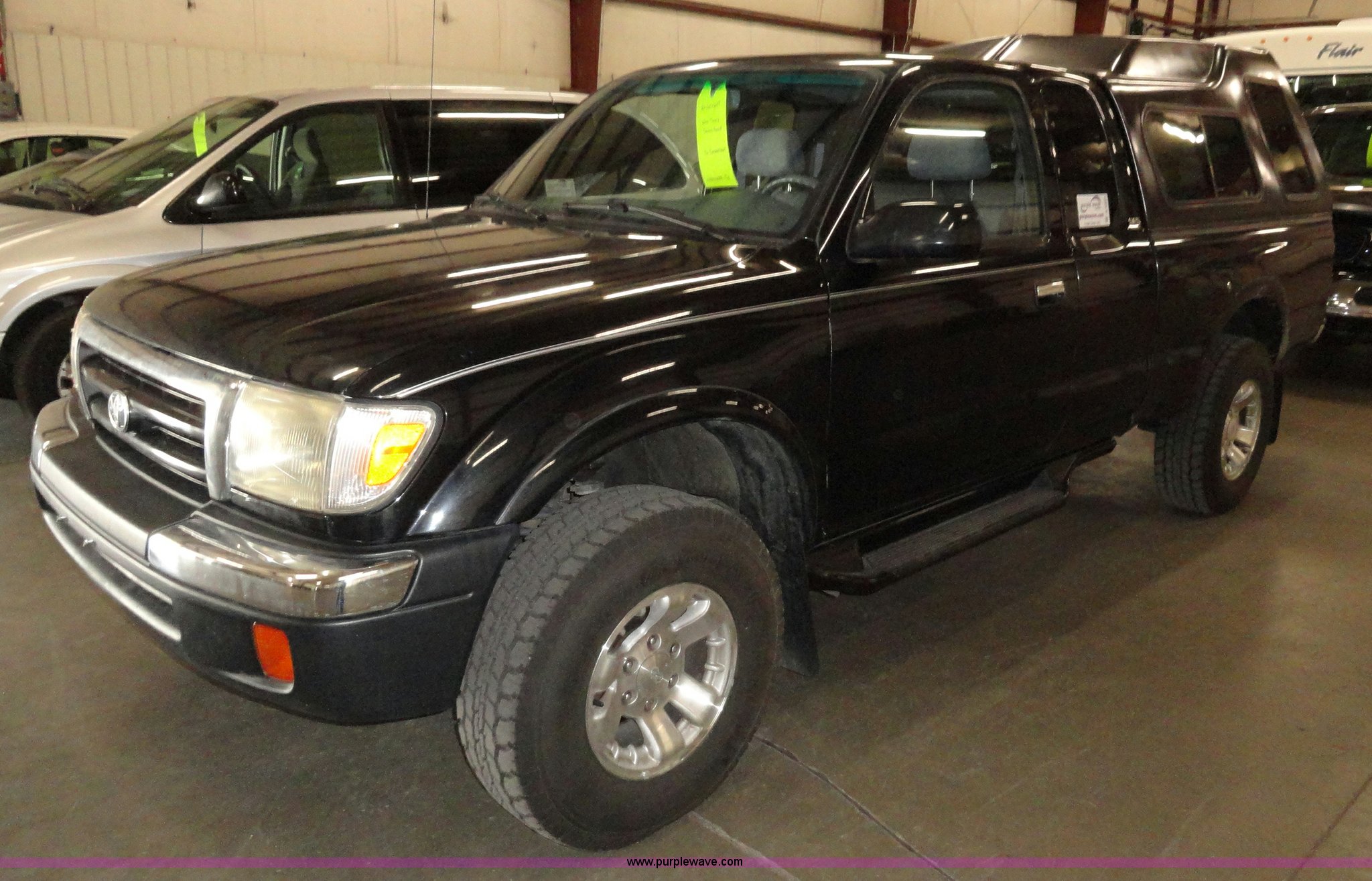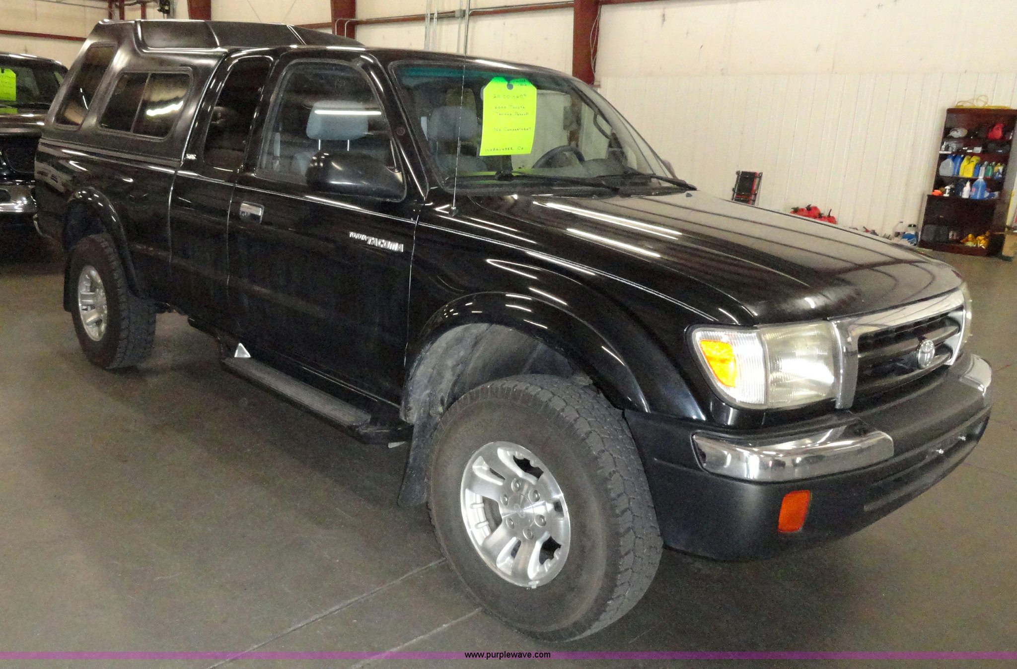 Purple Wave is selling a used Compact Pickup or Van in Kansas. This item is a 2000 Toyota Tacoma Prerunner SR5 extended cab pickup truck with the following: 142,164 miles on odometer, 3.4L V6 EFI engine, Automatic transmission, AC and heat, Tilt, AM/FM/CD, Manual windows and locks, Cloth seats, Side steps, Leer topper, Perma Guard bed liner, 30x9.50R15 tires, Weak battery