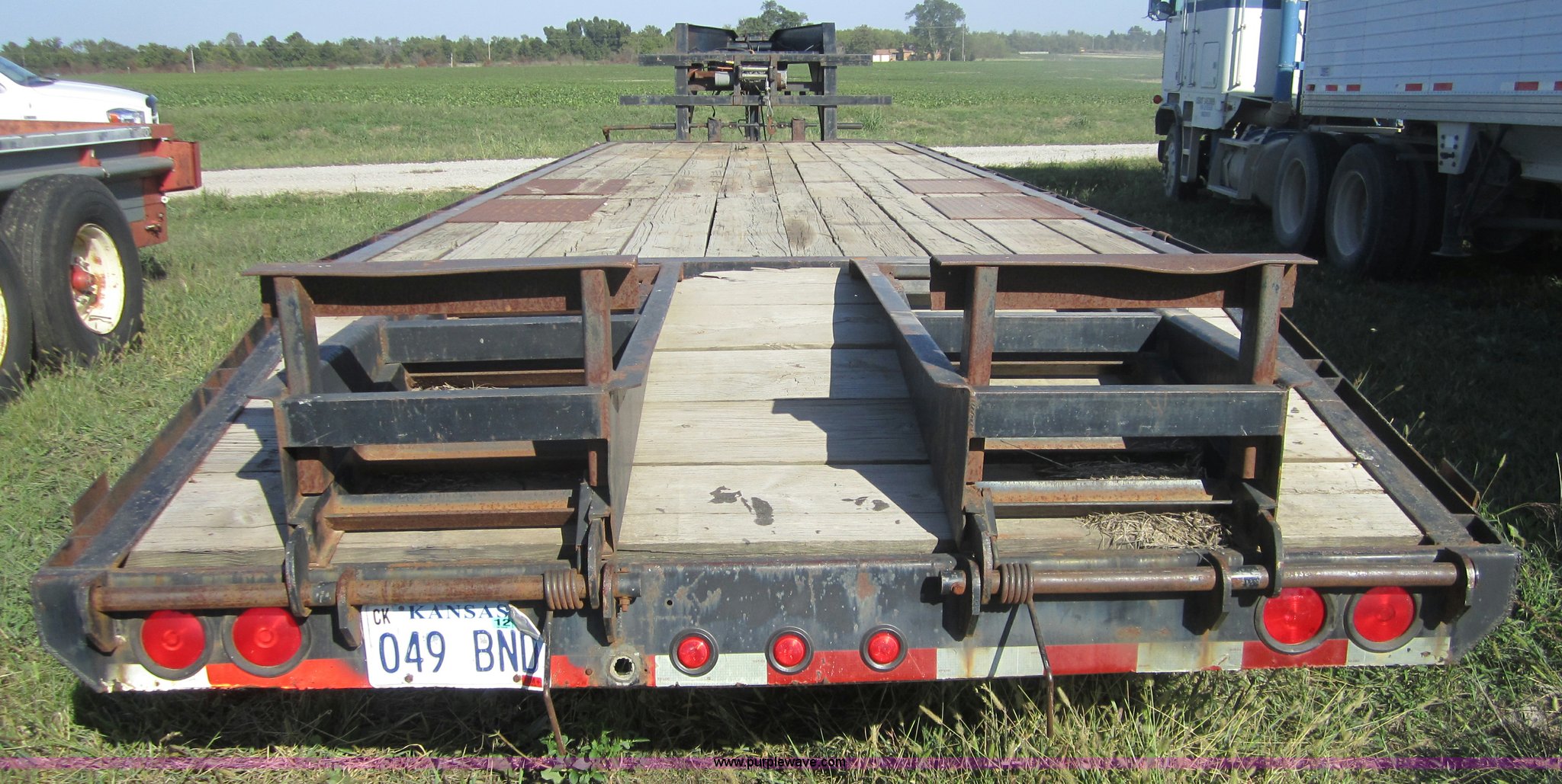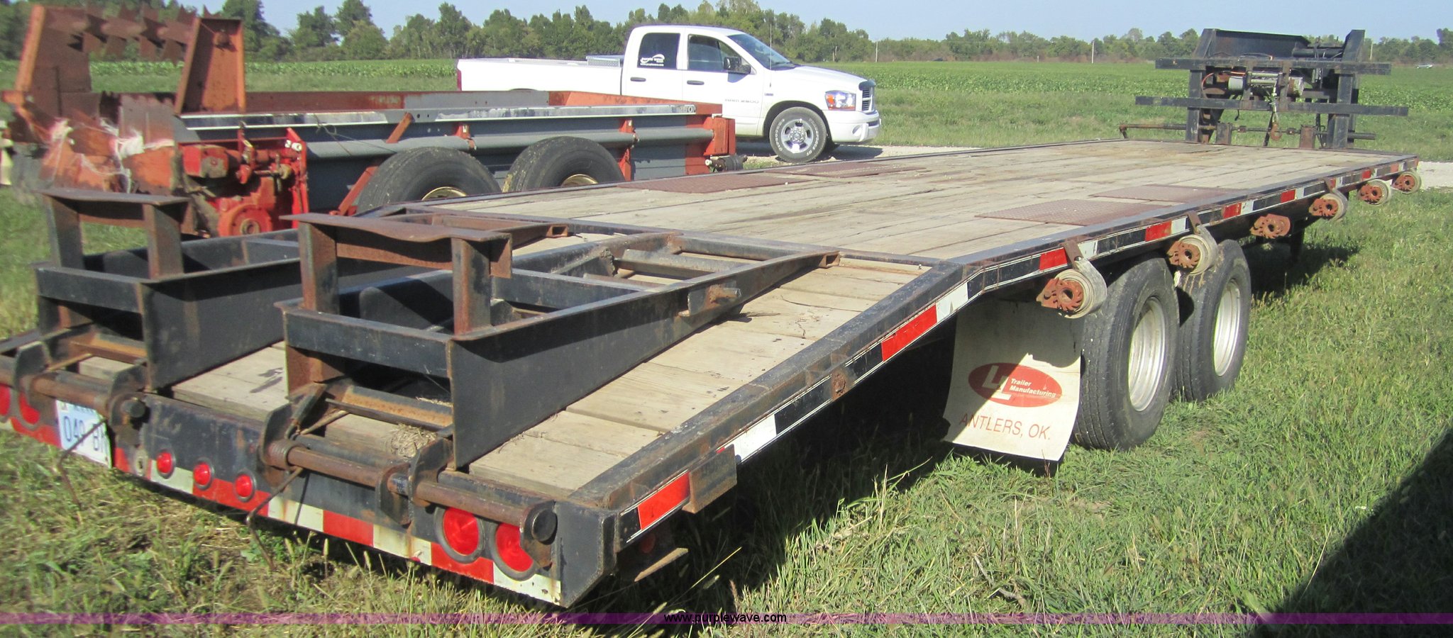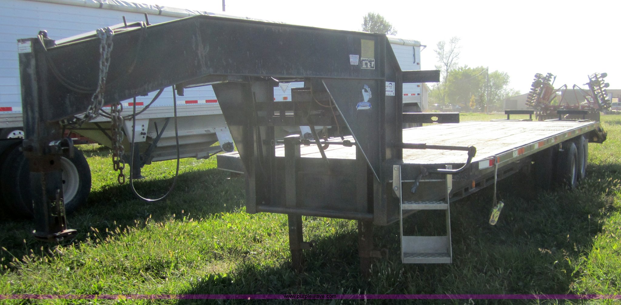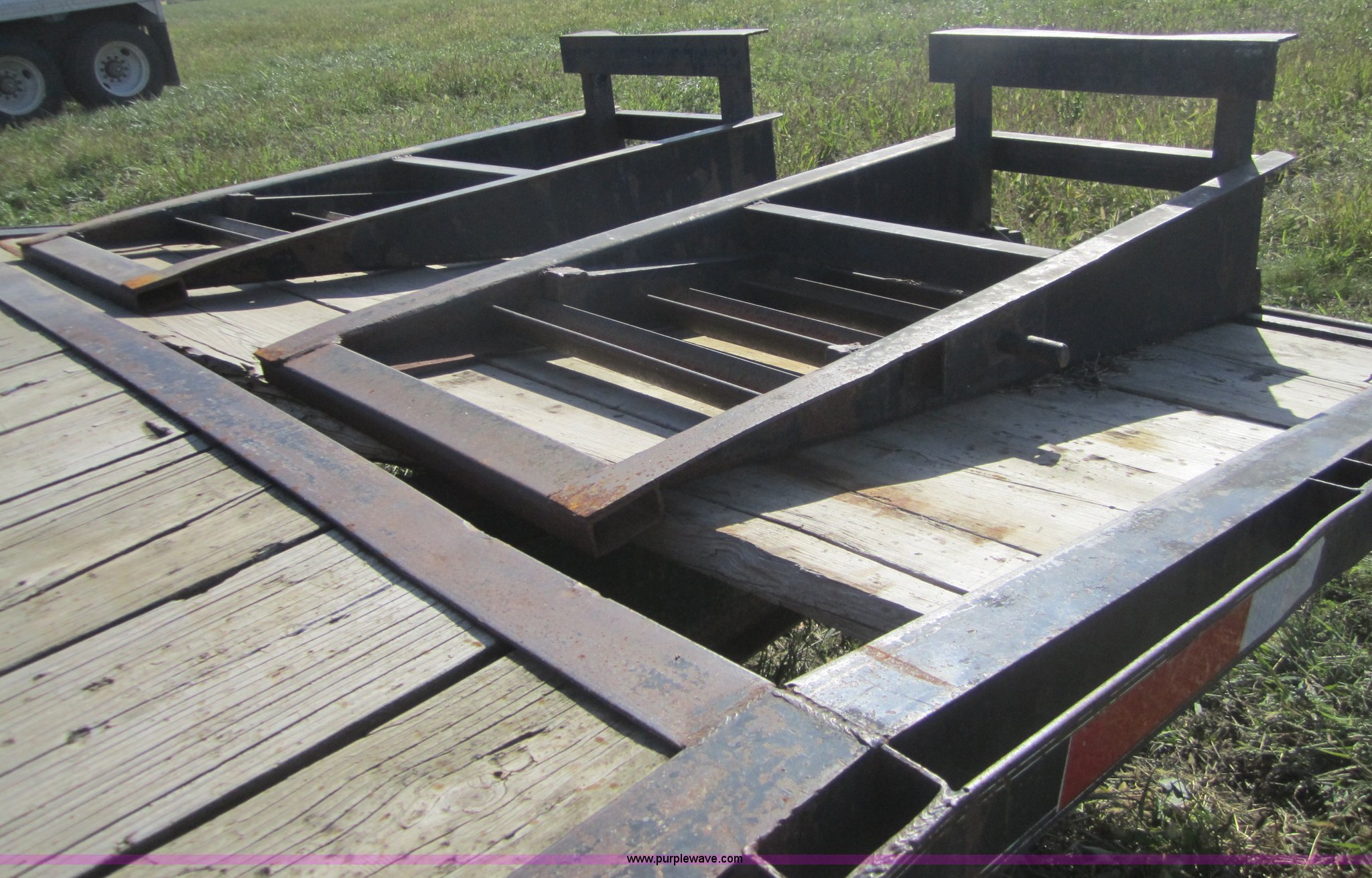 Purple Wave is selling a used Equip. Trailer in Kansas. This item is a 1999 Texas Bragg 30' flatbed trailer with the following: 25' deck, 5' dove tail, 96" width, Dual folding ramps, Wood deck, Dual 10,000 lb axles, GVWR 20,000 lbs, 7.50R16 tires