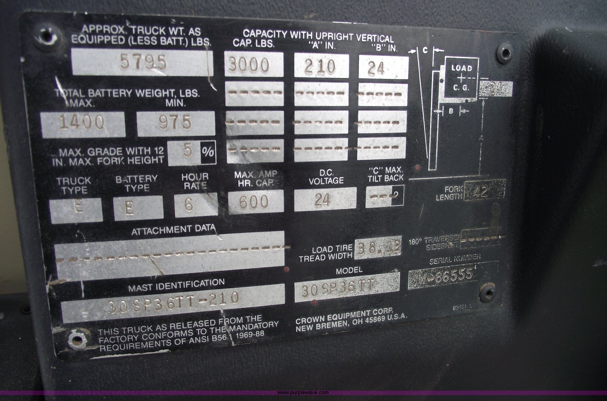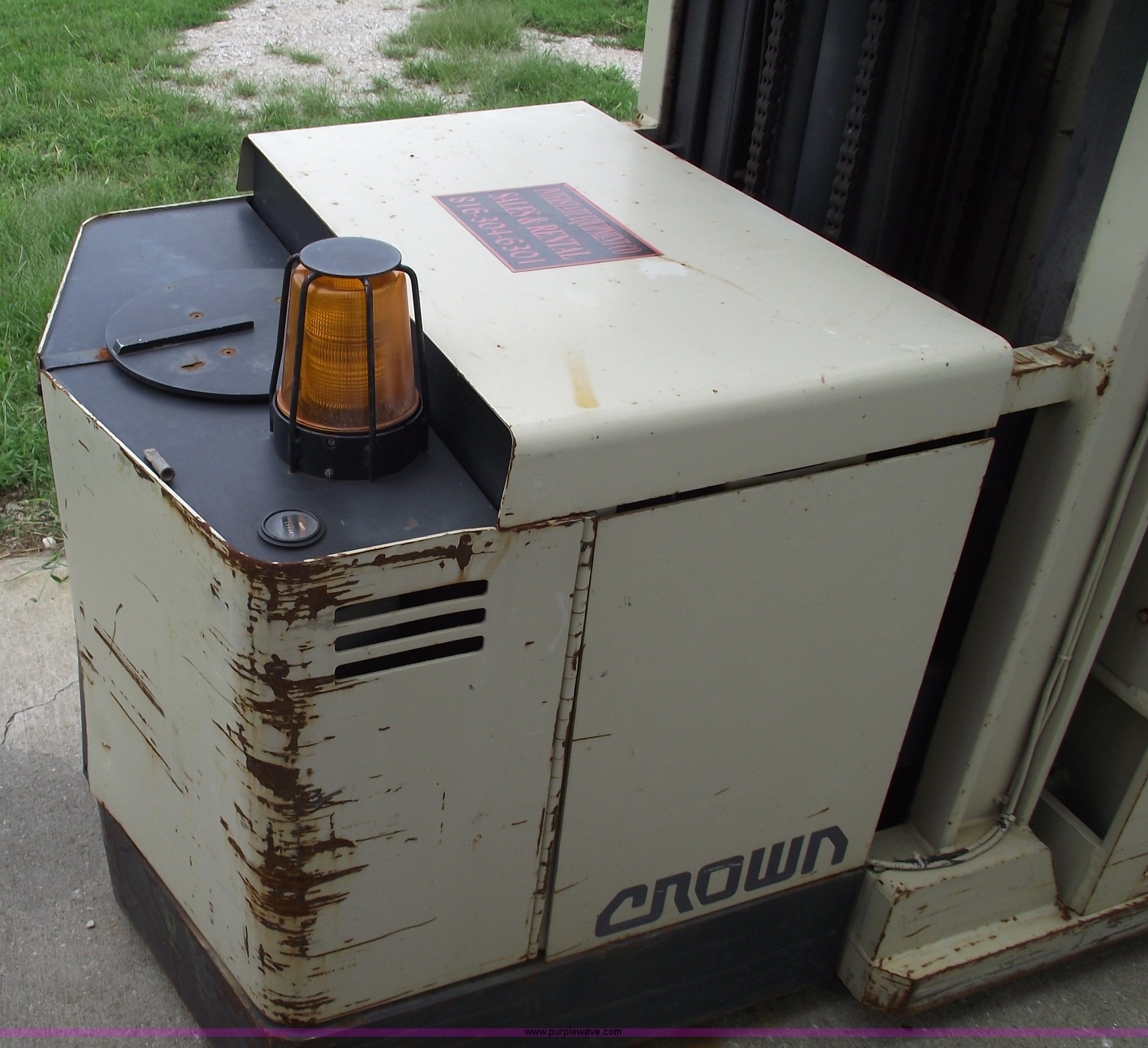 Purple Wave is selling a used Warehouse Forklift in Missouri. This item is a Crown stand-up forklift with the following: 7,729 hours on meter, 3,000 lb capacity, 210" lift height, 42" forks, Over head protection, Yellow beacon, Exide battery, Trunk type E, Battery type E, 5,795 lbs. base operating weight, Model 30SP36TT, Serial W-86555