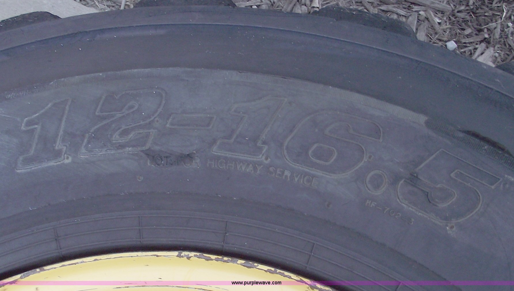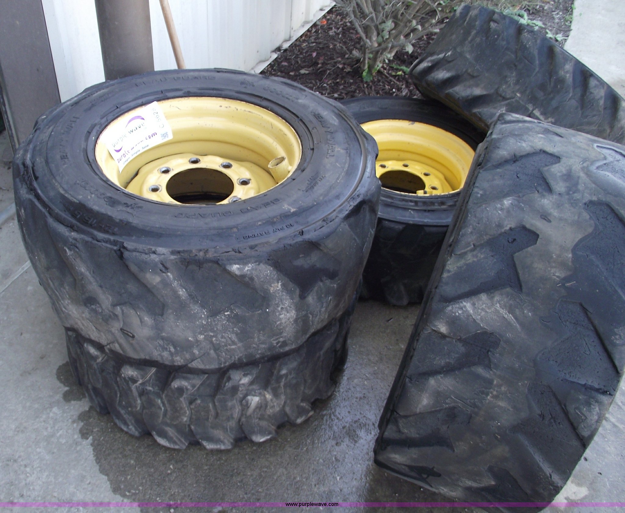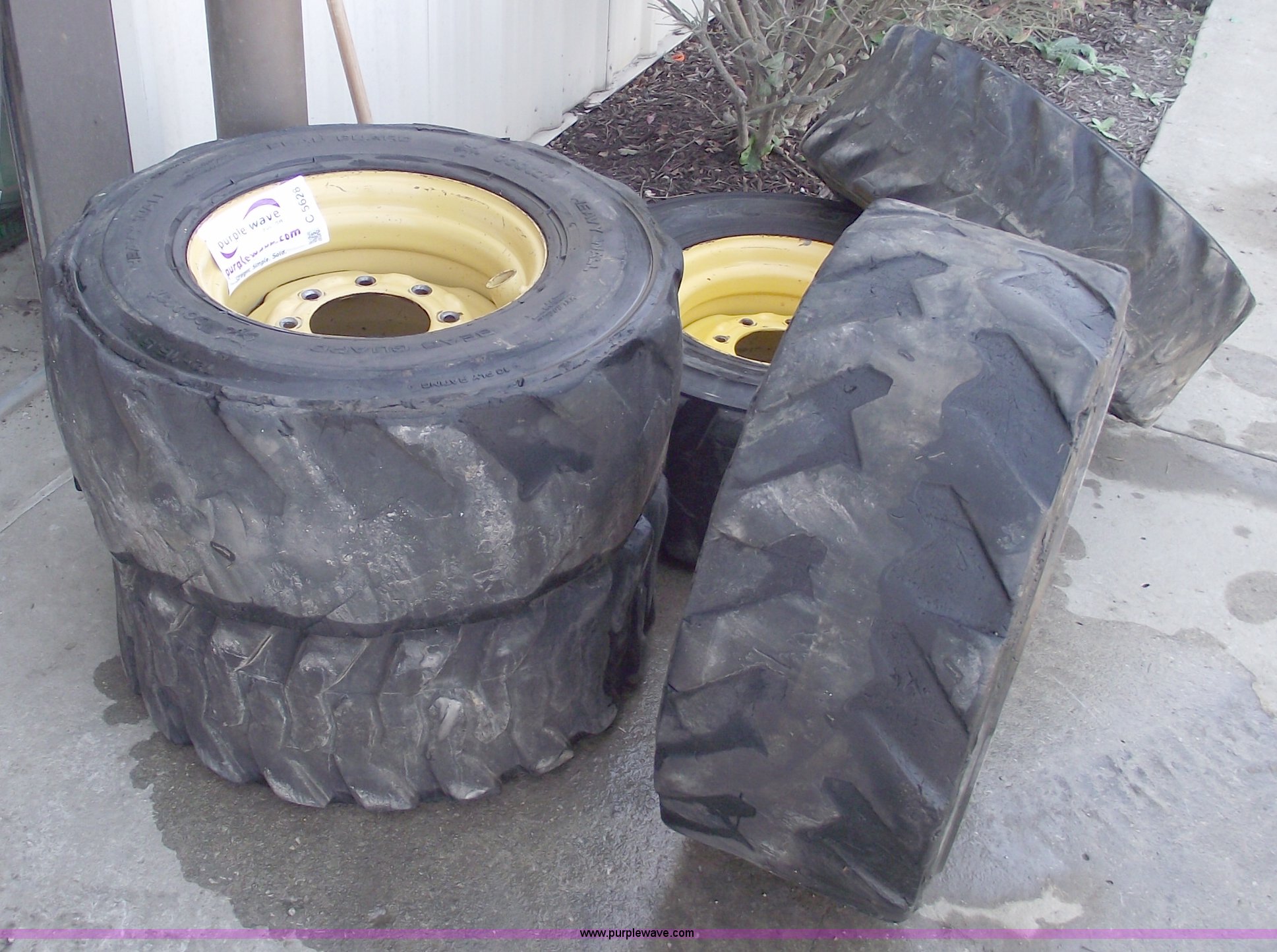 Purple Wave is selling a used Industrial Tires or Tracks in Missouri. This item is a (5) skid steer wheels and tires with the following: (4) matching 12-16.5, 12-16.5 spare with white wheel, Valve stem guards