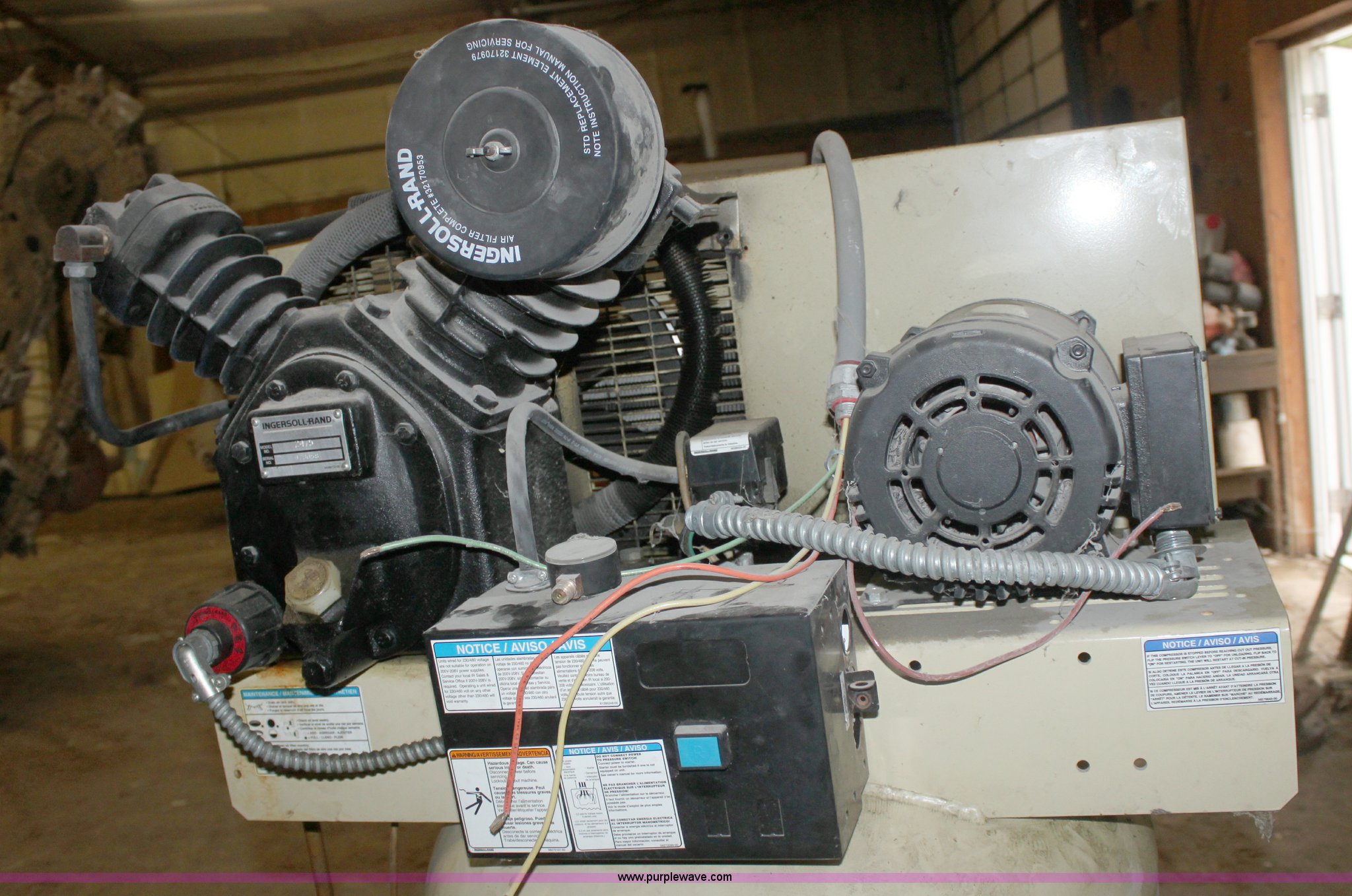 Purple Wave is selling a used Air Compressor in Kansas. This item is a Ingersoll Rand 80 gallon air compressor with the following: 5 HP three phase electric motor, Knocks, Serial 0701240008