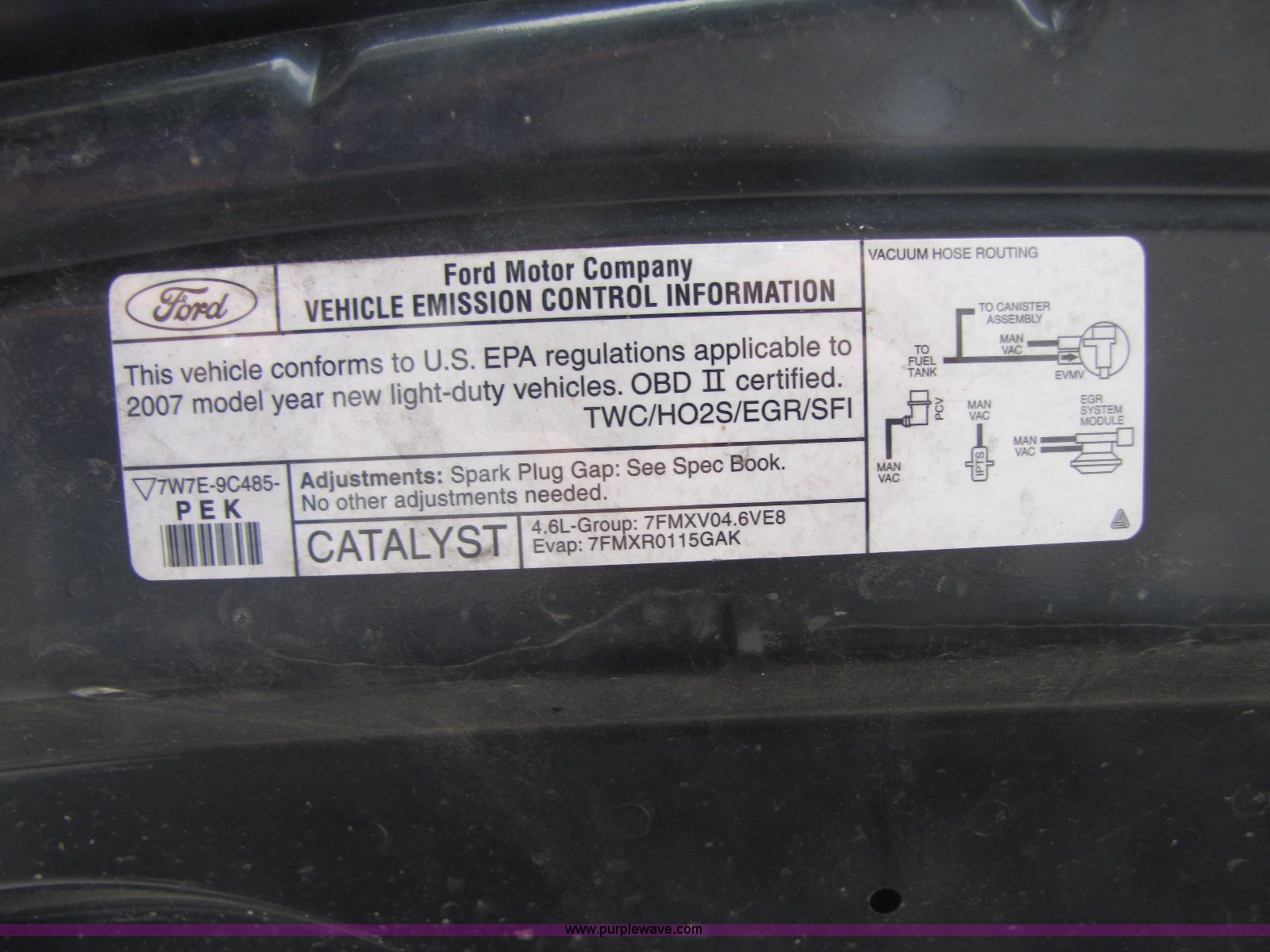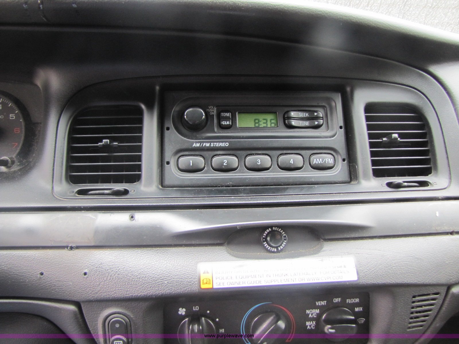 Purple Wave is selling a used Passenger Vehicle in Missouri. This item is a 2007 Ford Crown Victoria Police Interceptor with the following: 104,062 miles on odometer, 4.6L V8 EFI engine, Automatic transmission, AC and heat, Tilt, AM/FM, Power windows, locks, and mirrors, Spotlight, 235/55R17 tires, Holes in roof, Paint chipping on drivers rear quarter panel