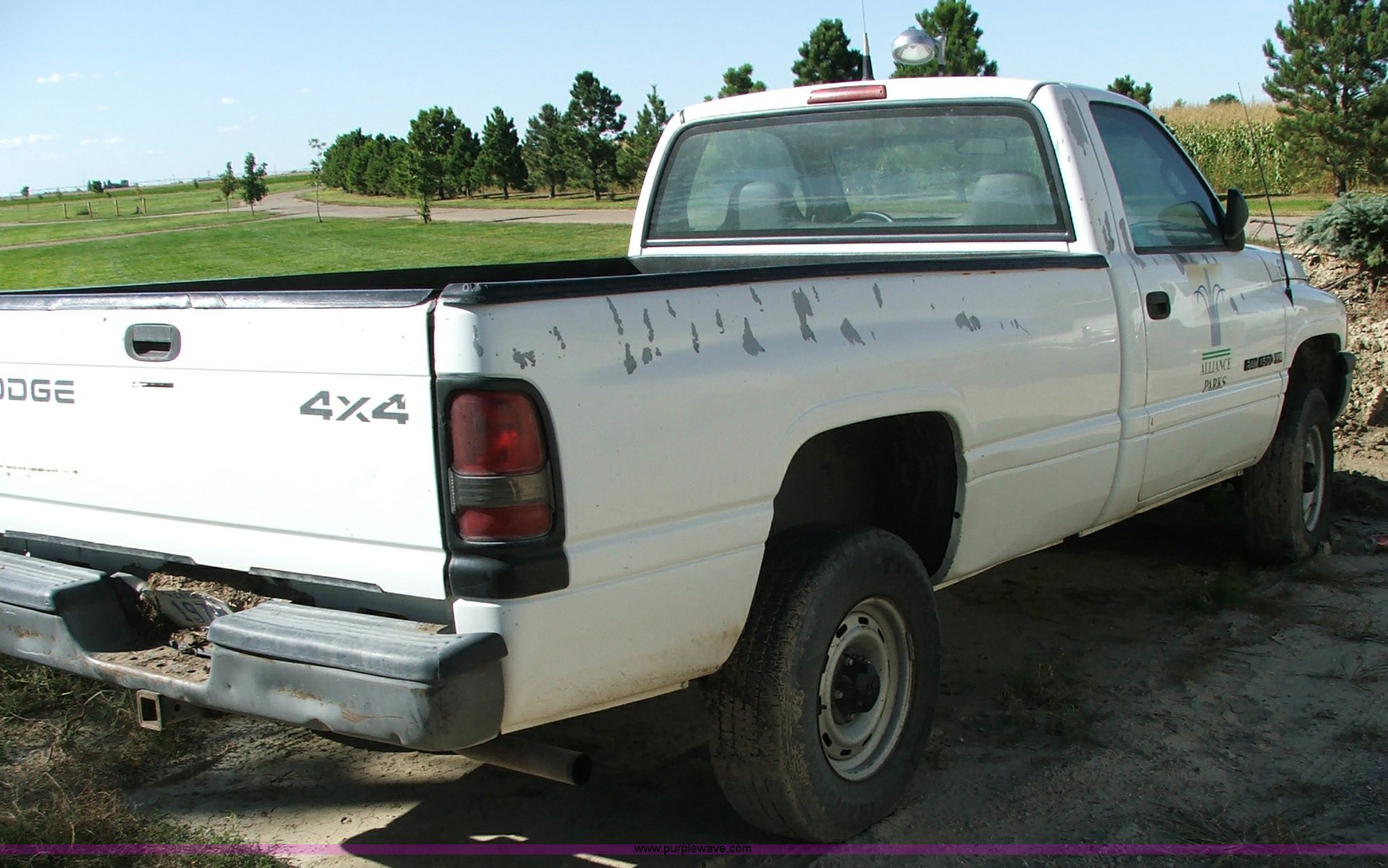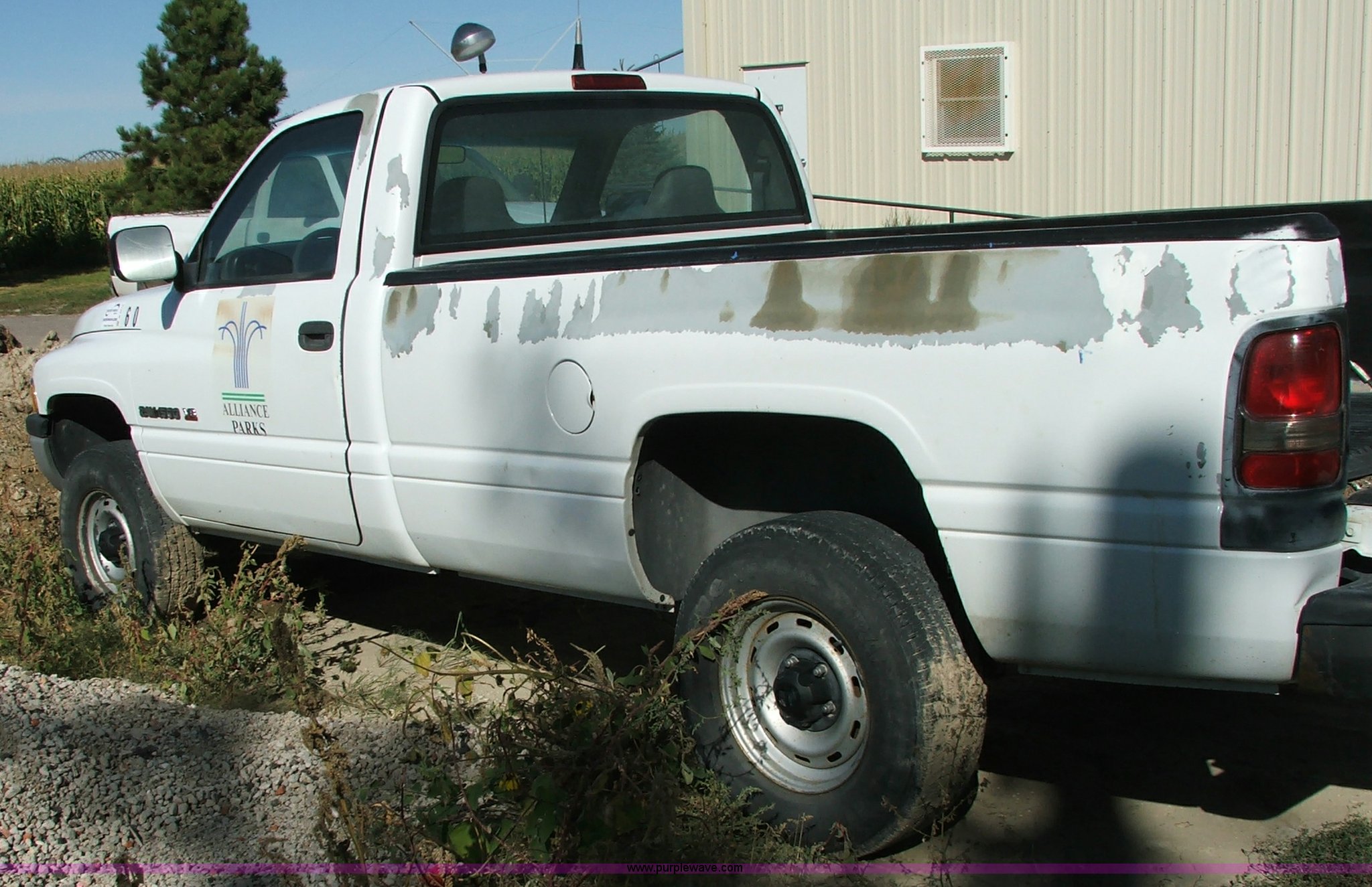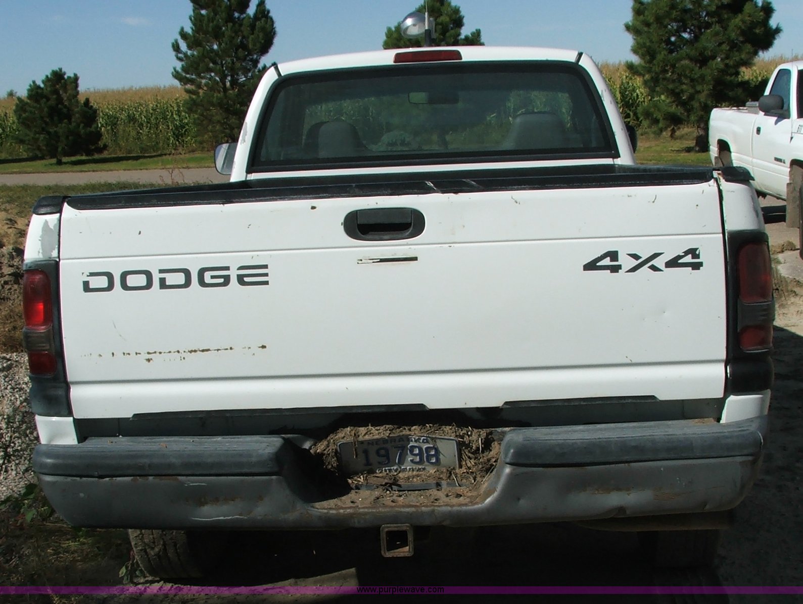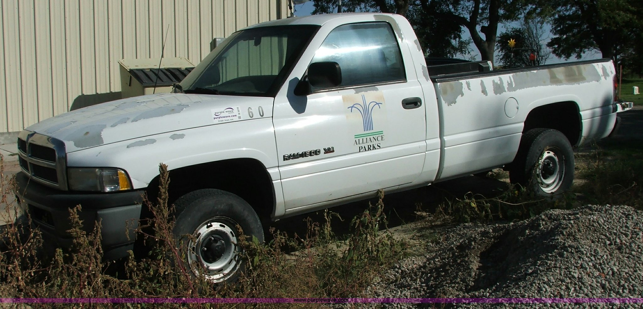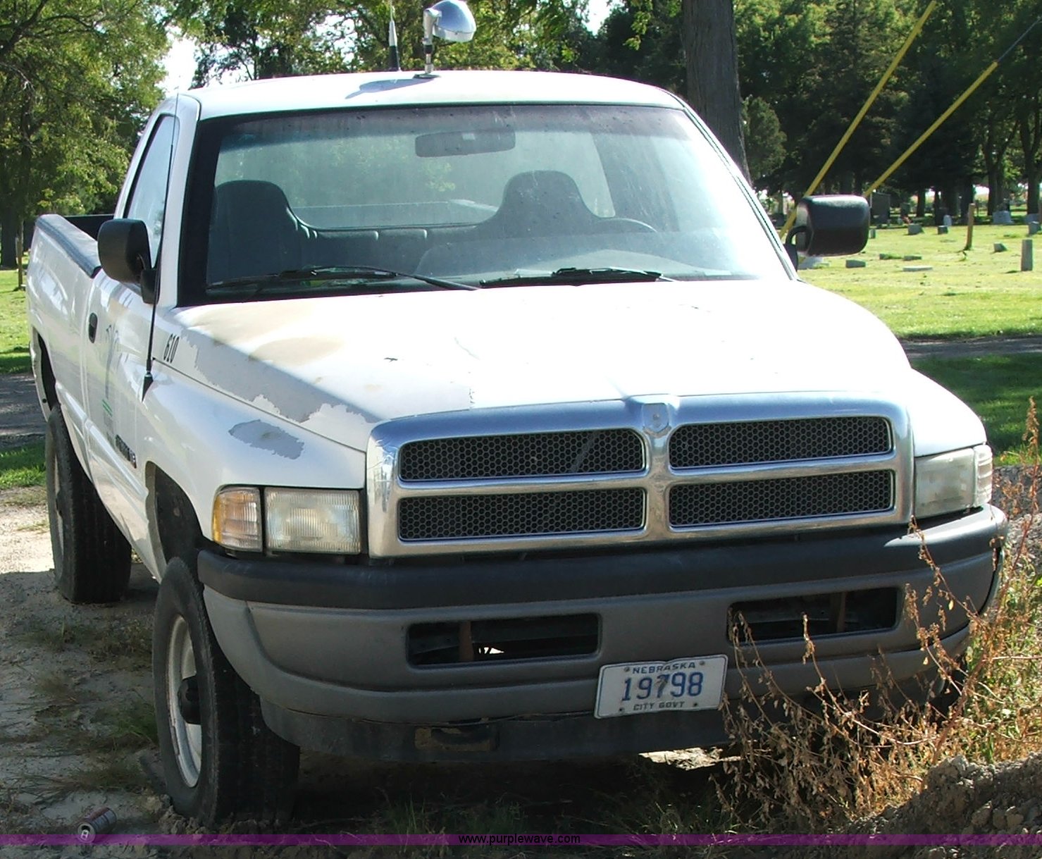 Purple Wave is selling a used Passenger Vehicle in Nebraska. This item is a 1997 Dodge Ram 1500 pickup truck with the following: 107,202 miles on odometer, 5.2L V8 MPI engine, Five speed manual transmission, Four wheel drive, 8' bed with liner, 2" receiver hitch, Firestone LT245/75R16 tires, Two-way radio not included, Spot on roof, Unit rough, Stuck in gear, ID# 610
