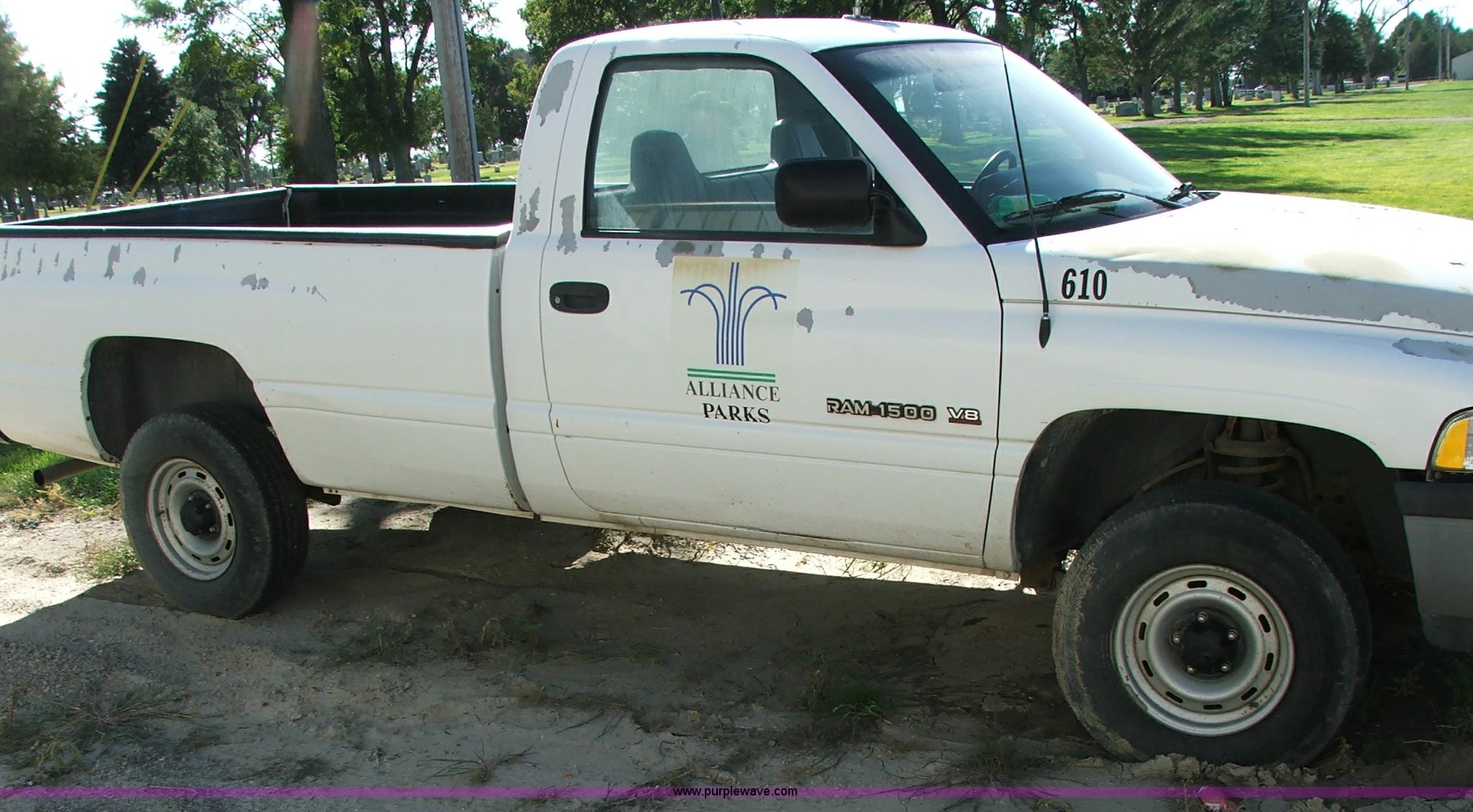 1997 Dodge Ram 1500 pickup truck. 107,202 miles on odometer, 5.2L V8 MPI engine, Five speed manual transmission, Four wheel drive, 8' bed with liner, 2" receiver hitch, Firestone LT245/75R16 tires, Two-way radio not included, Spot on roof, Unit rough, Stuck in gear, ID# 610. 1B7HF16Y0VS123278. City Of Alliance. 1313 W 1st St. Alliance, NE 69301
