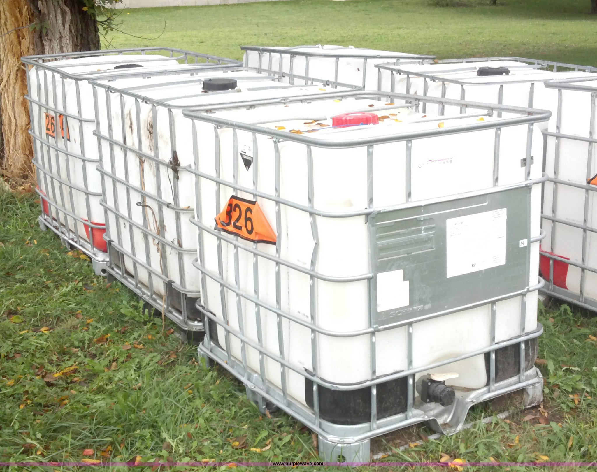 Purple Wave is selling a used Tanks in Kansas. This item is a (3) 330 gallon poly chemical tanks with the following: Empty, All have lids