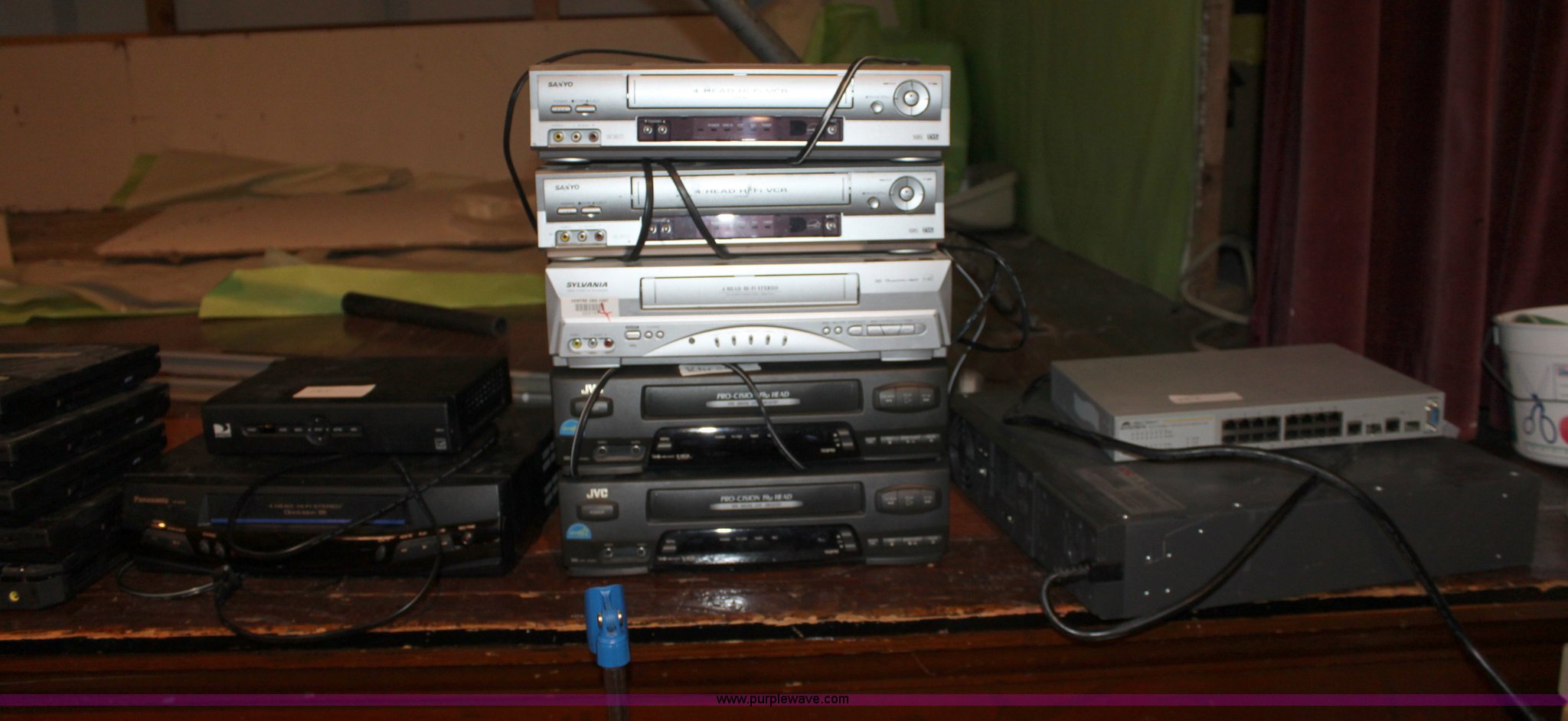 Assorted electronics. (6) VHS players, Allied Telesy 16 port network switch, APC UPS, Microphone stand, And more. USD 397. Lost Springs, KS 66859