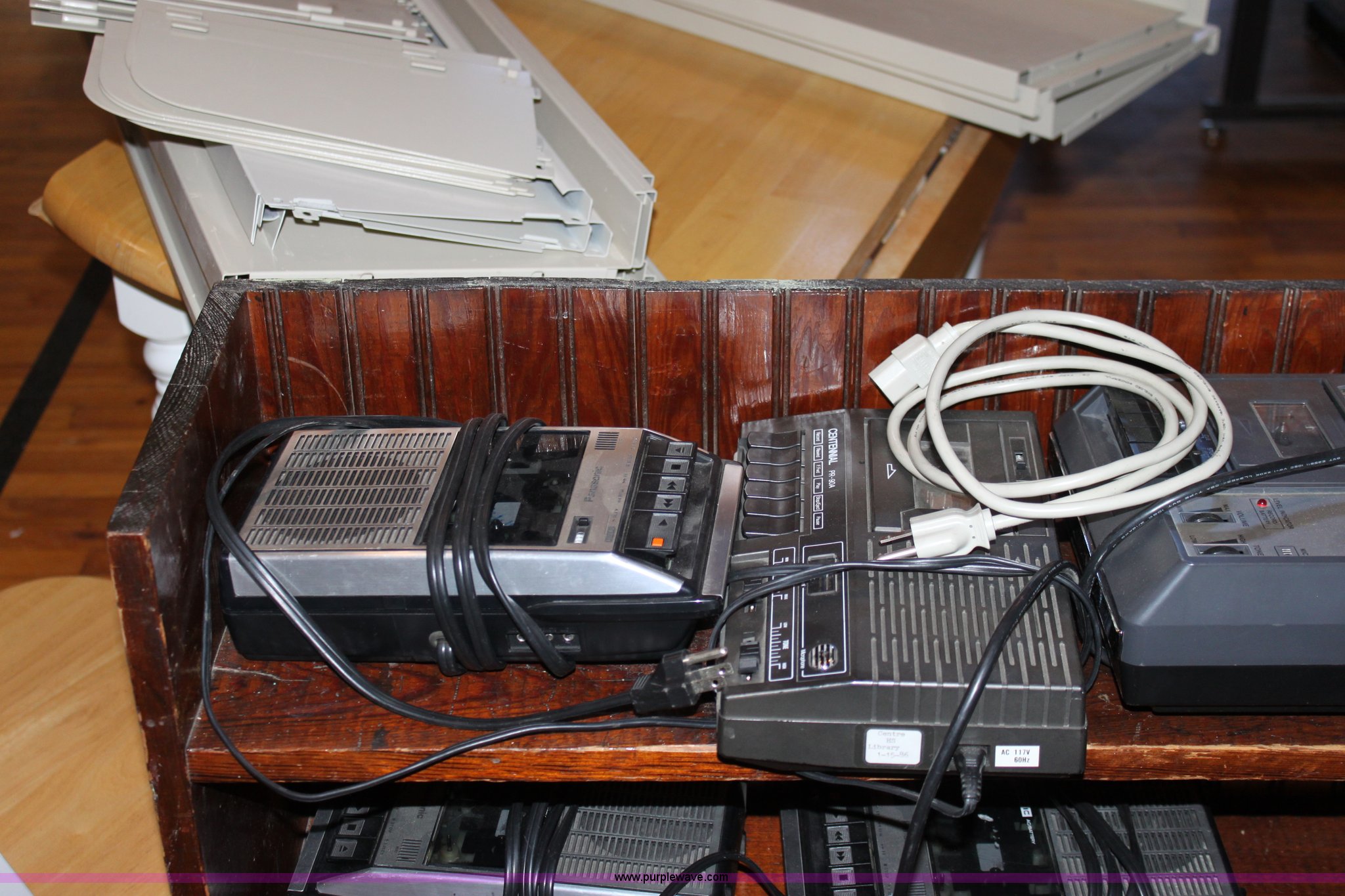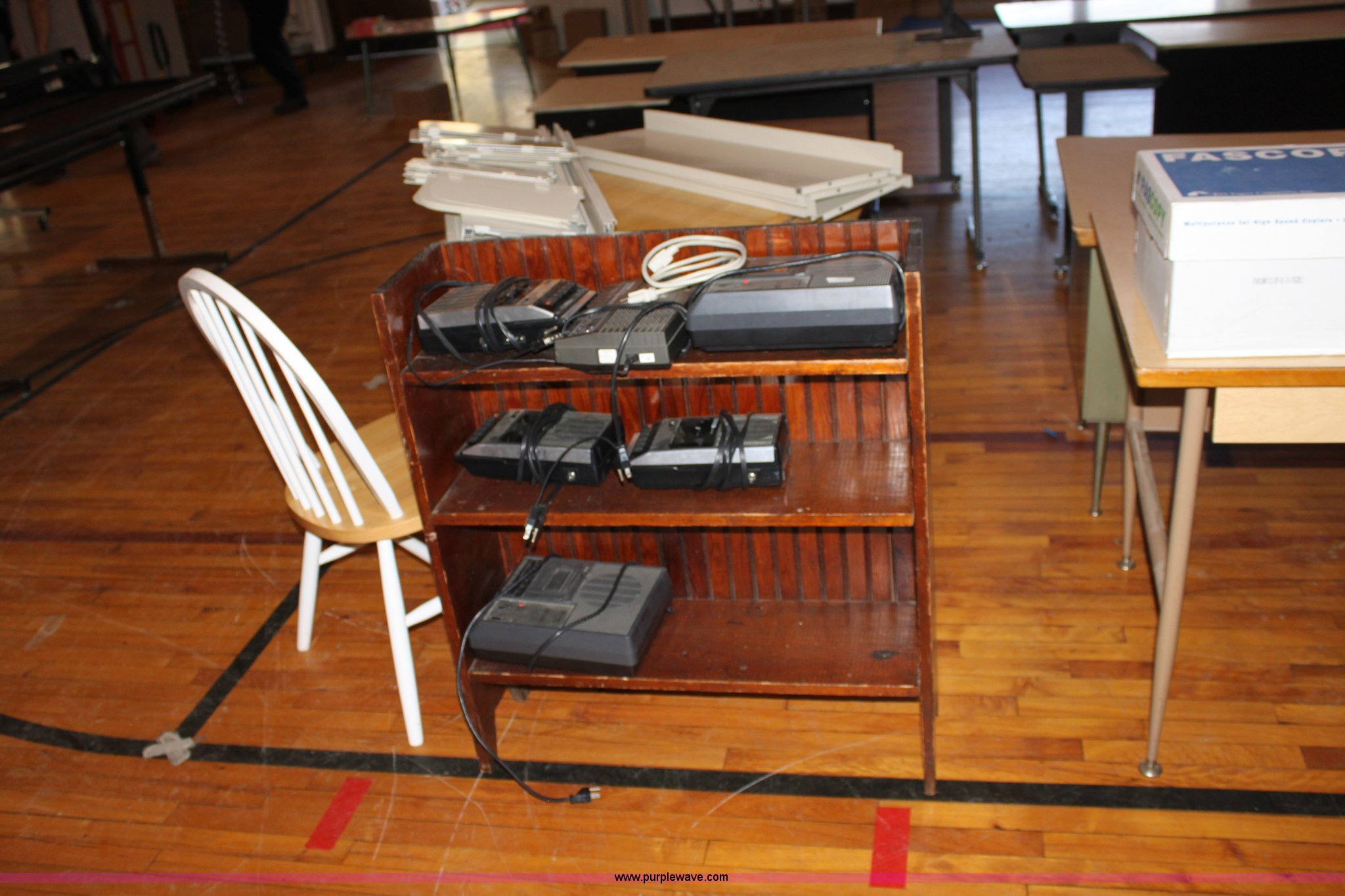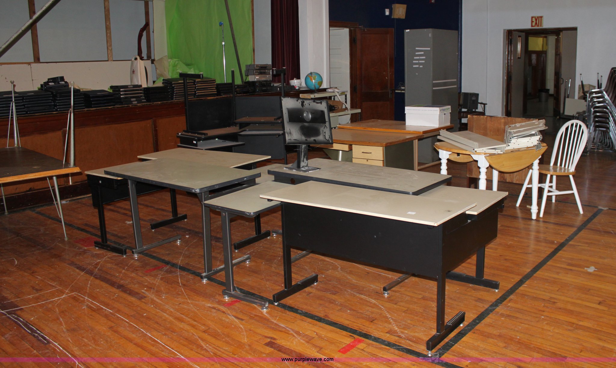 Purple Wave is selling a used Furniture in Kansas. This item is a Assorted office furniture with the following: (2) tables, (4) computer desks, (4) side tables, (2) computer desks with keyboard trays, Round table, (2) wood and metal desks, (6) cassette players, Box of VHS tapes, (8) Franklin Wordmaster electronic thesaurus, IBM typewriter, And more