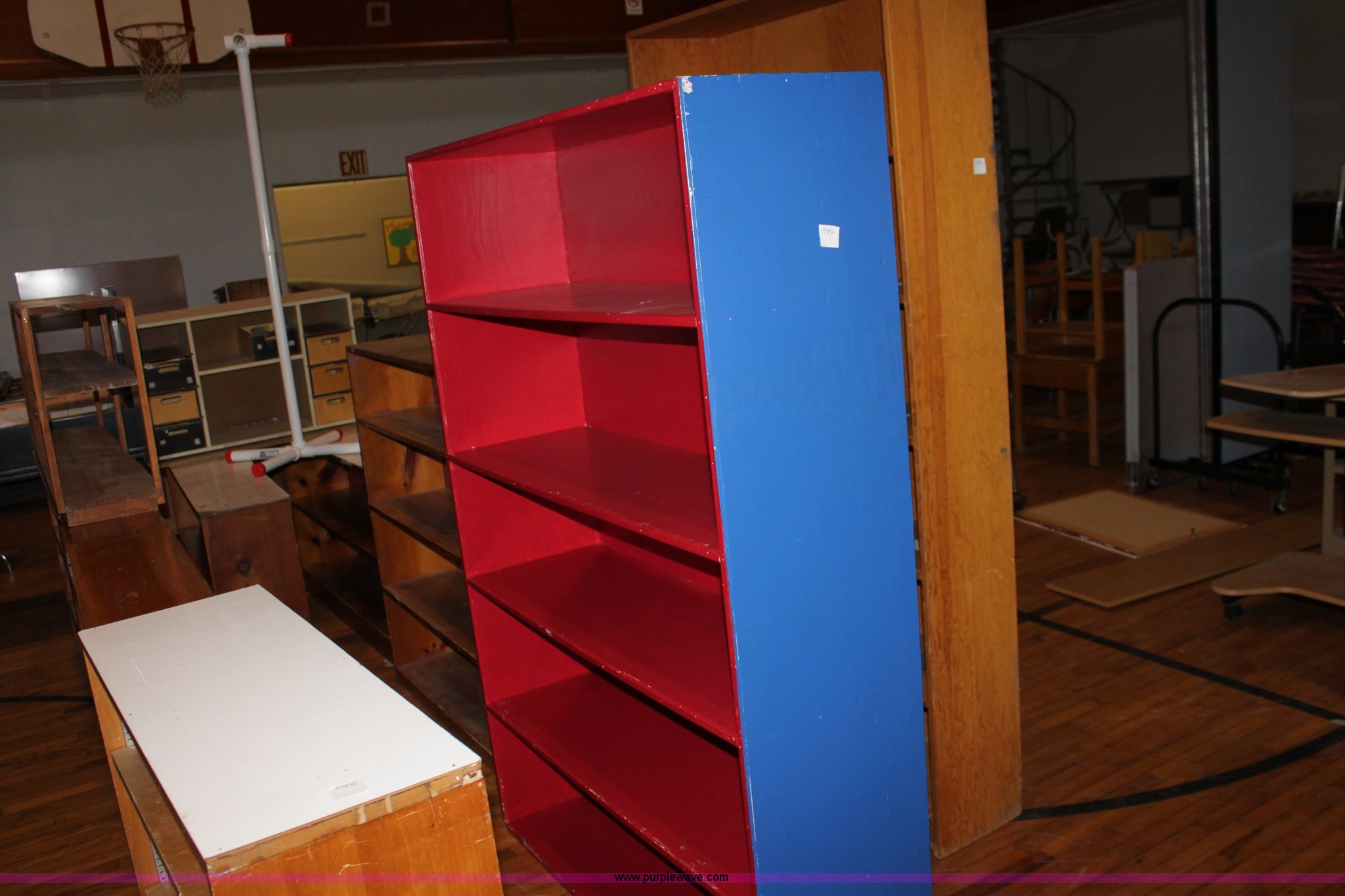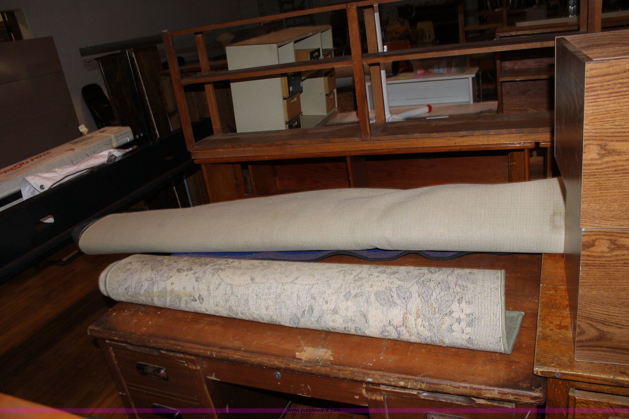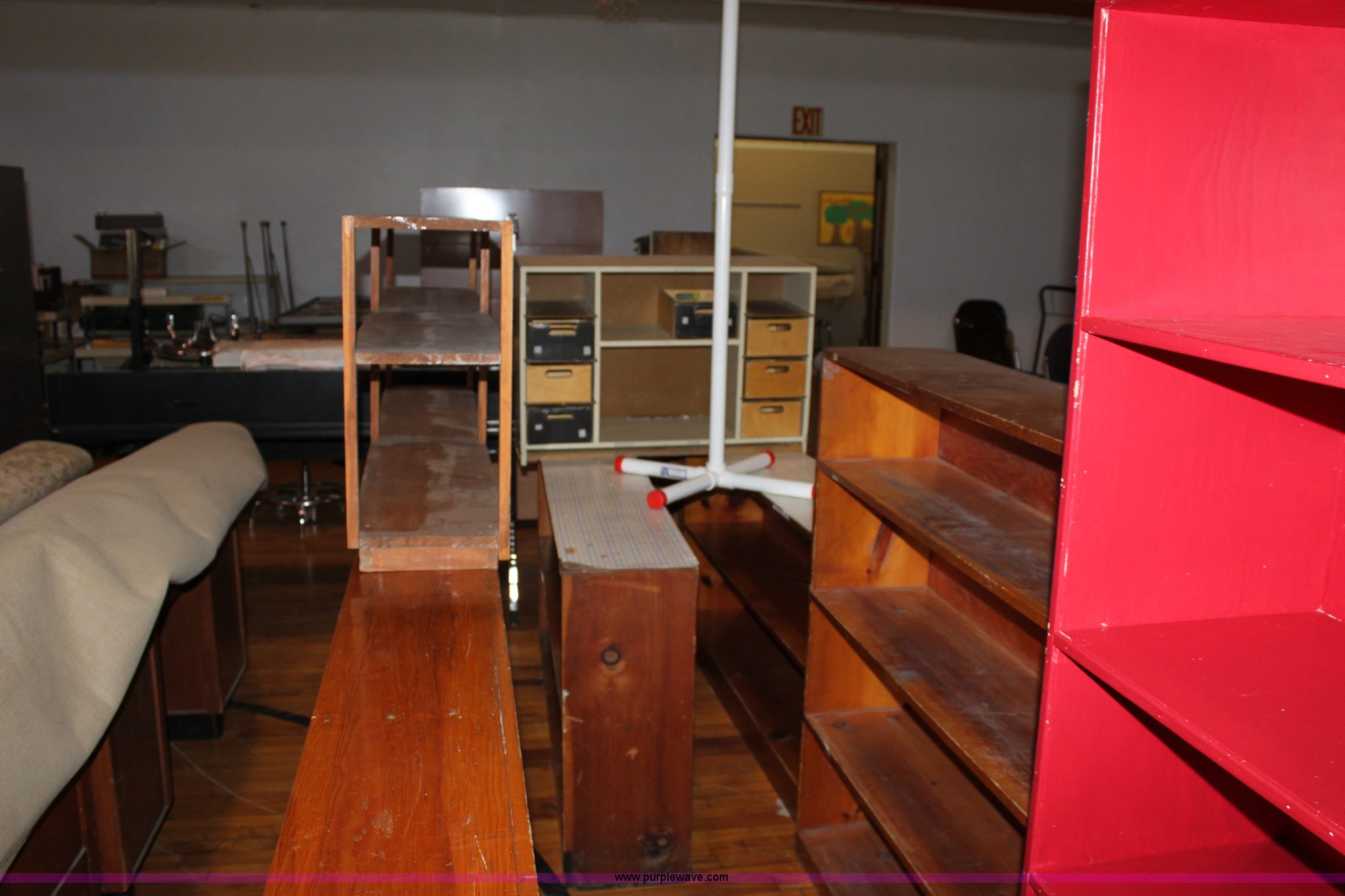 Purple Wave is selling a used Furniture in Kansas. This item is a Assorted office furniture with the following: (5) desks, (6) book shelves, (5) wooden shelving units, Two door metal storage cabinet, (4) chairs, (6) tables, Area rug, And more