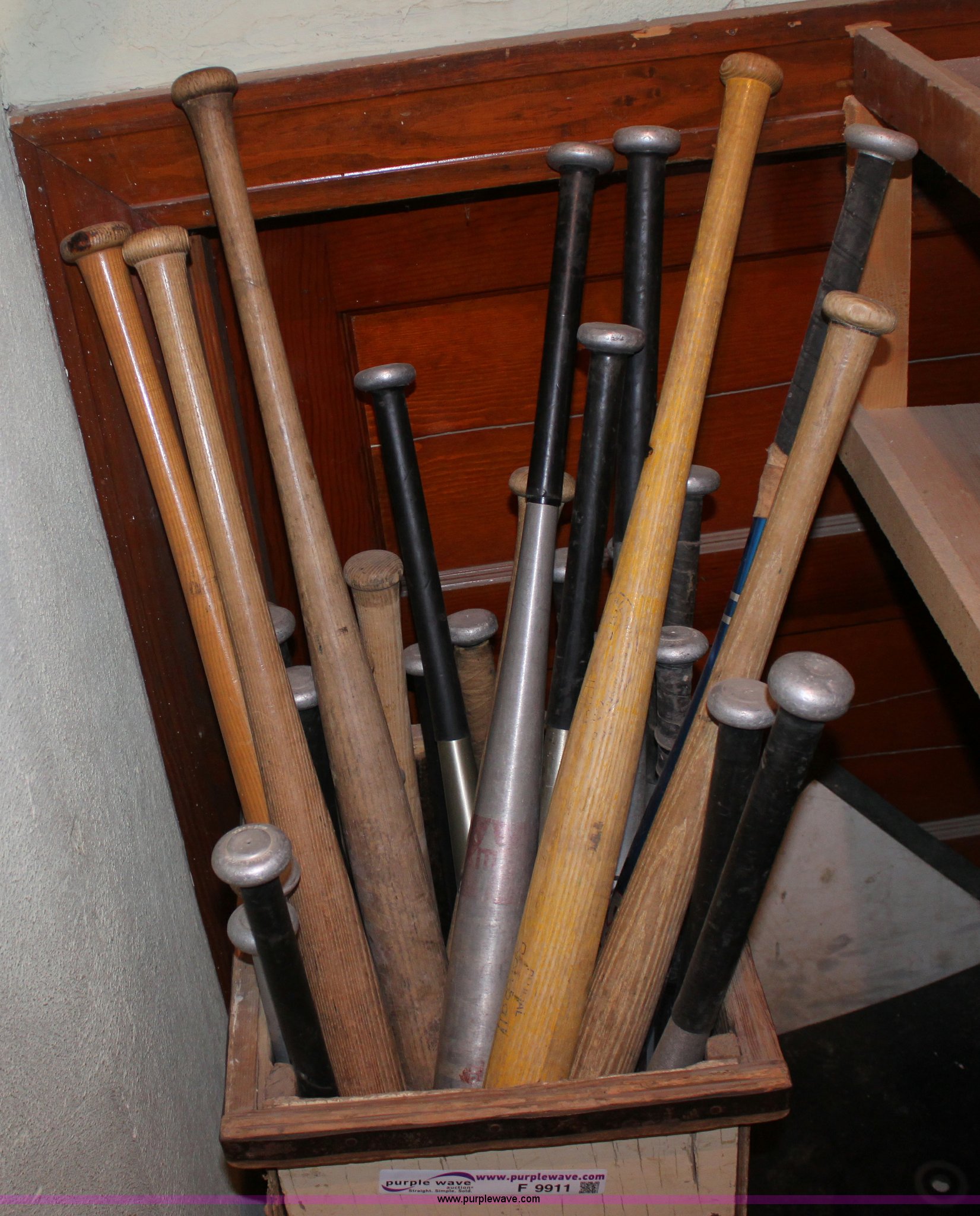 Assorted baseball items. (7) wood youth bats, (20) aluminum youth bats, Soft balls, Baseball glove. USD 397. Lost Springs, KS 66859
