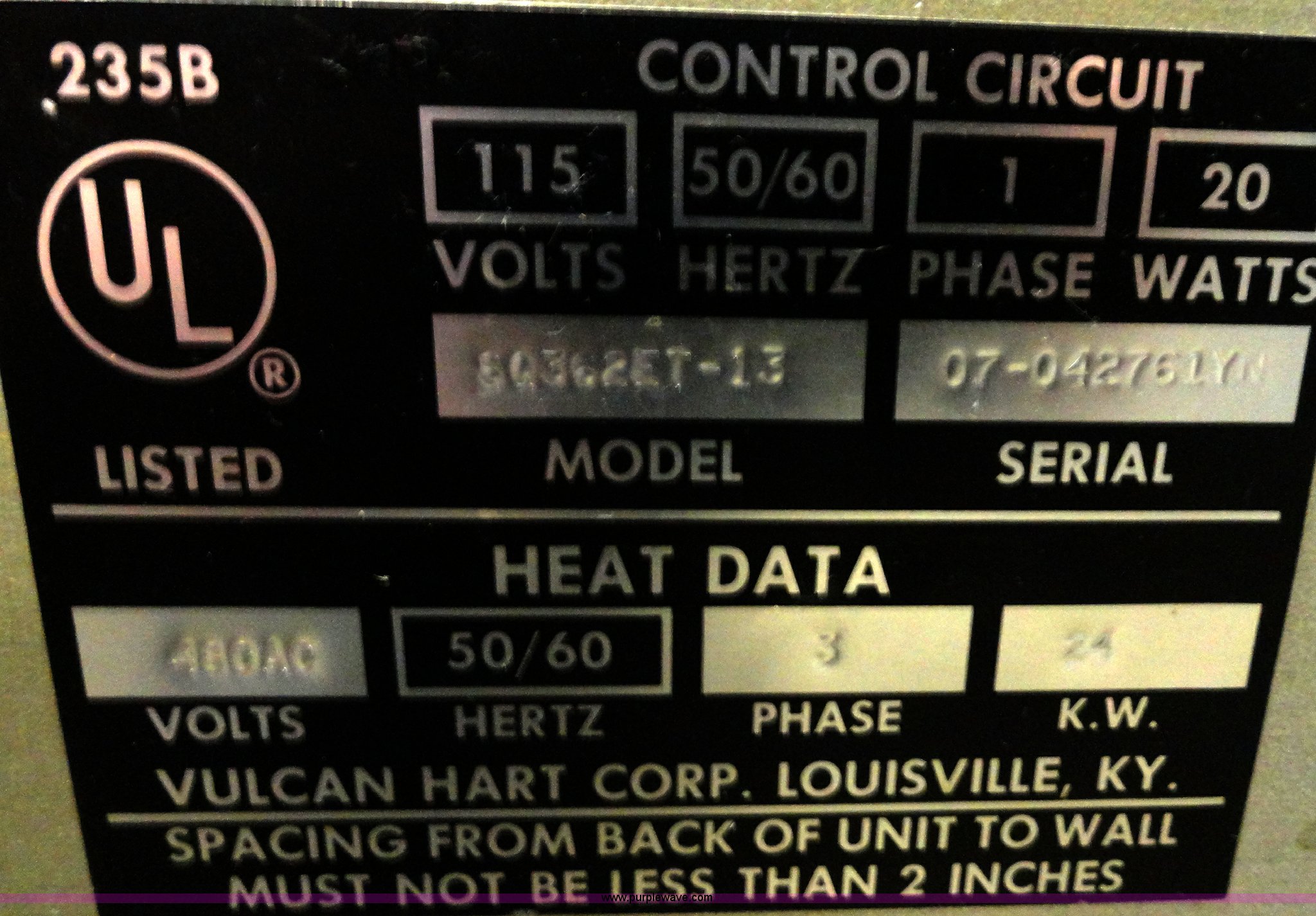 Vulcan steam quick oven. Control 115v, single phase, 20 watts, Model S0362ET-13, Serial 07-042761YN, Heat 36" x 33" x 63", 480v, three phase, 24 KW. USD 320. 510 E Hwy 24. Wamego, KS 66547
