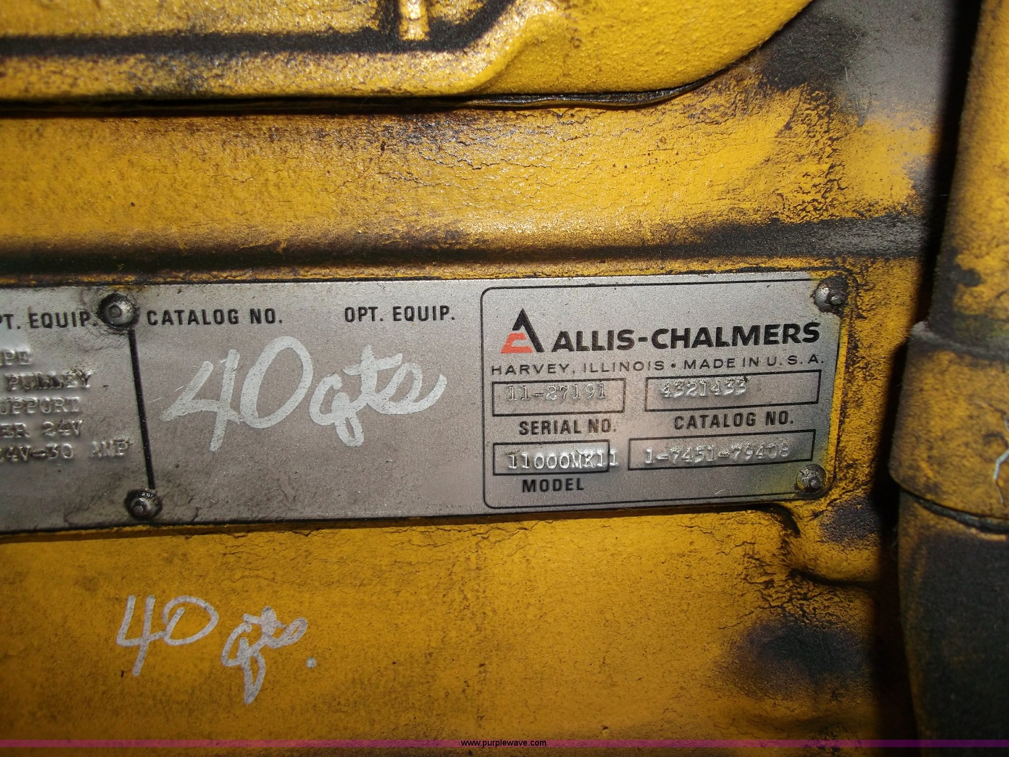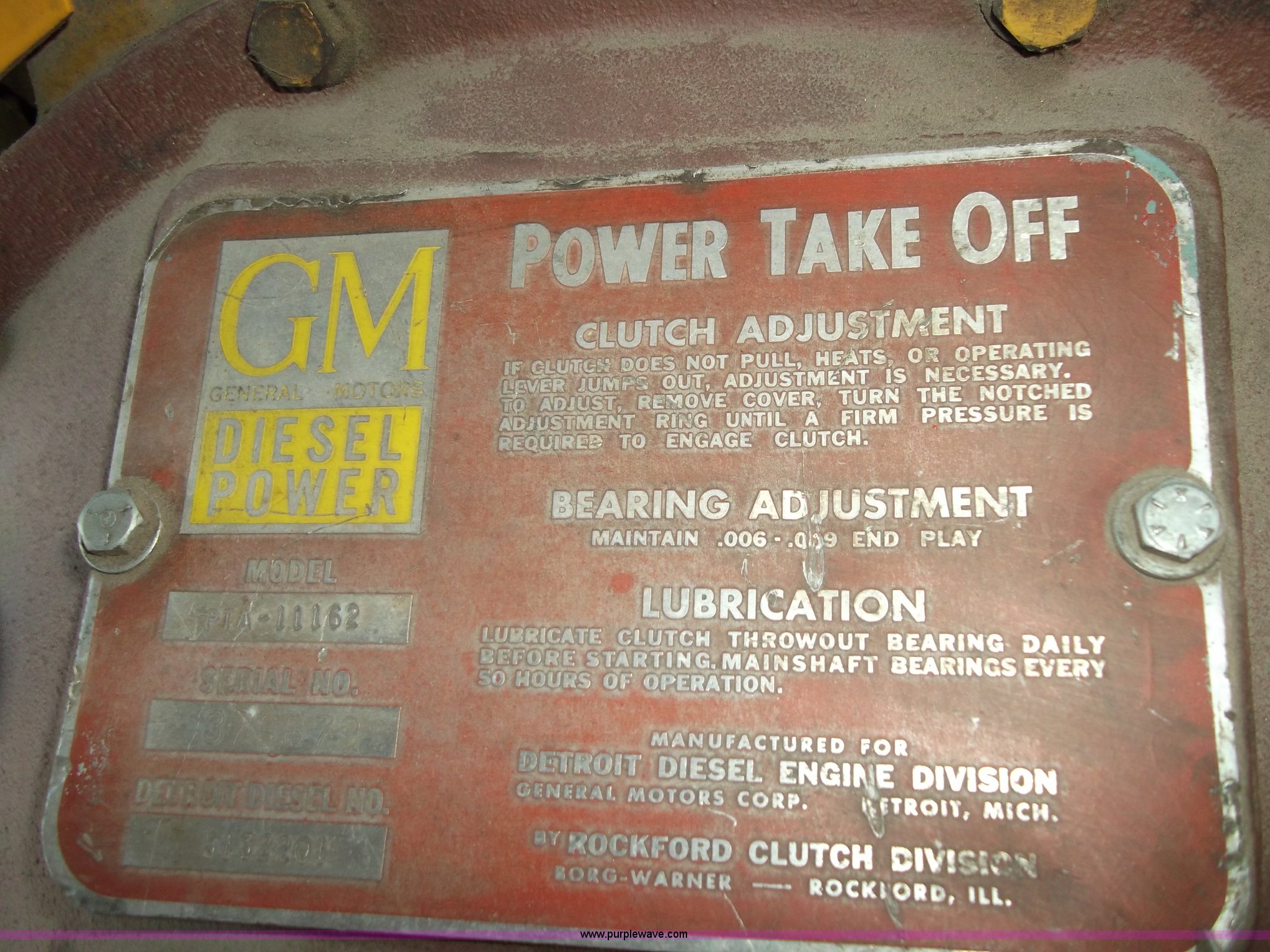Purple Wave is selling a used Other Industrial or Business in Nebraska. This item is a Allis Chalmers 220 HP diesel engine with the following: 300 gallon fuel tank, Manual clutch and PTO, (2) 12v batteries, Exhaust and intake duct work included, GM PTO, Model PTA-11162, Serial 378879, Model 11000MK11, Stored inside, Serial 11-27191