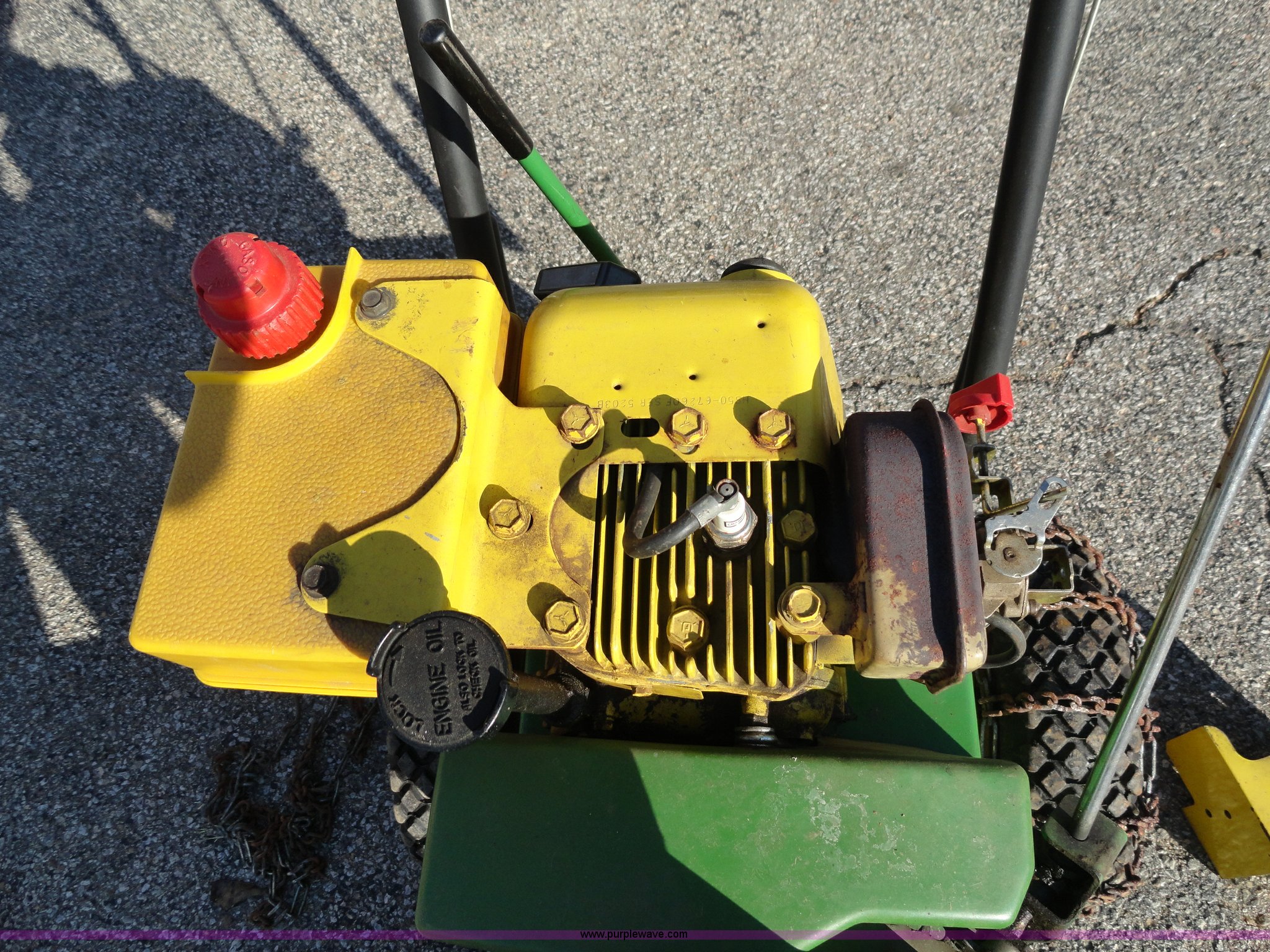 Purple Wave is selling a used Lawn and Garden in Kansas. This item is a John Deere 522 snow blower with chains with the following: 22" swath, 3F-1R gears, Starts but will not stay running, Pull start, Serial TY0522A001186