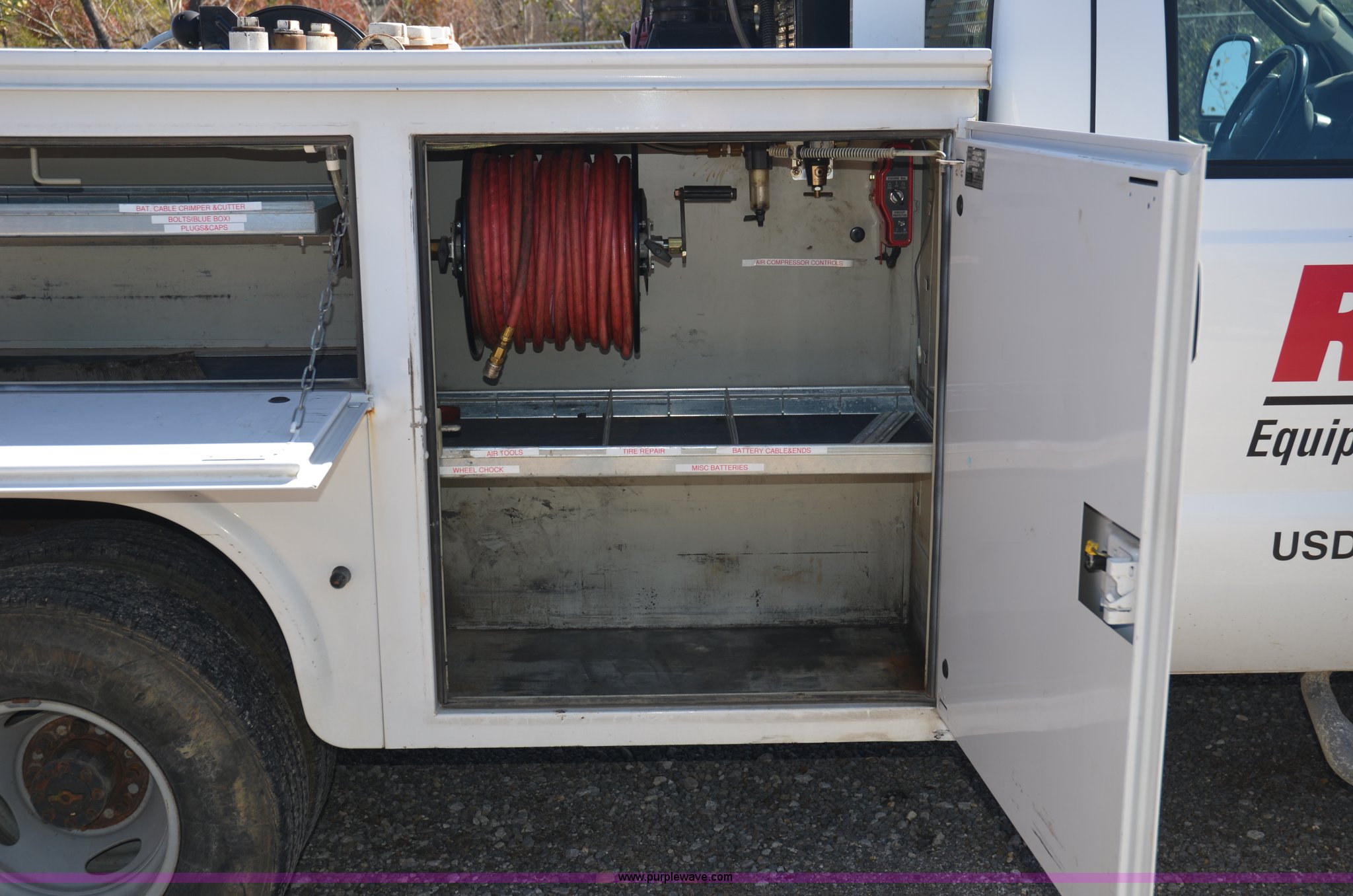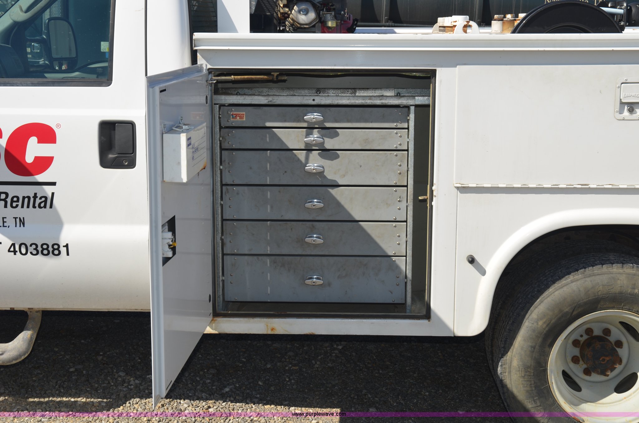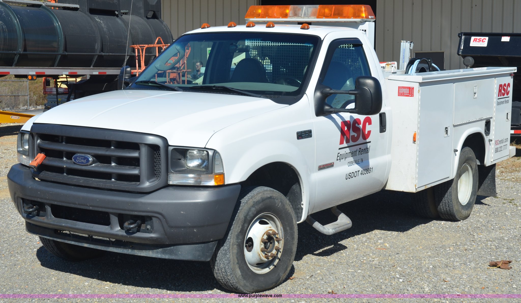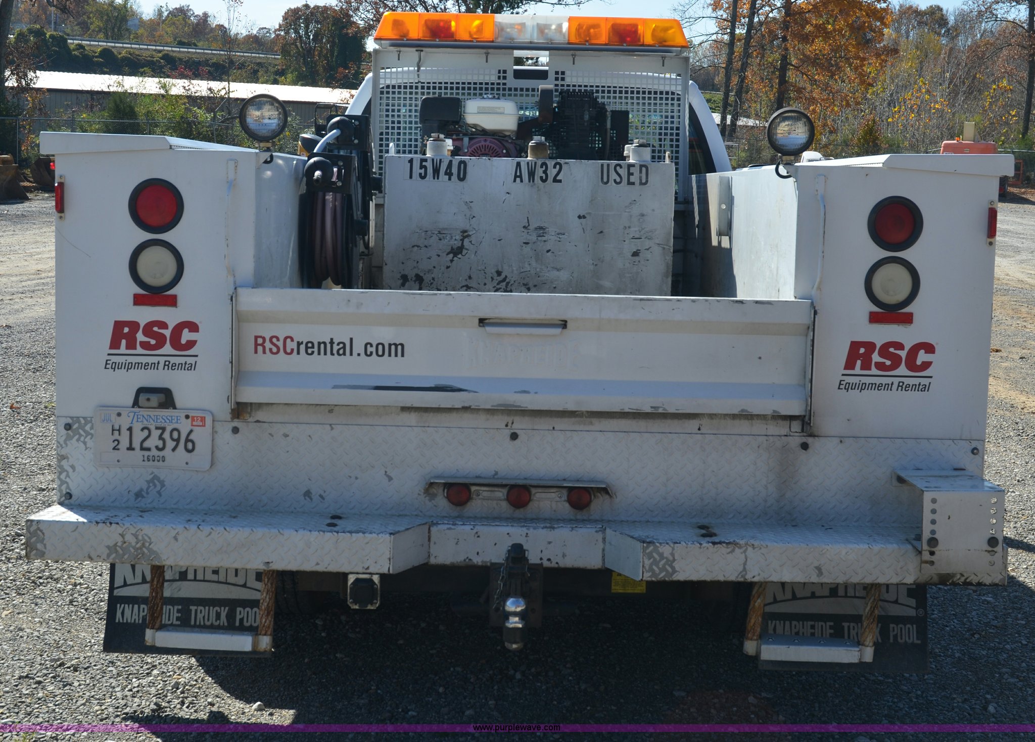 Purple Wave is selling a used Service Truck in Tennessee. This item is a 2004 Ford F350 service truck with the following: 98,869 miles on odometer, Powerstroke 6.0L V8 diesel engine, Automatic transmission, AC and heat, AM/FM radio, Manual windows and locks, Block heater, Dual batteries, Light bar, Work lights, Headache rack, Service bed, Mi-T-M air compressor, Model AS2-SH08-20M, Honda GX240 8 HP gas engine, (2) hose reels, Oil tank, Receiver hitch with 2" ball, Manual and maintenance records included