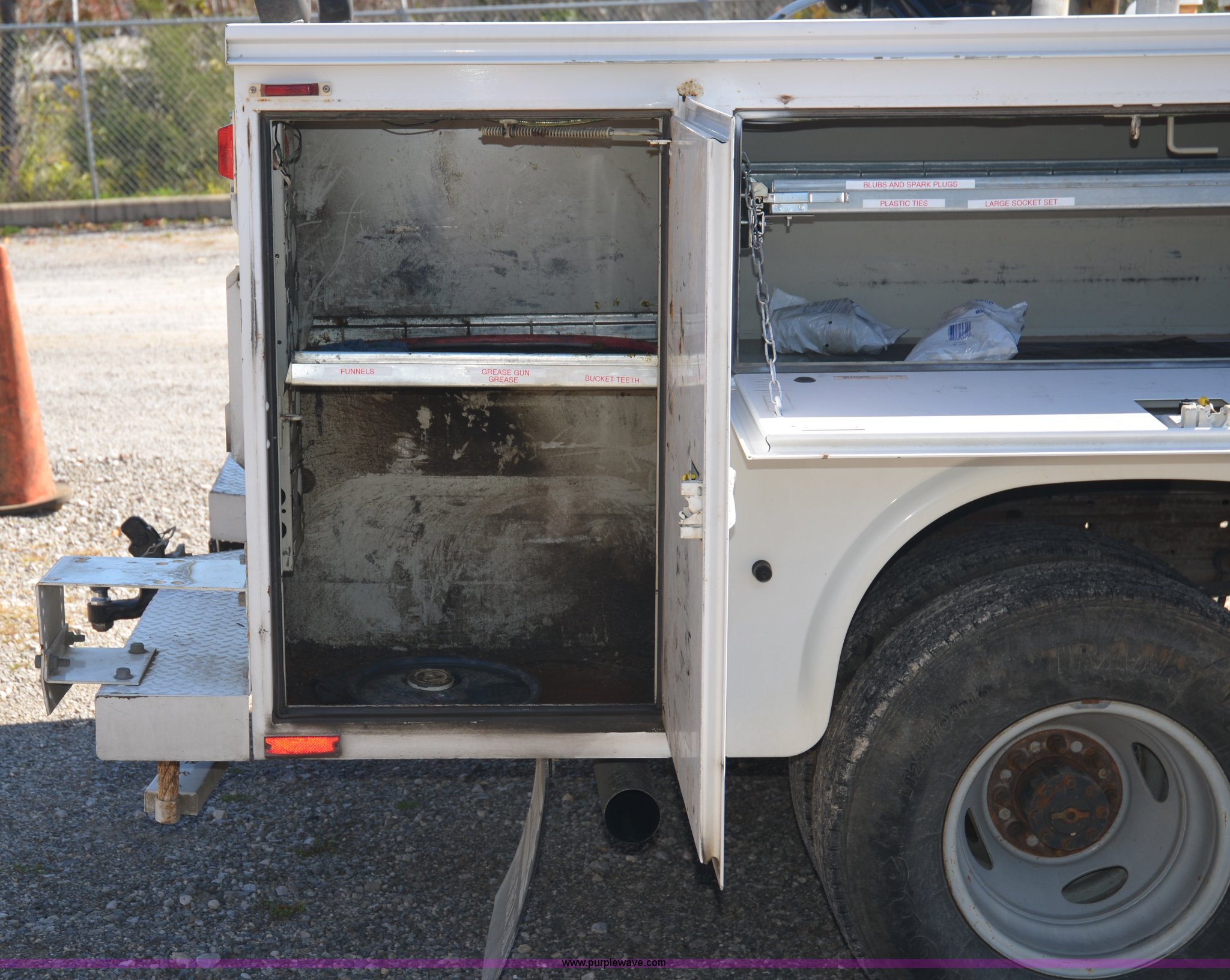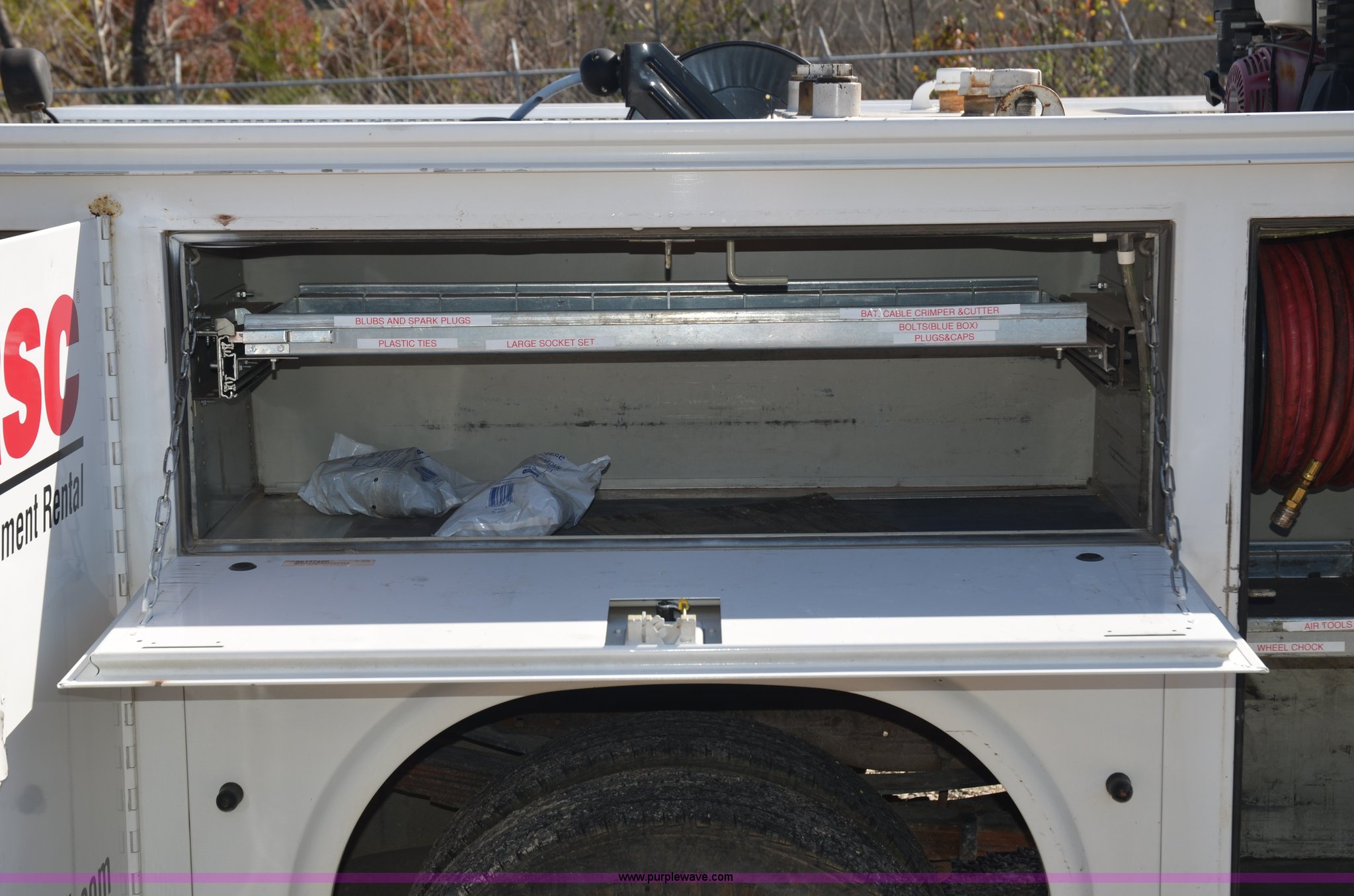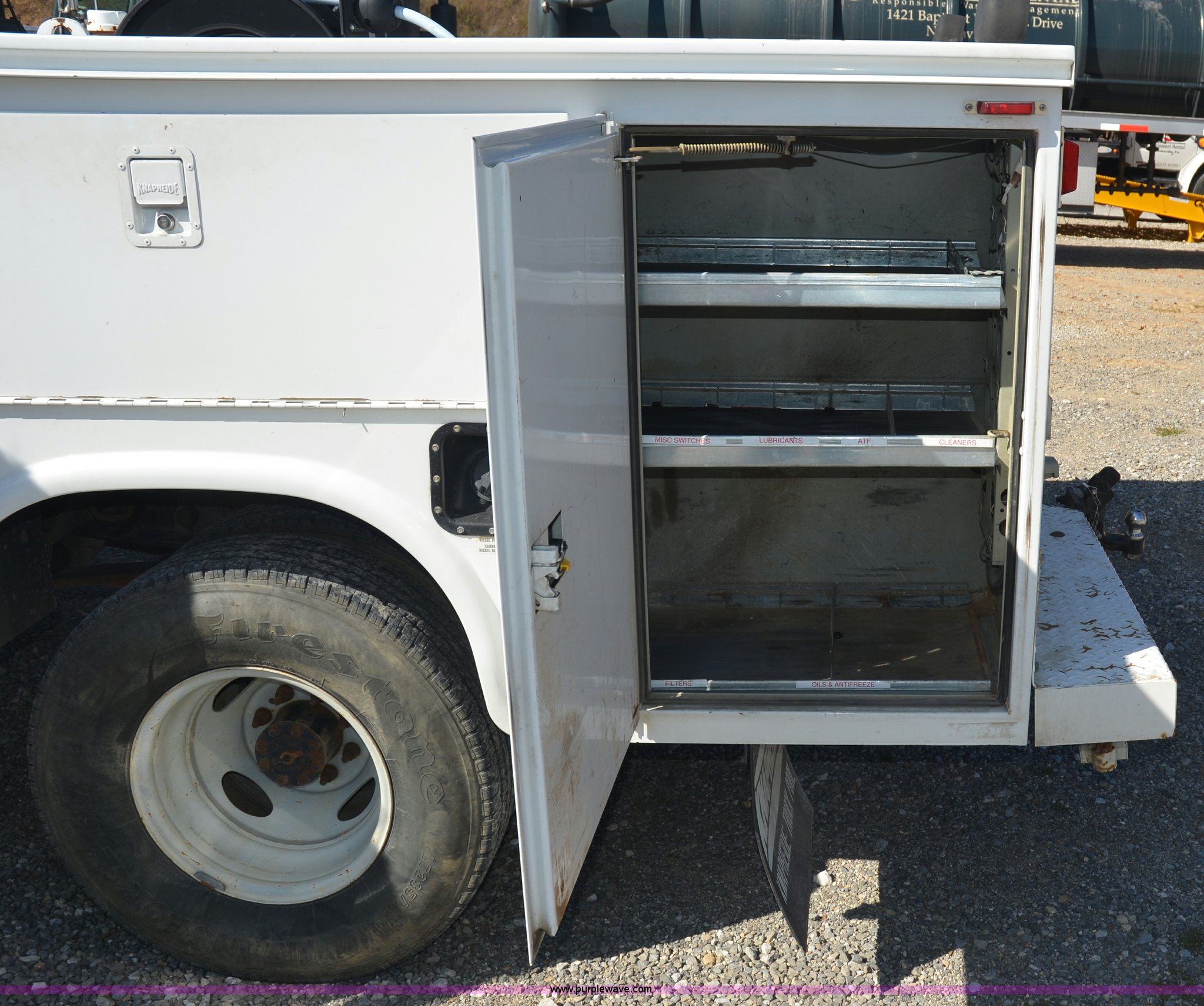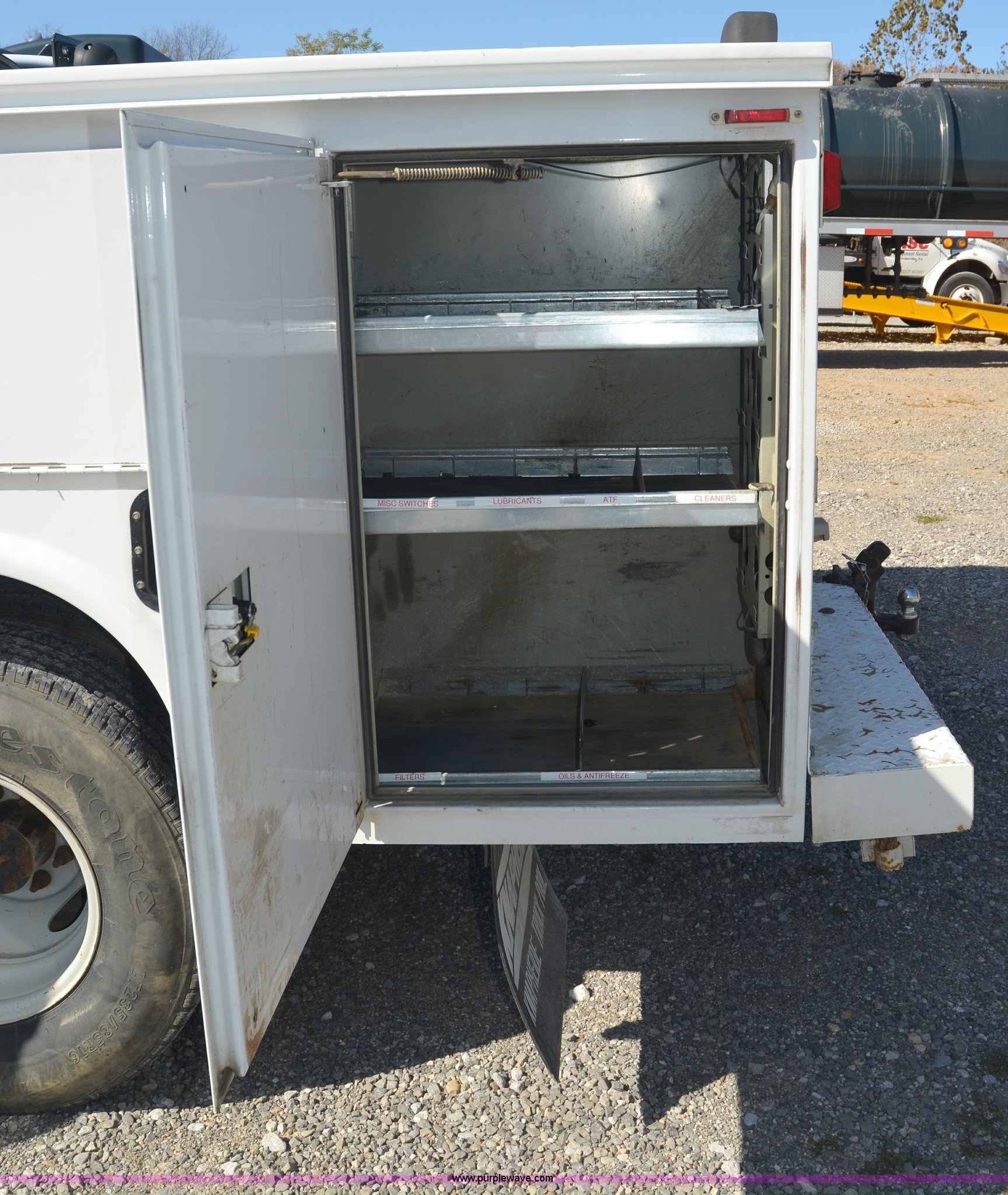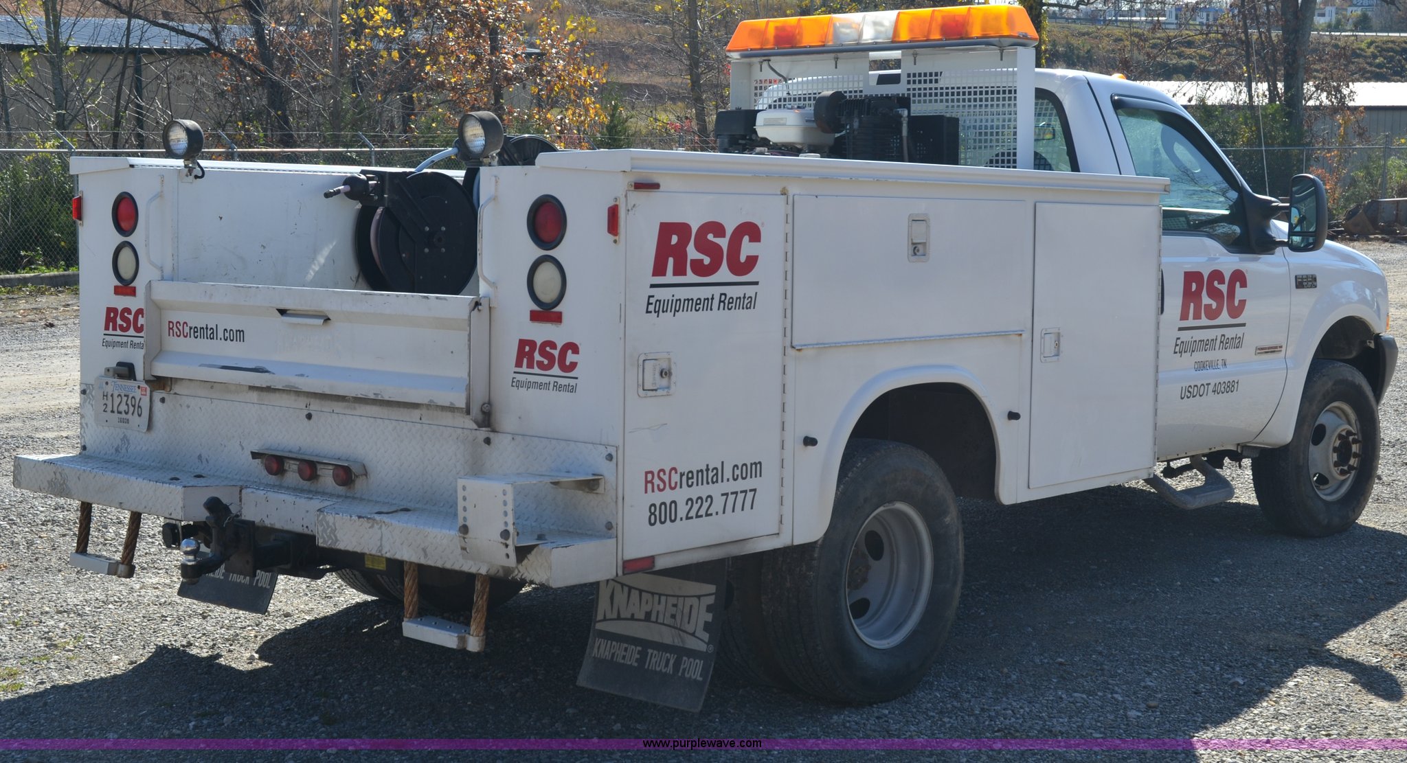 Purple Wave is selling a used Service Truck in Tennessee. This item is a 2004 Ford F350 service truck with the following: 98,869 miles on odometer, Powerstroke 6.0L V8 diesel engine, Automatic transmission, AC and heat, AM/FM radio, Manual windows and locks, Block heater, Dual batteries, Light bar, Work lights, Headache rack, Service bed, Mi-T-M air compressor, Model AS2-SH08-20M, Honda GX240 8 HP gas engine, (2) hose reels, Oil tank, Receiver hitch with 2" ball, Manual and maintenance records included