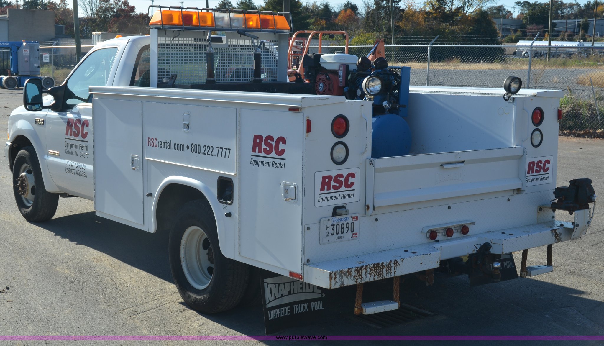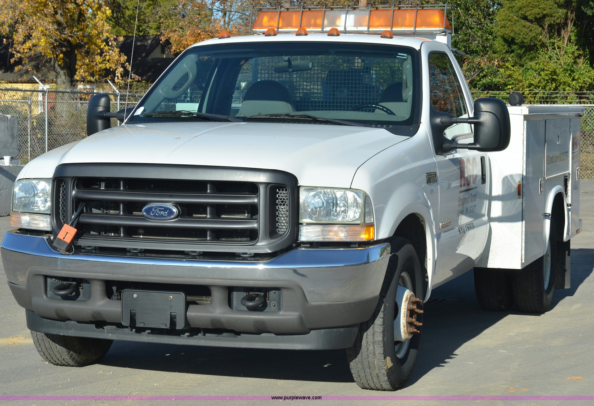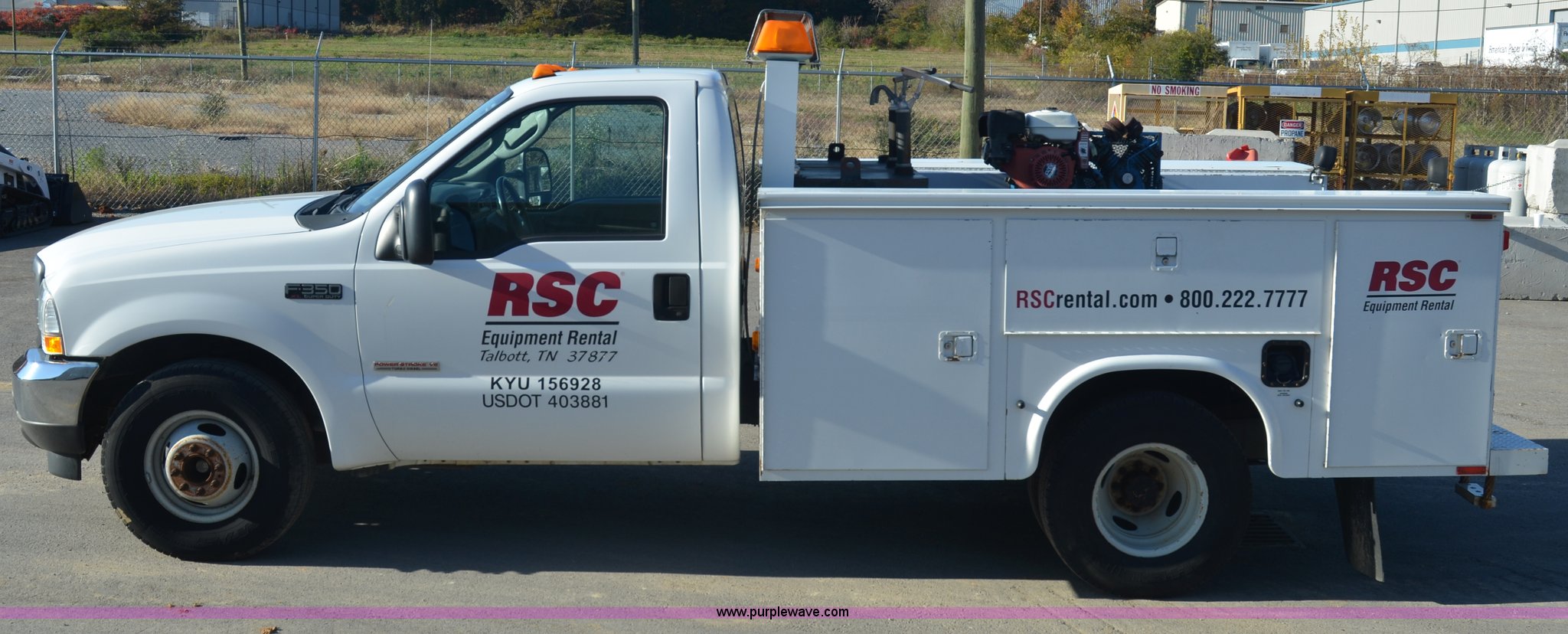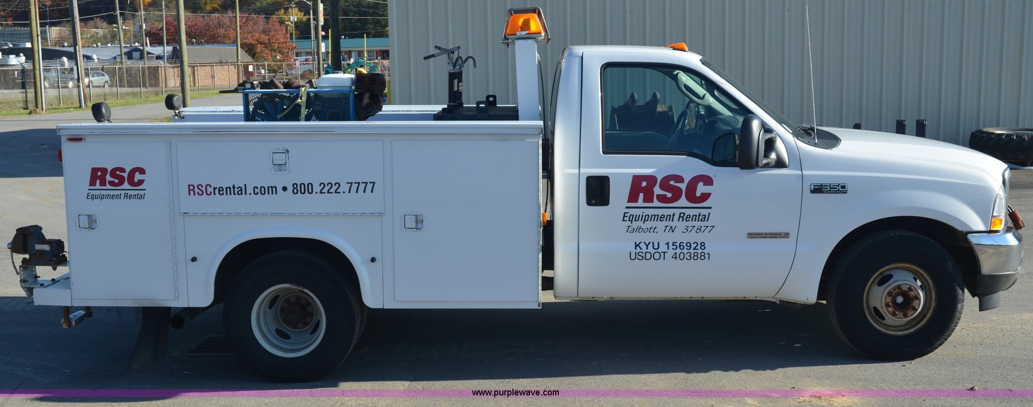 Purple Wave is selling a used Service Truck in Tennessee. This item is a 2004 Ford F350 service truck with the following: 146,073 miles on odometer, Powerstroke 6.0L diesel engine, Automatic transmission, AC and heat, AM/FM radio, Manual windows and locks, Block heater, Dual batteries, Light bar, Work lights, Headache rack, Service bed, Air compressor, Honda GX240 8 HP gas engine, Oil tank, Vice mounted on bumper, Receiver hitch with 2" ball, Manual and maintenance records included