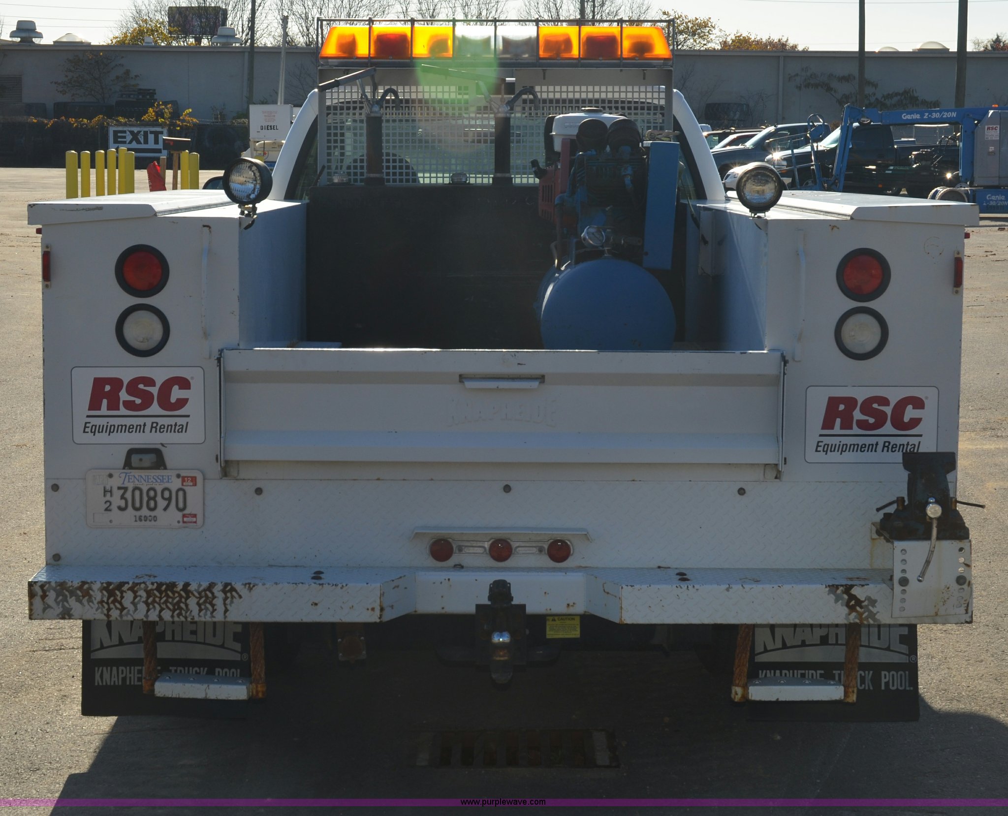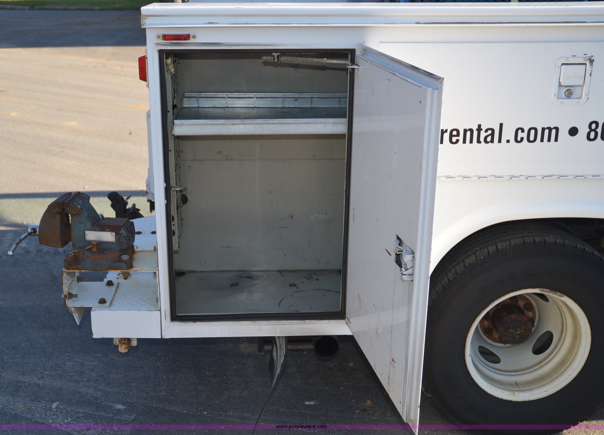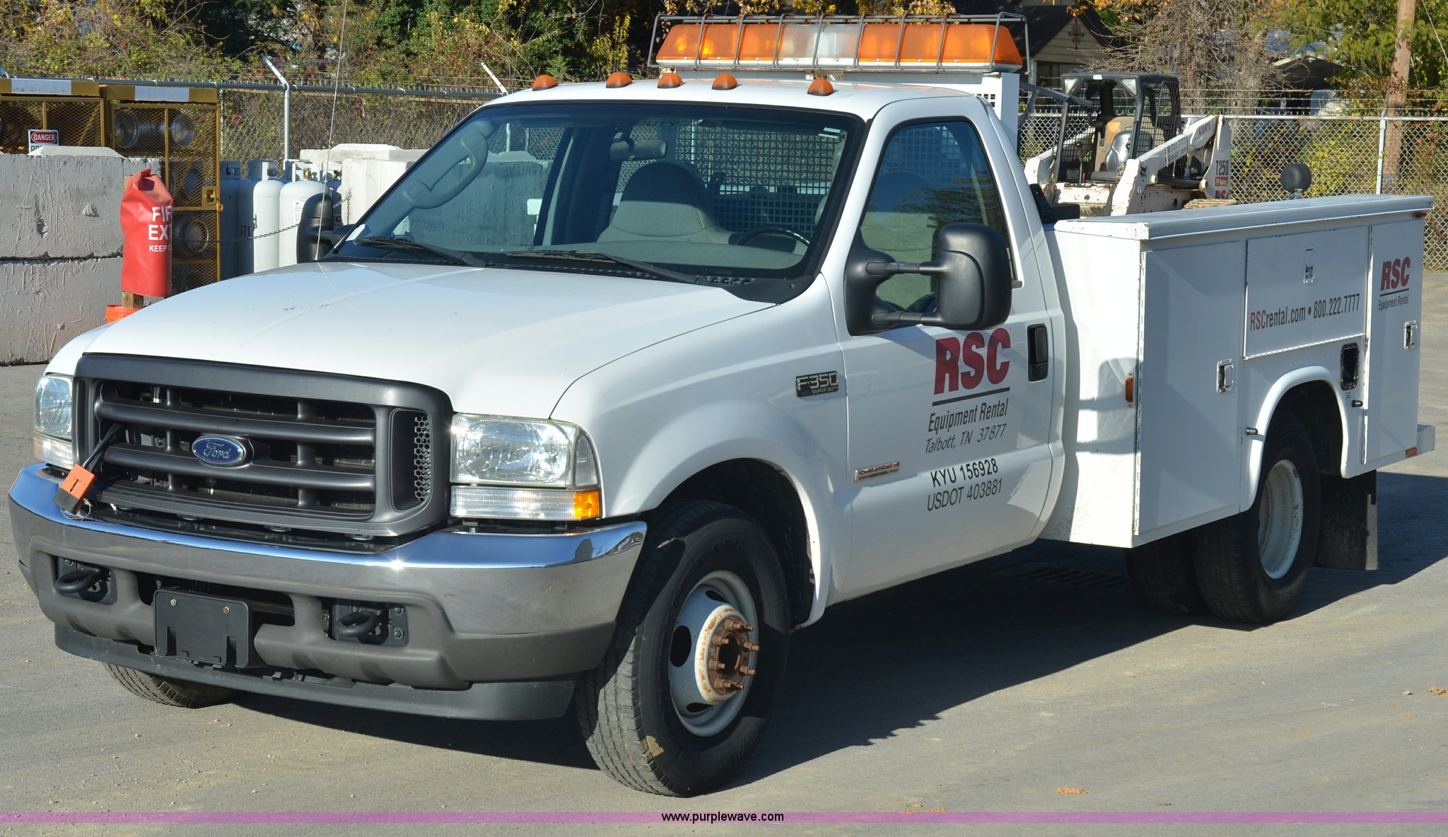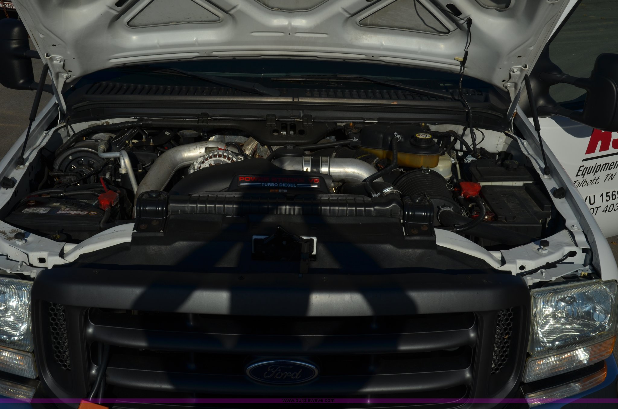 Purple Wave is selling a used Service Truck in Tennessee. This item is a 2004 Ford F350 service truck with the following: 146,073 miles on odometer, Powerstroke 6.0L diesel engine, Automatic transmission, AC and heat, AM/FM radio, Manual windows and locks, Block heater, Dual batteries, Light bar, Work lights, Headache rack, Service bed, Air compressor, Honda GX240 8 HP gas engine, Oil tank, Vice mounted on bumper, Receiver hitch with 2" ball, Manual and maintenance records included