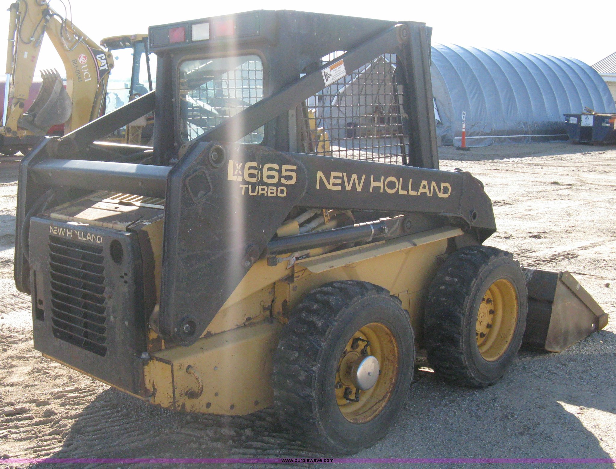 Purple Wave is selling a used Skid Steer Loader in Kansas. This item is a 1999 New Holland LX665 Turbo Super Boom skid loader with the following: 3,245 hours on meter, New Holland four cylinder diesel engine, 50 HP, OROPS, Auxiliary hydraulics, Quick attach bucket, 5.5'W bucket, 1,700 lb lift capacity, 5,405 lbs. base operating weight, 10-16.5NHS tires, One owner, Service records available, Serial 69199