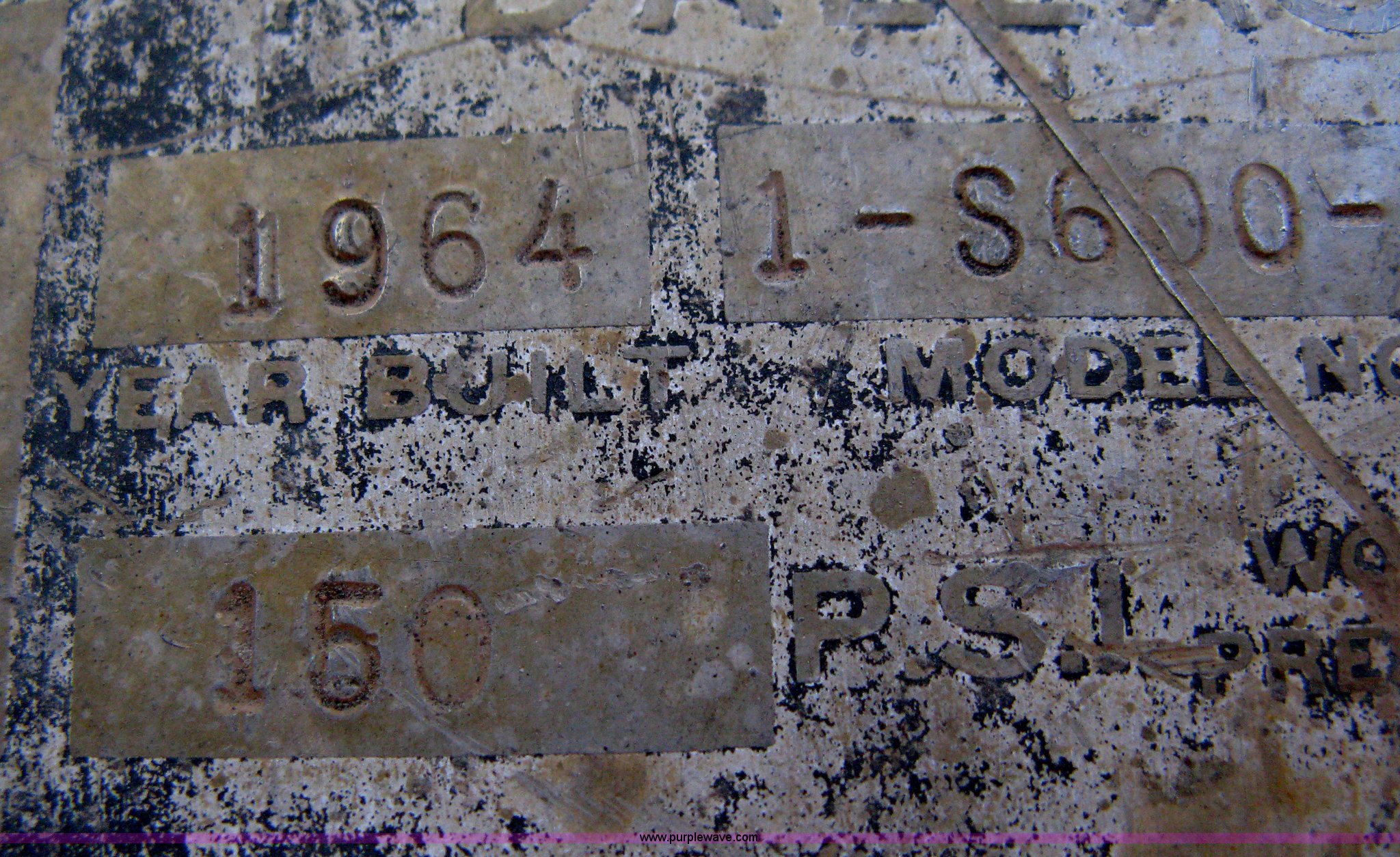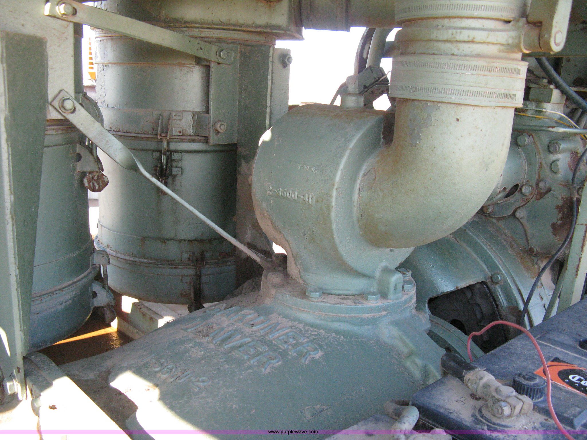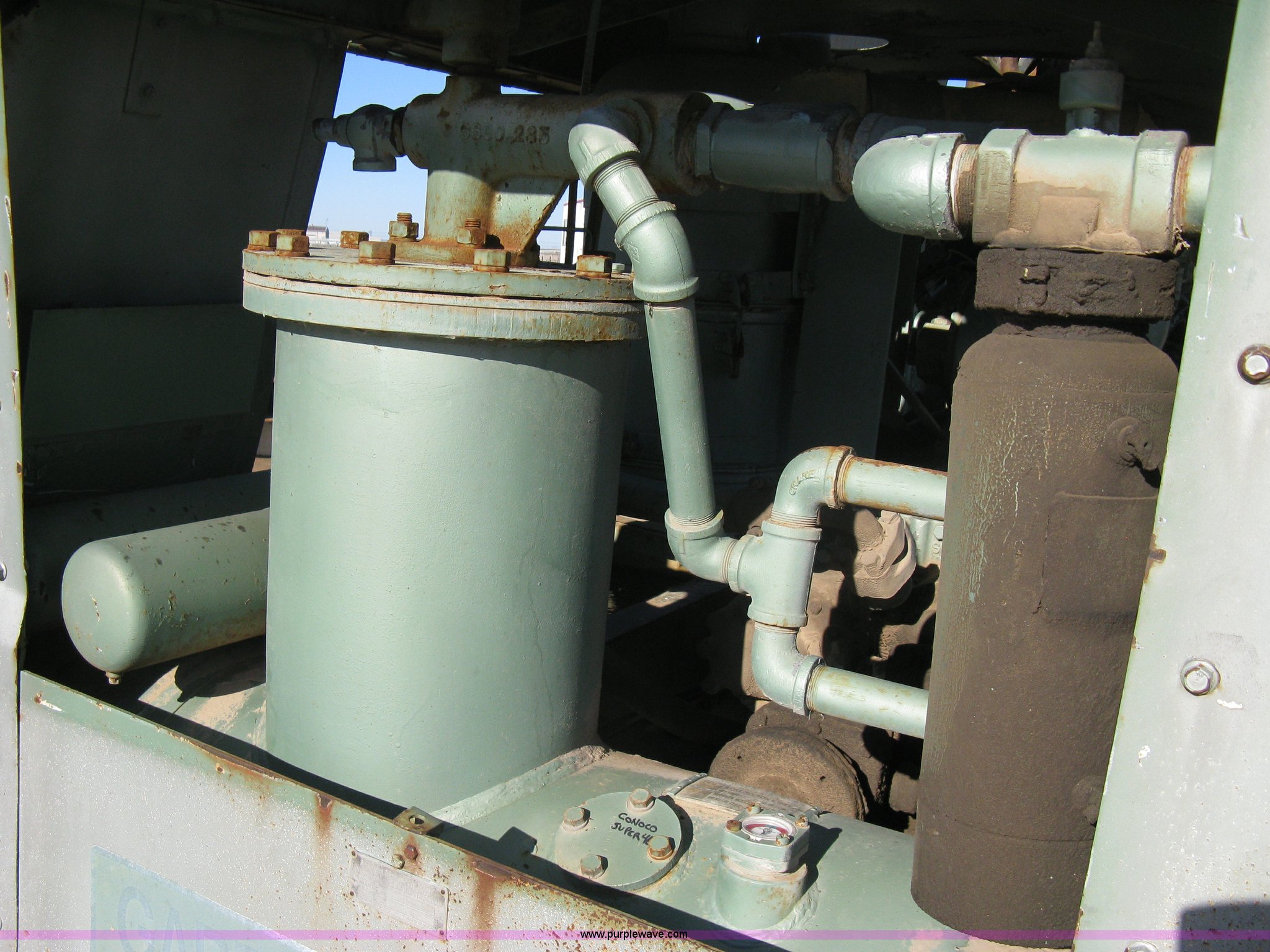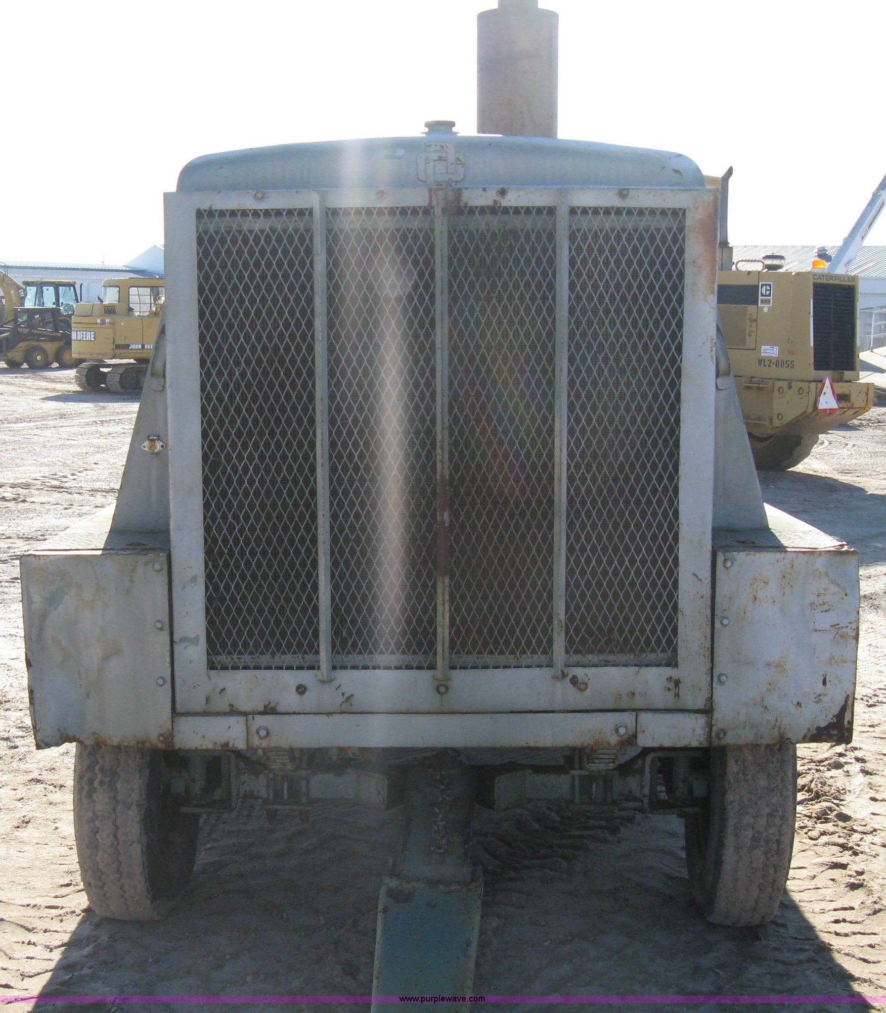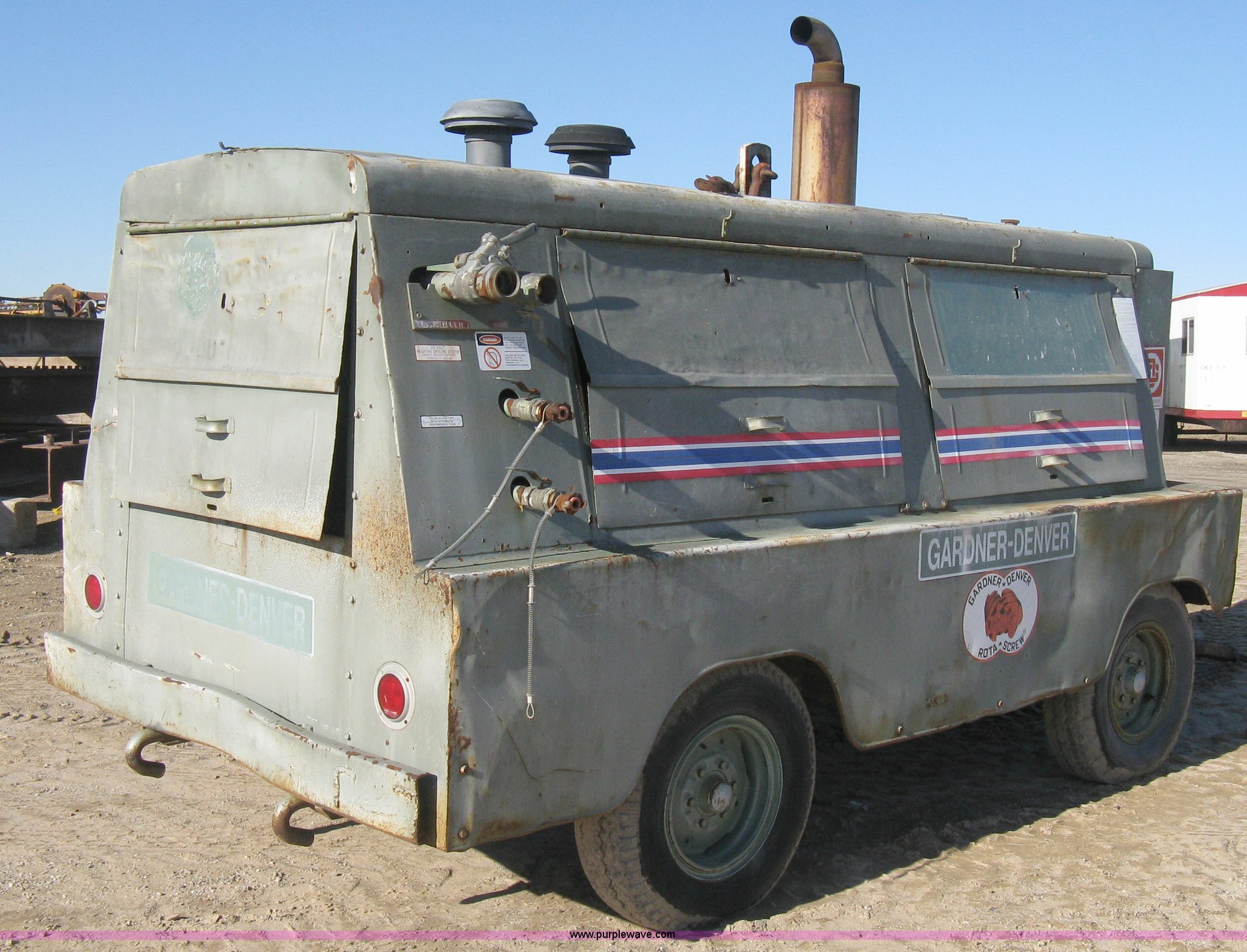 Purple Wave is selling a used Air Compressor in Kansas. This item is a 1964 Gardner Denver SP600DC mobile compressor with the following: 1,010 hours on replacement meter, 1,133 hours on original service meter, Detroit six cylinder diesel engine, 150 PSI working pressure, 250 working pressure, Four-wheel wagon mount, Tow tongue with pintle hitch end, 15" tires, Serial 476205