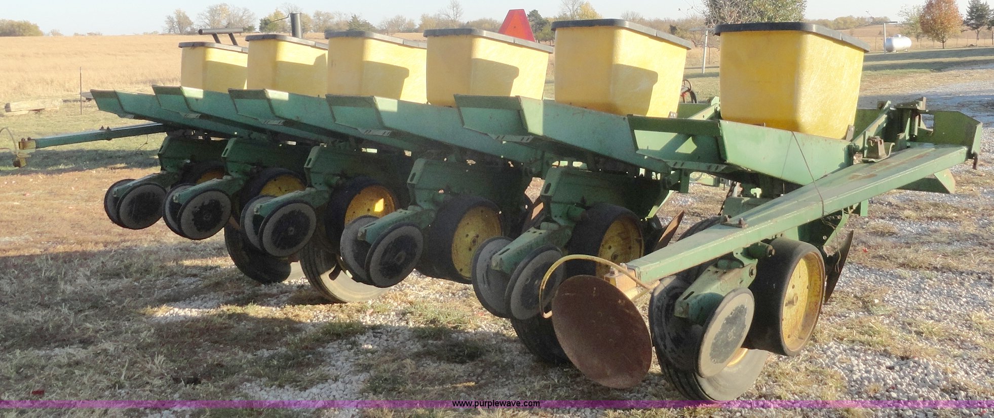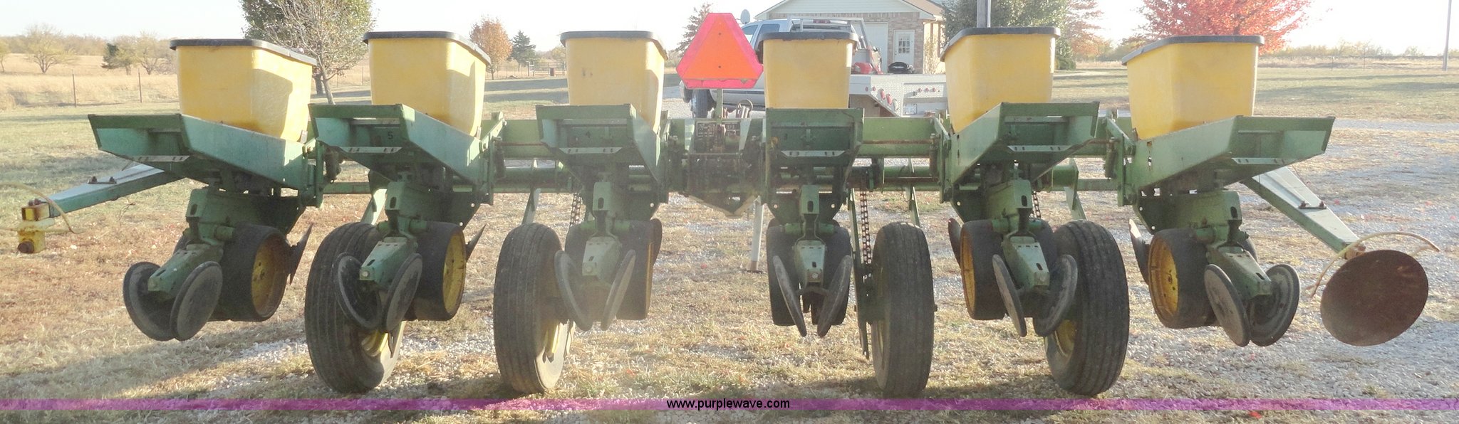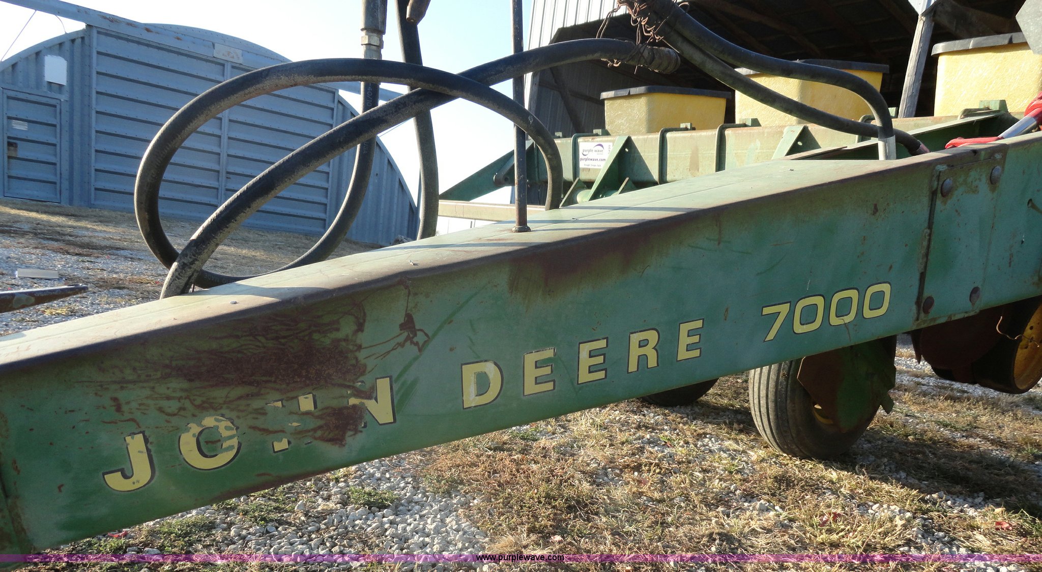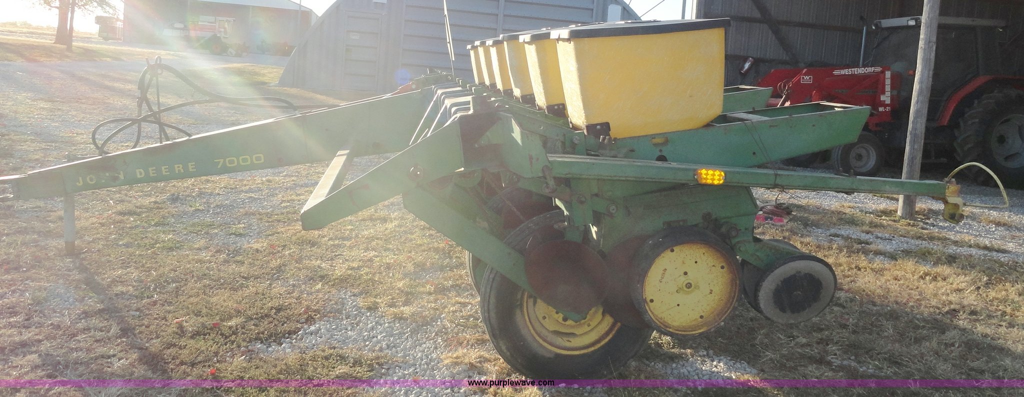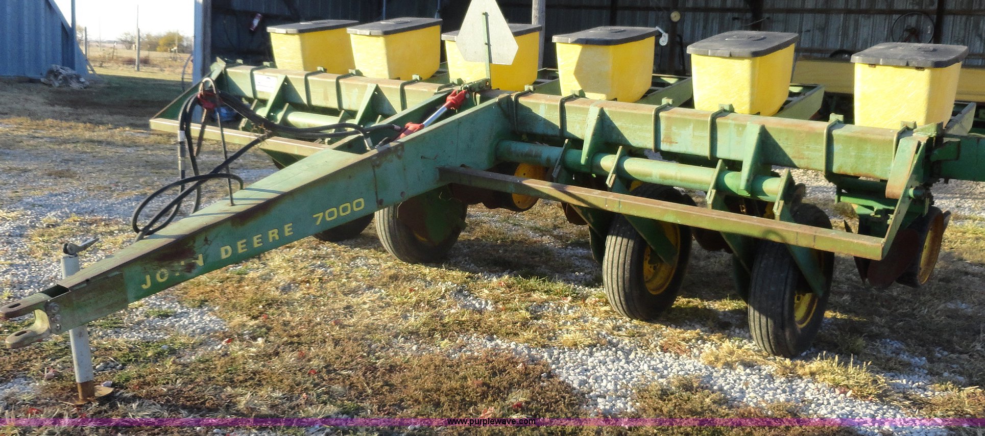 Purple Wave is selling a used Planter in Kansas. This item is a John Deere 7000 six row planter with the following: 30" spacing, 11.5" double disks, Corn, milo, and bean plates included, Hydraulic markers, Missing marker disk bearing, but included, Coulters, Hydraulic hookups, Pin hitch, 7.60-15 tires, Operators manual