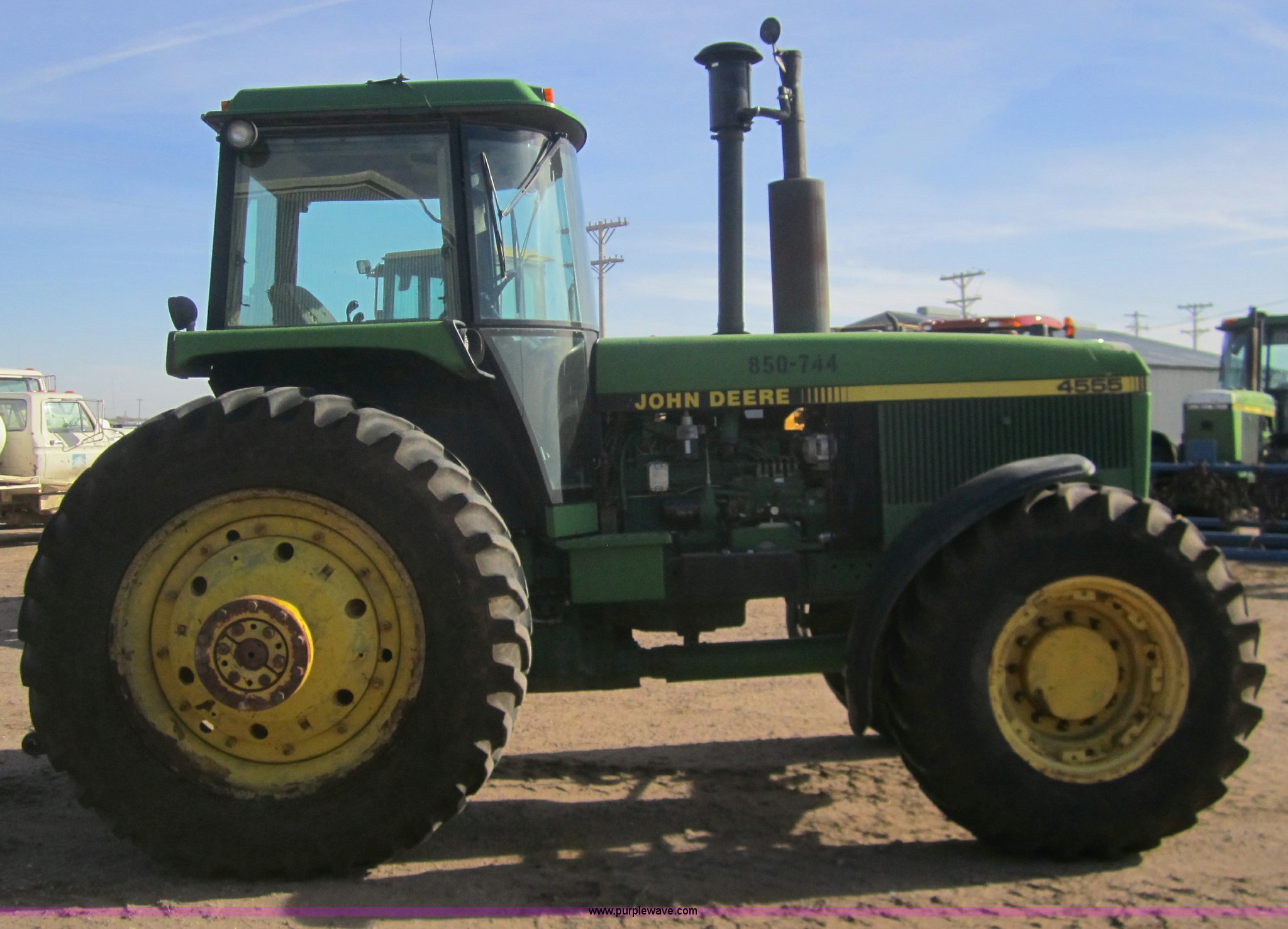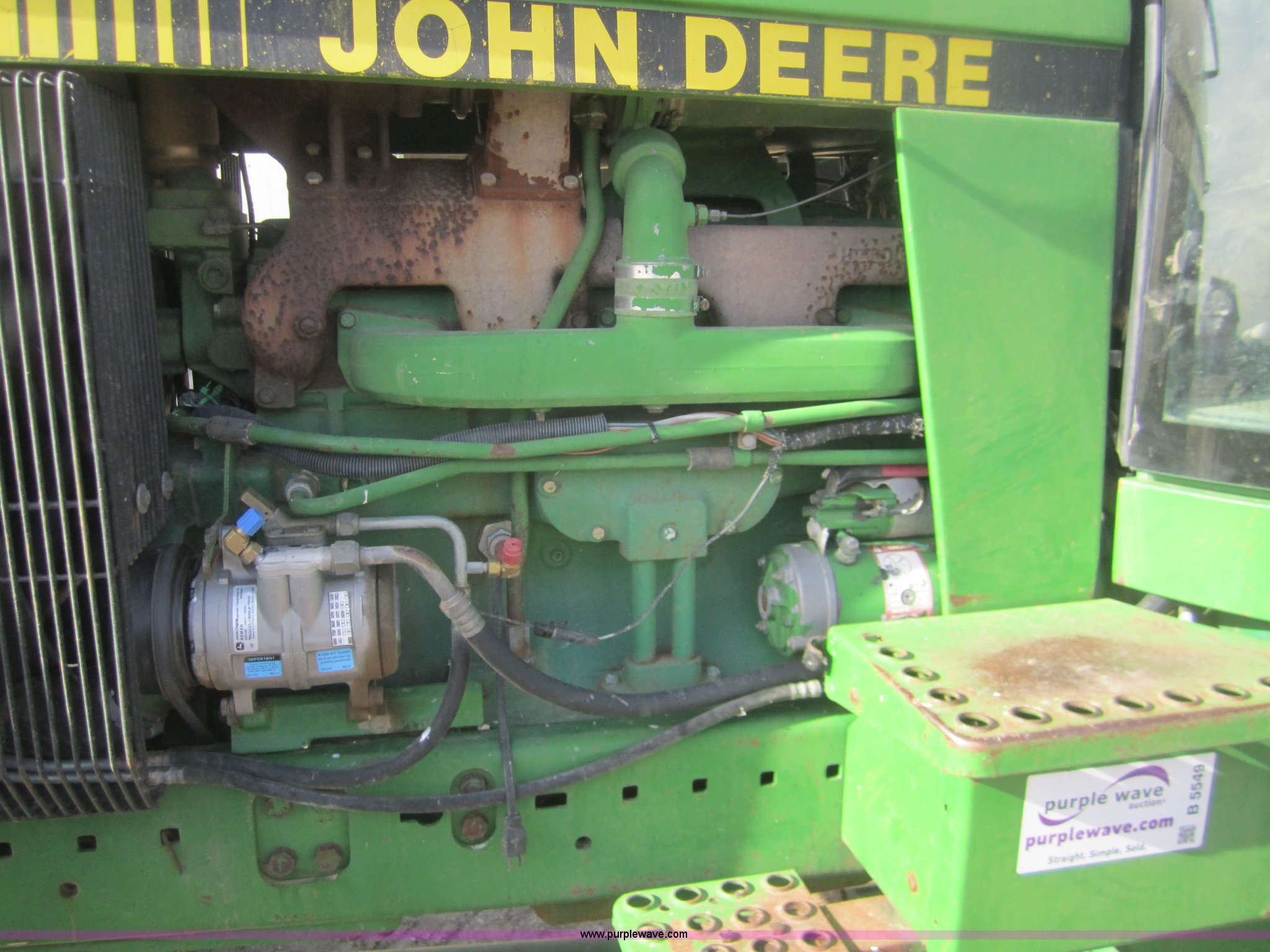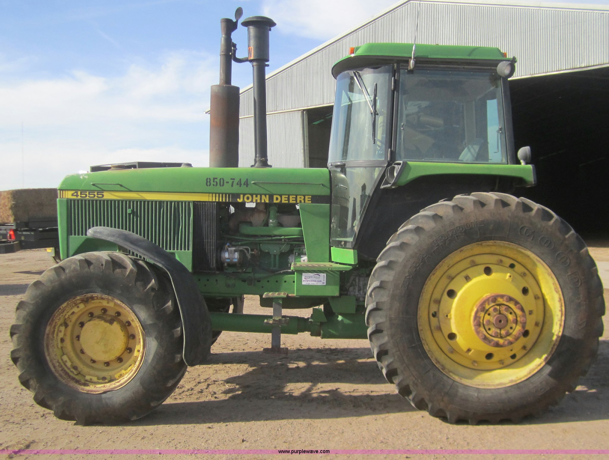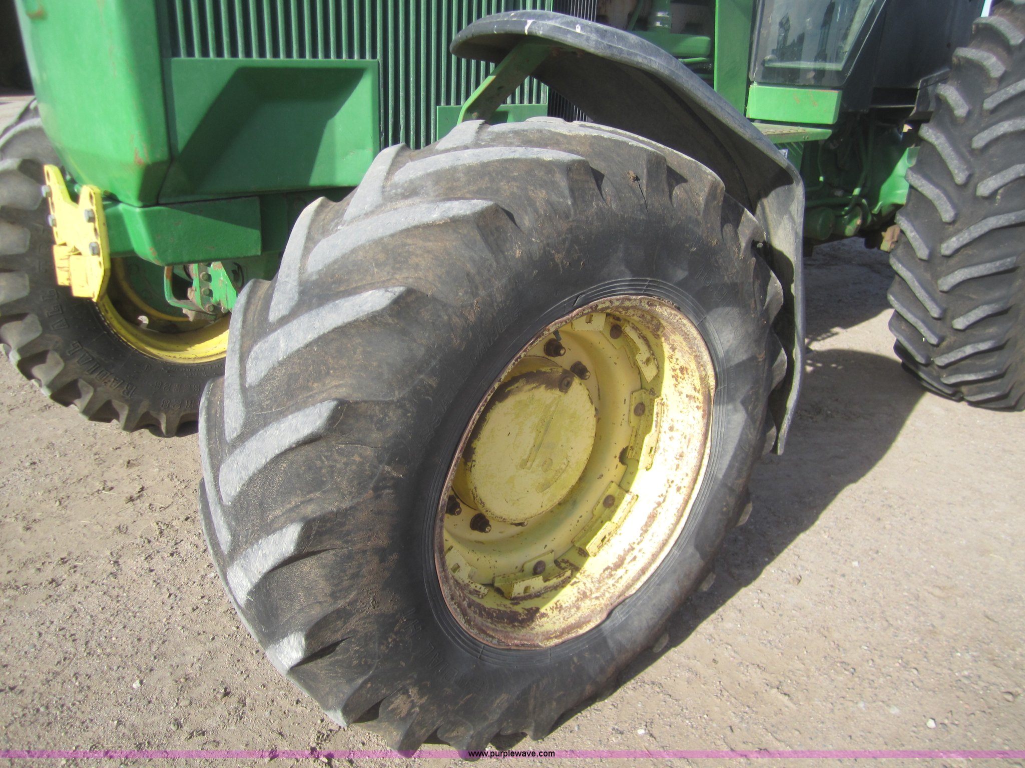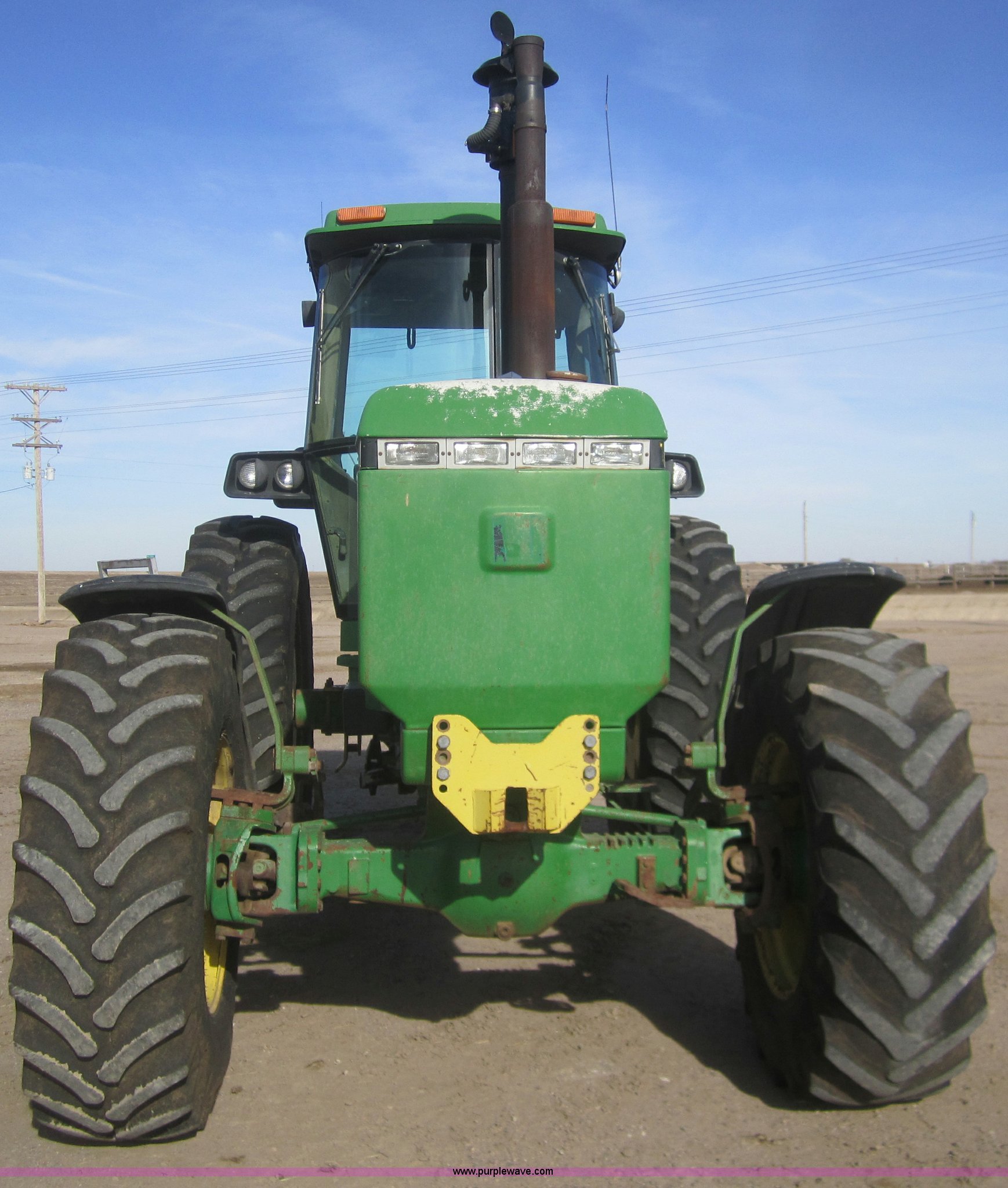 Purple Wave is selling a used Tractor in Kansas. This item is a 1990 John Deere 4555 MFWD tractor with the following: 3,370 hours on meter, Hours not original, John Deere six cylinder diesel engine, Serial SE6076A203157, Re manufactured Engine, Powershift transmission, 15F-4R, AC and heat, Tilt steering, AM/FM/Cassette, Three point, Draw Bar, 1000 PTO, (3) hydraulic remote sets, 16.9R28 front tires, 480/80R42 rear tires, Inner rear tire weights, Serial RW4555P003950