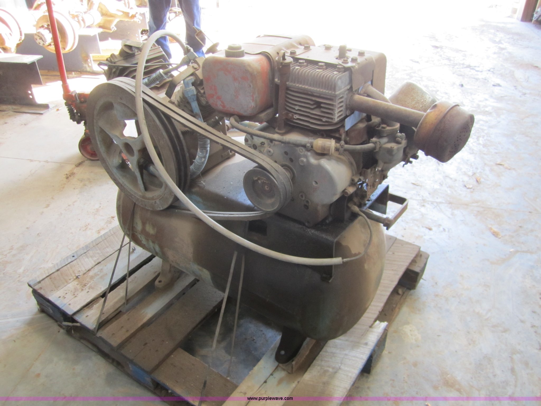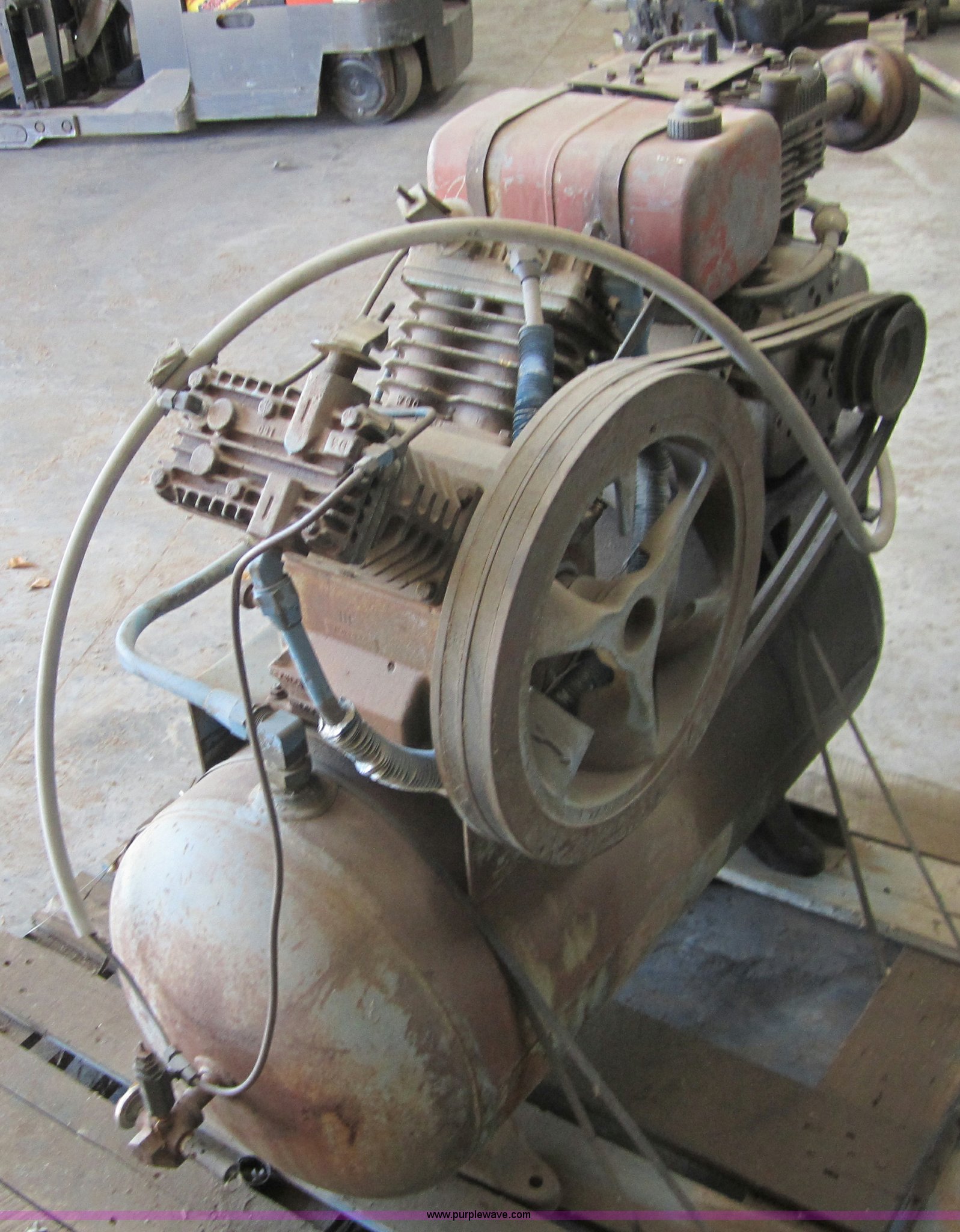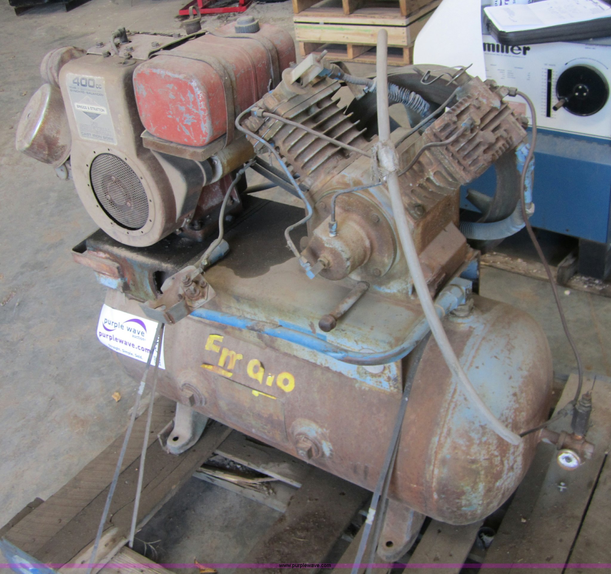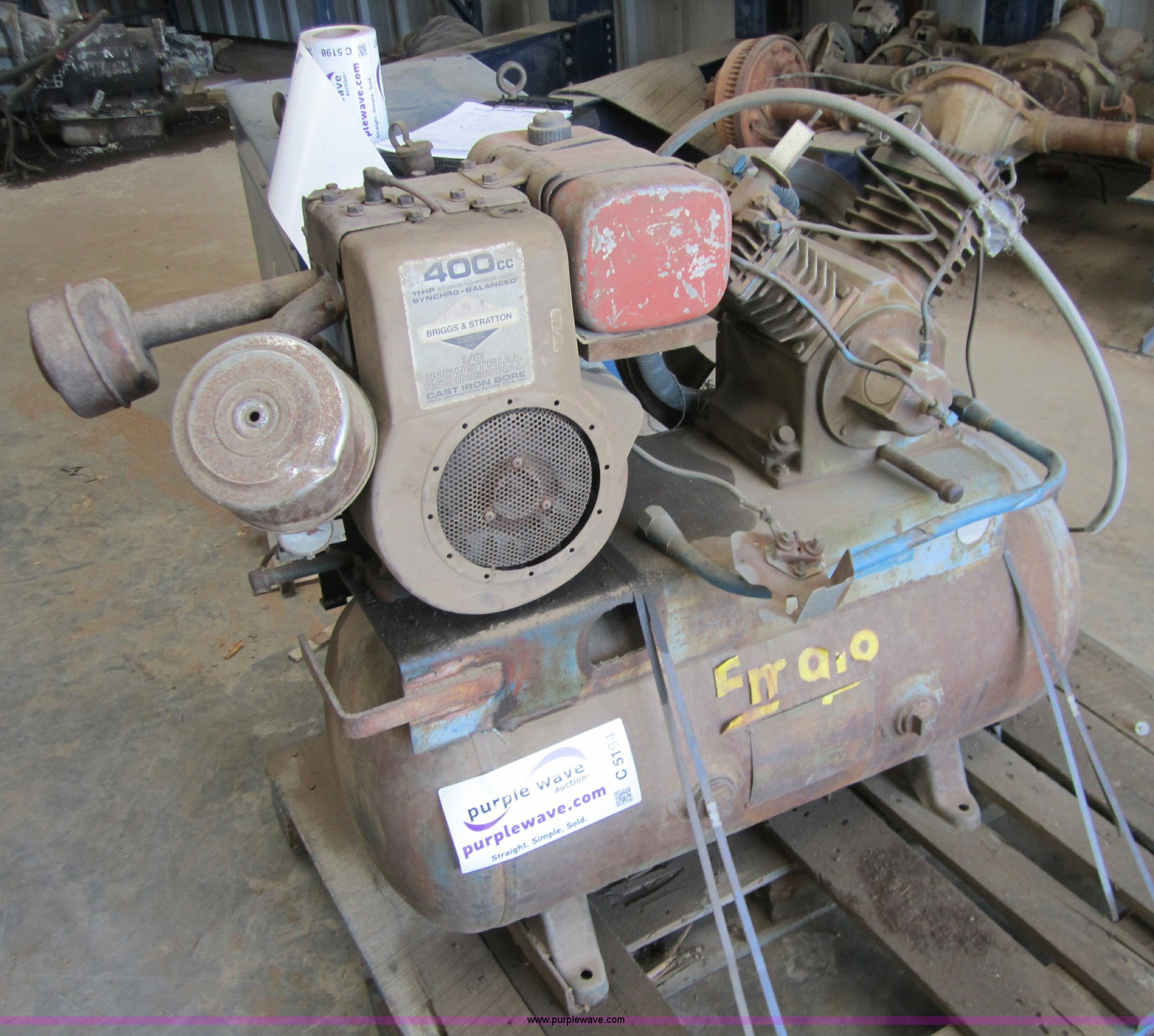 Purple Wave is selling a used Air Compressor in Oklahoma. This item is a Gas powered air compressor with the following: Briggs & Stratton 11 HP engine, Carburetor needs repair, will not draft fuel from tank, 30 gallon air tank, Compressor pump operational