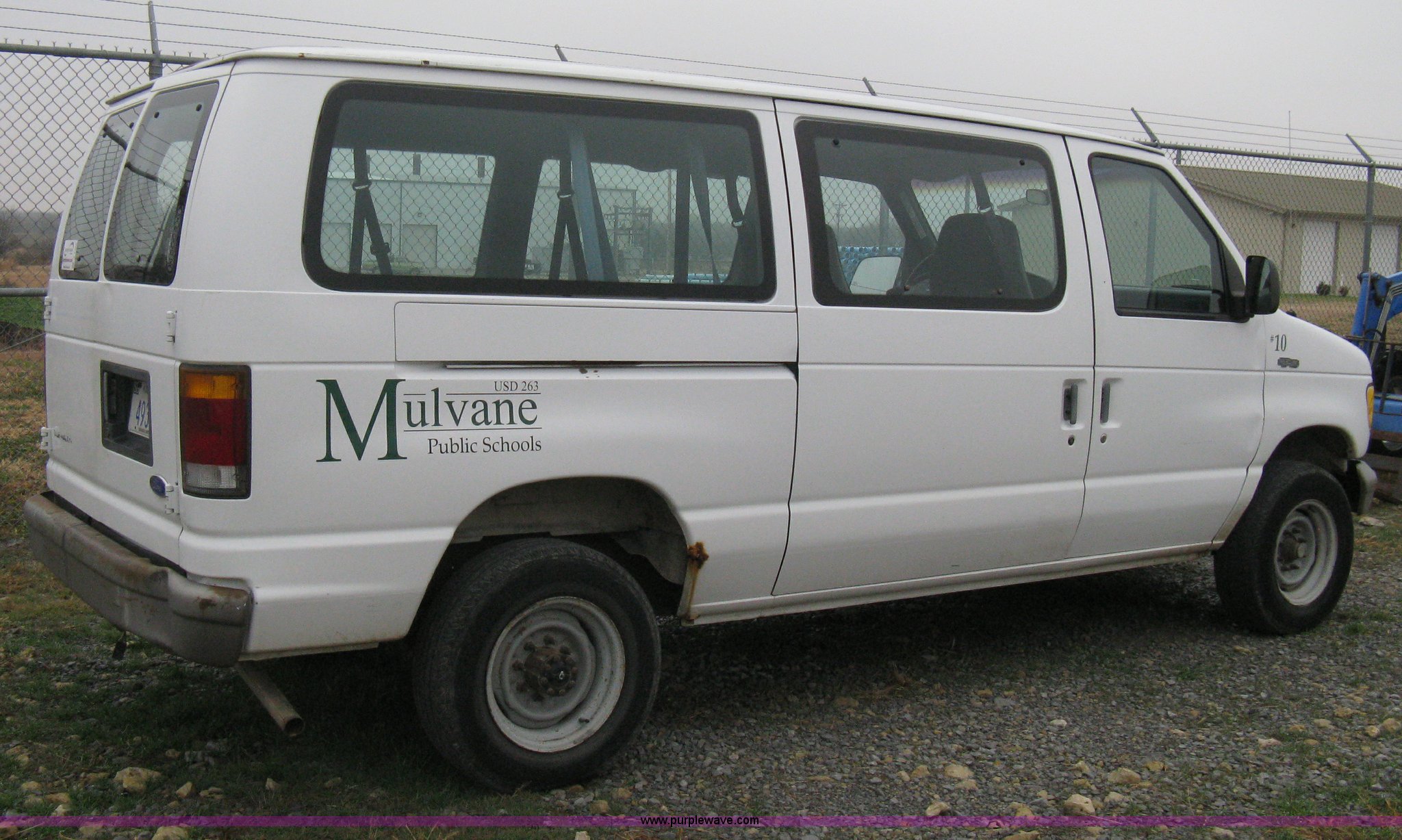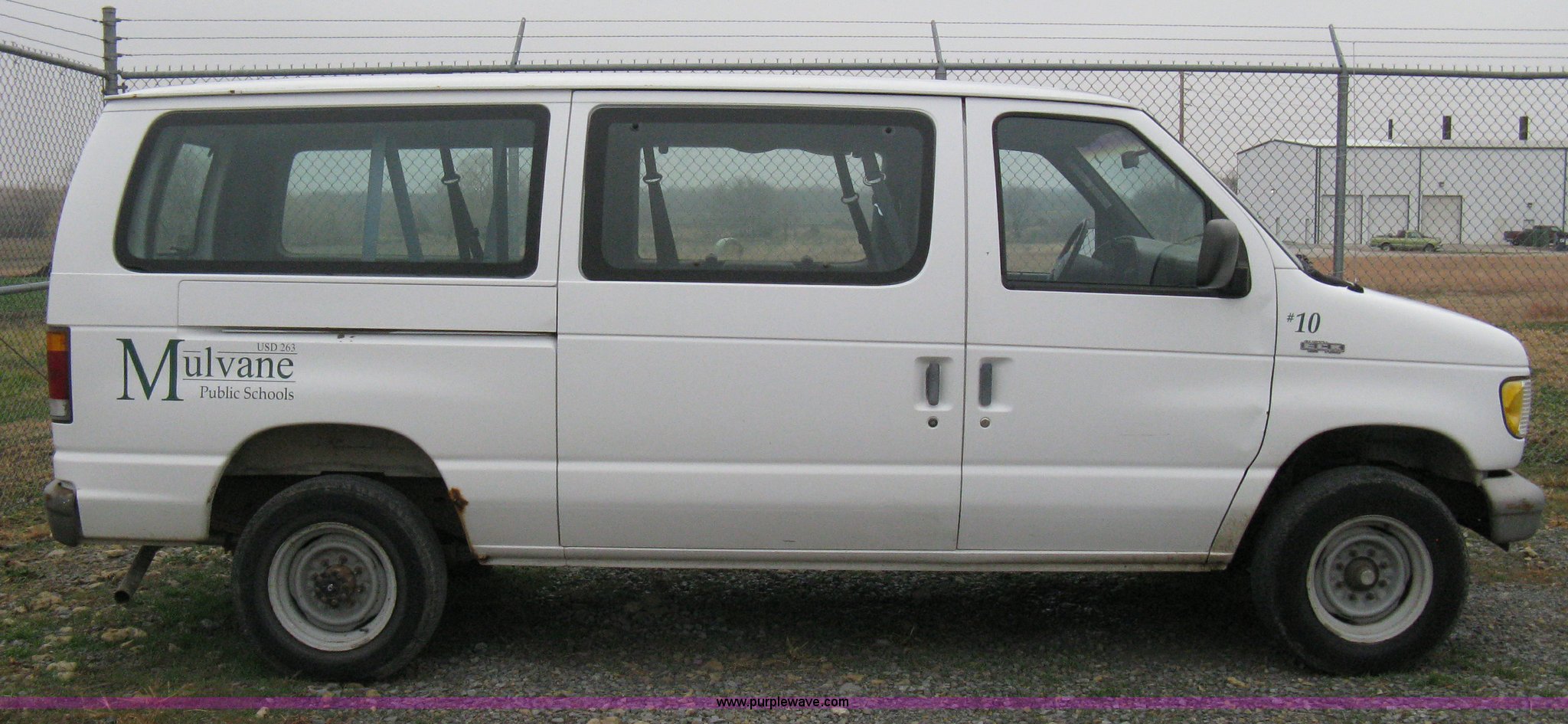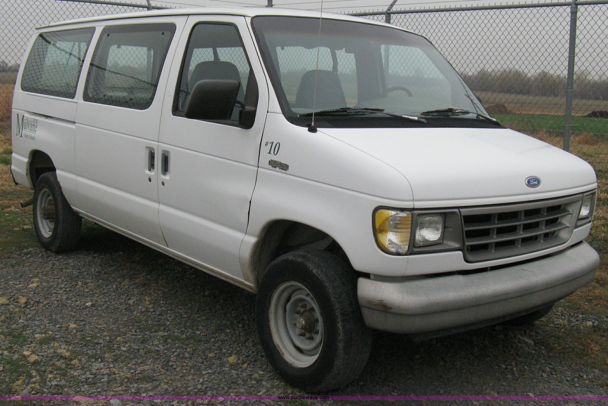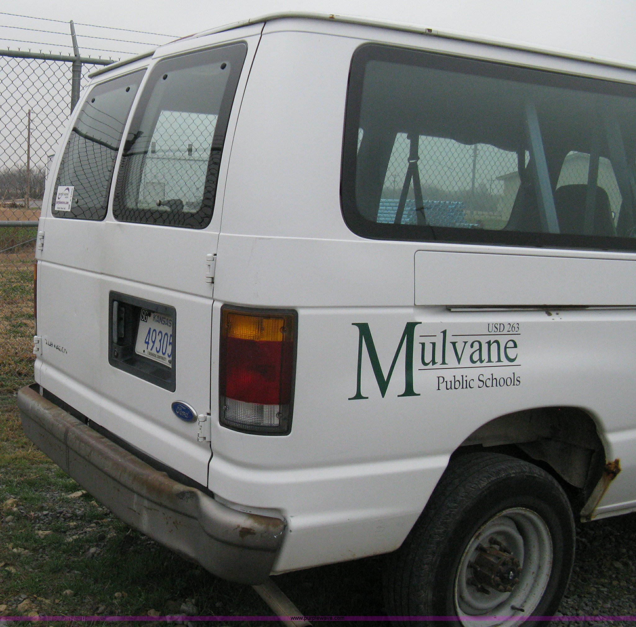 1993 Ford E350 passenger van. 120,150 miles on odometer, 4.9L I6 EFI engine, Automatic transmission, AC and heat, AM/FM, Manual windows and locks, P235/75R16 tires, Cracked windshield, Rear door sprung, does latch shut, Rear seats removed, Battery needs replaced. 1FBHE31Y4PHA91302. Mulvane School Dist.. 10080 E 111th St S.. Mulvane, KS 67110