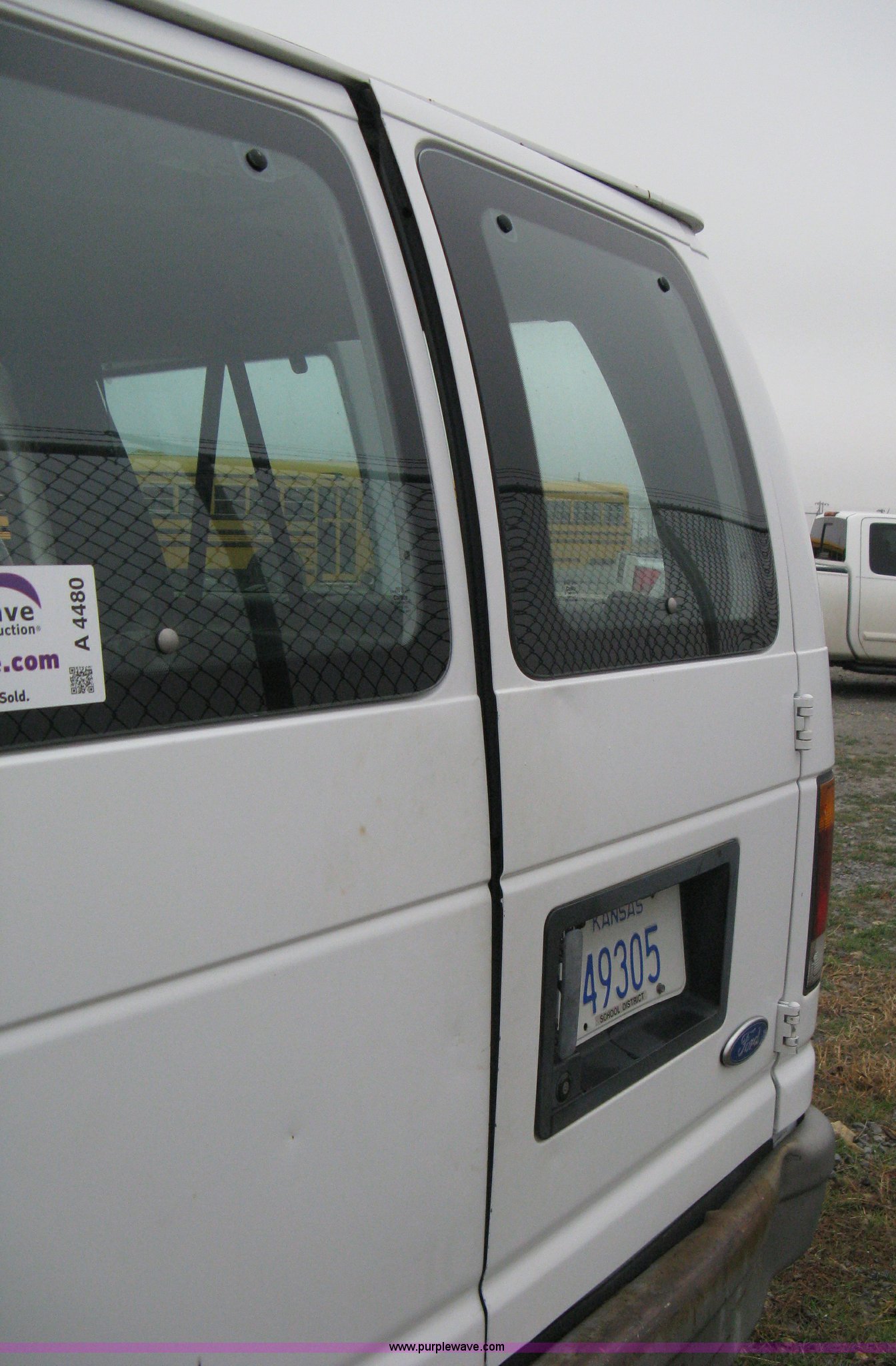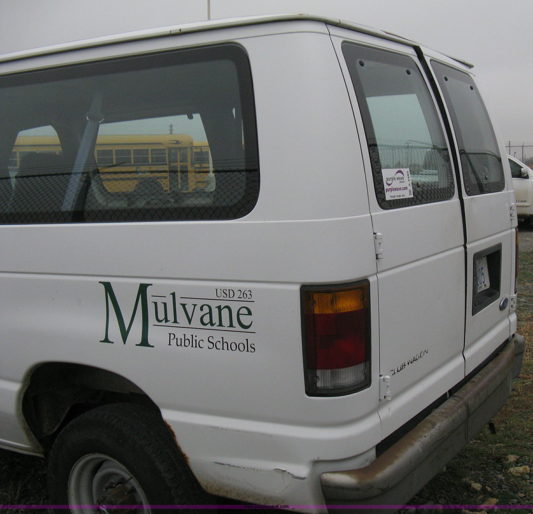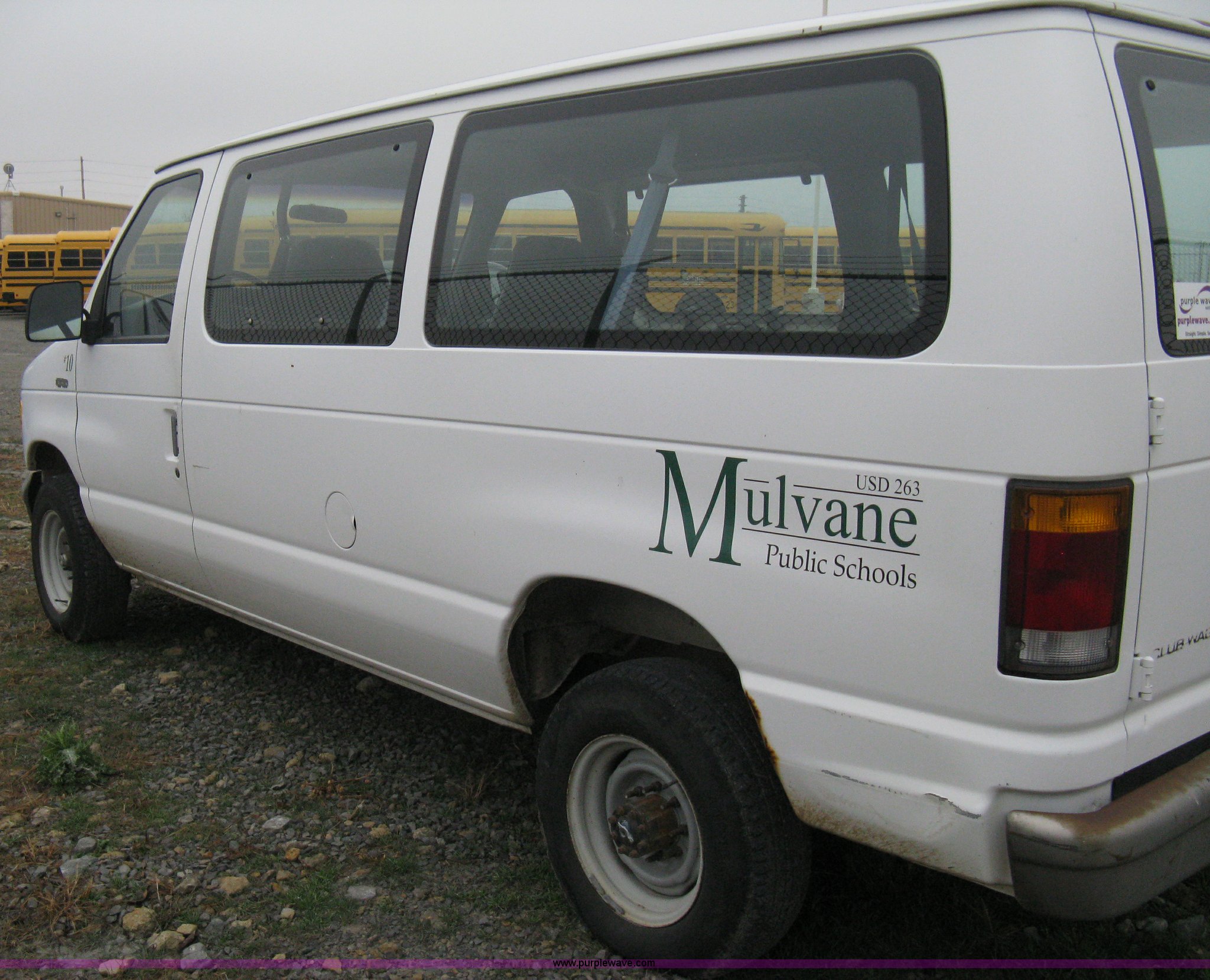 1993 Ford E350 passenger van. 120,150 miles on odometer, 4.9L I6 EFI engine, Automatic transmission, AC and heat, AM/FM, Manual windows and locks, P235/75R16 tires, Cracked windshield, Rear door sprung, does latch shut, Rear seats removed, Battery needs replaced. 1FBHE31Y4PHA91302. Mulvane School Dist.. 10080 E 111th St S.. Mulvane, KS 67110