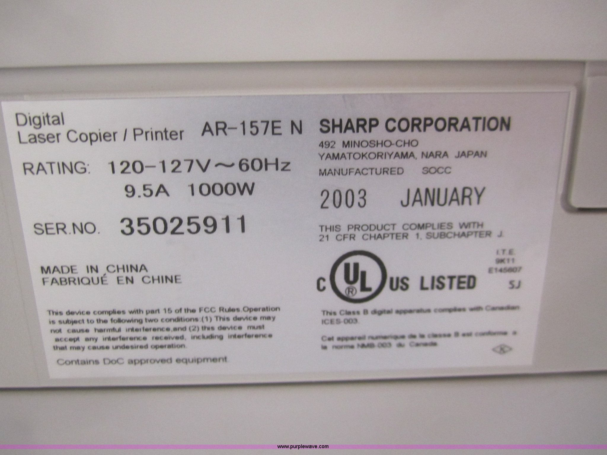 Sharp AR-157E digital image copier has sold in Scott City, Kansas for $71.50. Item B5558 sold on December 6th, 2011.