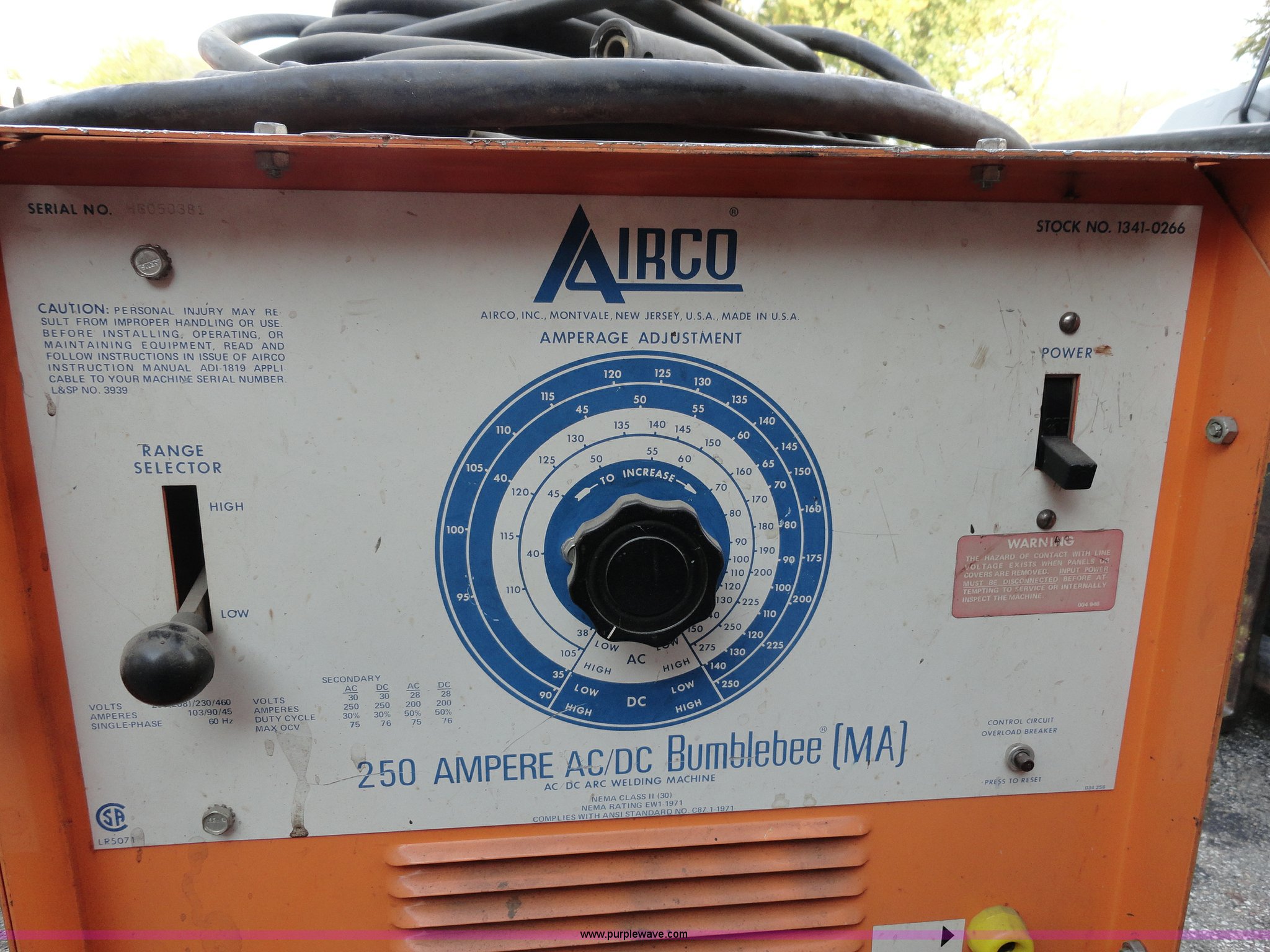 Purple Wave is selling a used Welder (Manual) in Kansas. This item is a AirCo arc welder with the following: 250 amps, AC/DC Bumble Bee, Leads included, Stock 1341-0266