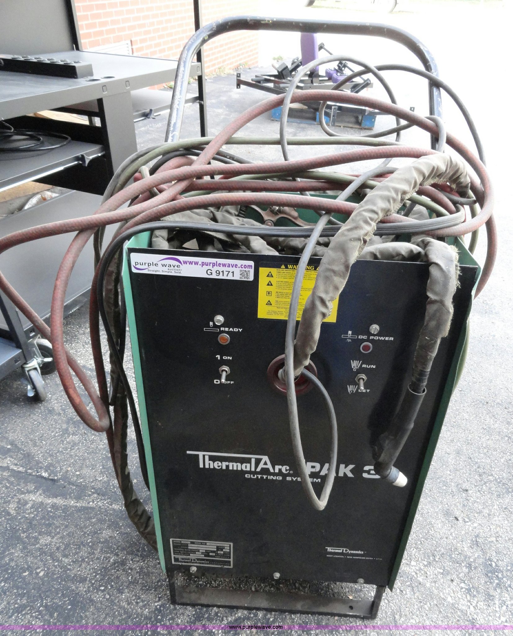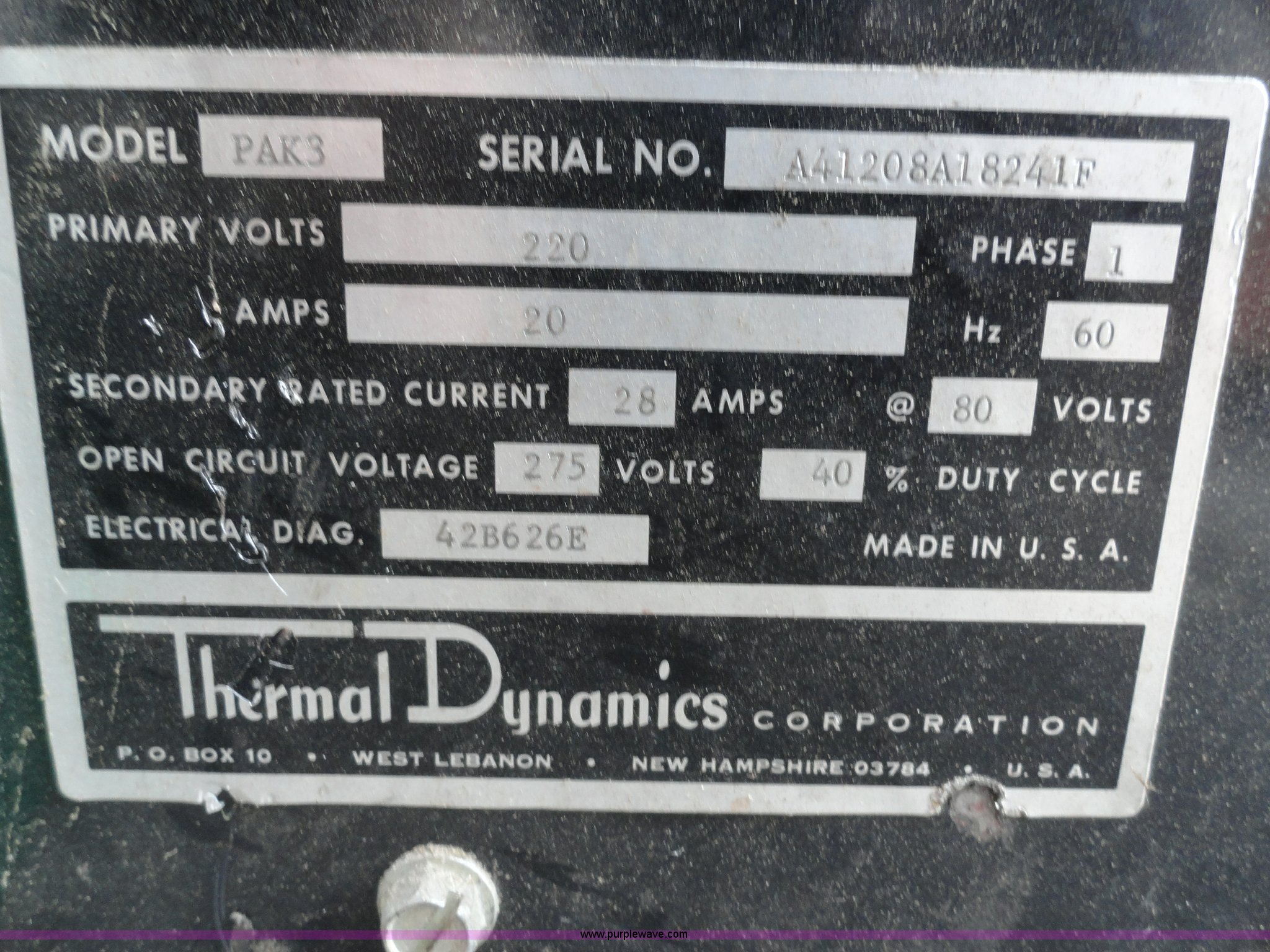 Purple Wave is selling a used Welder (Manual) in Kansas. This item is a Thermal Arc Pak 3 plasma cutter with the following: Single phase, Unknown working condition, Serial A41208A18241F