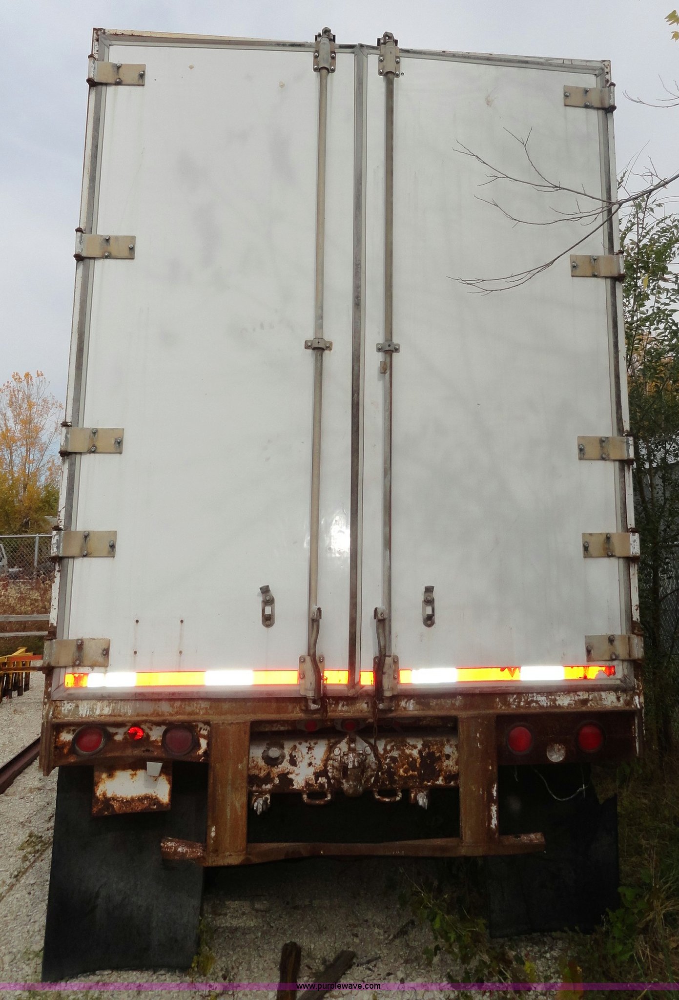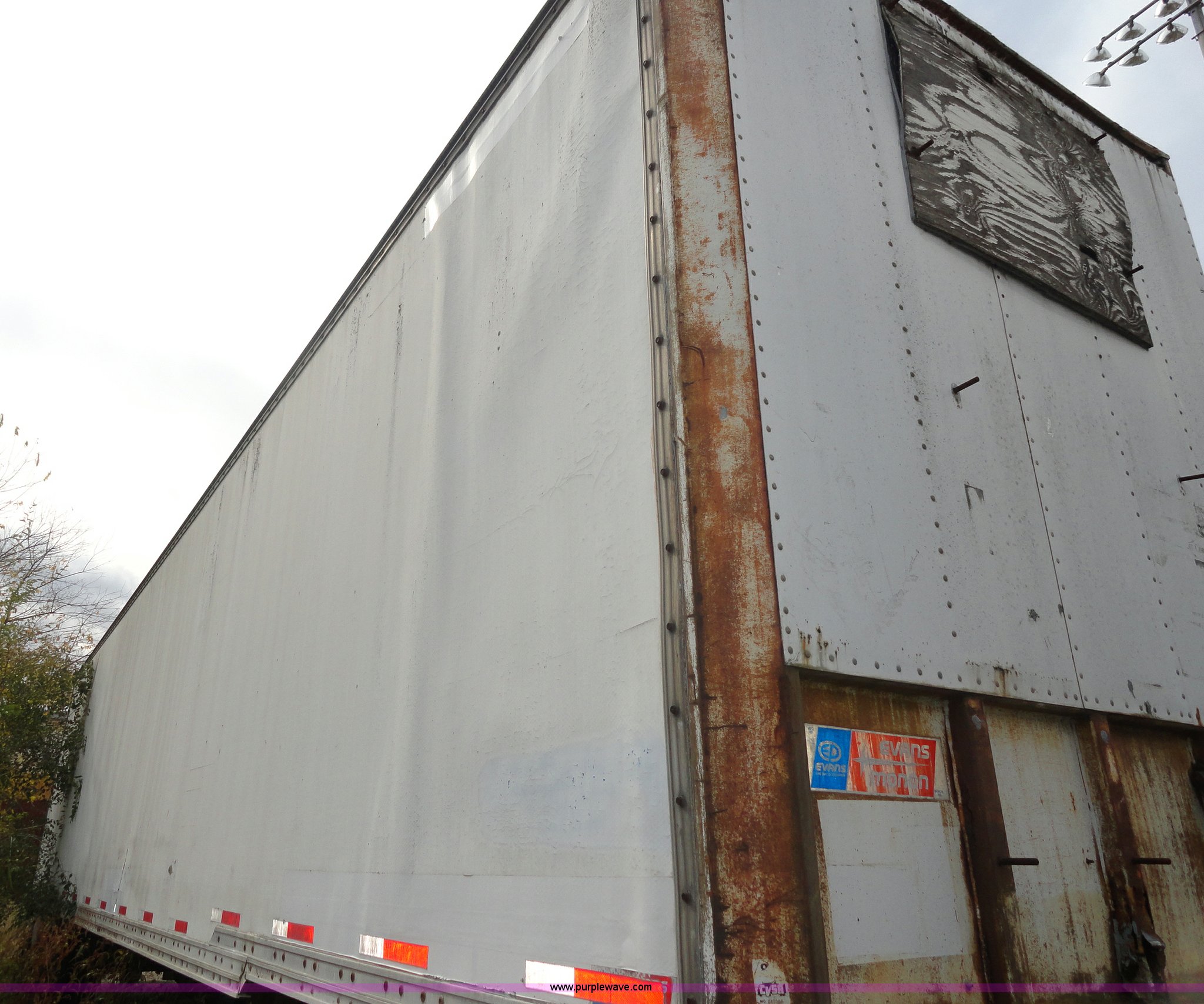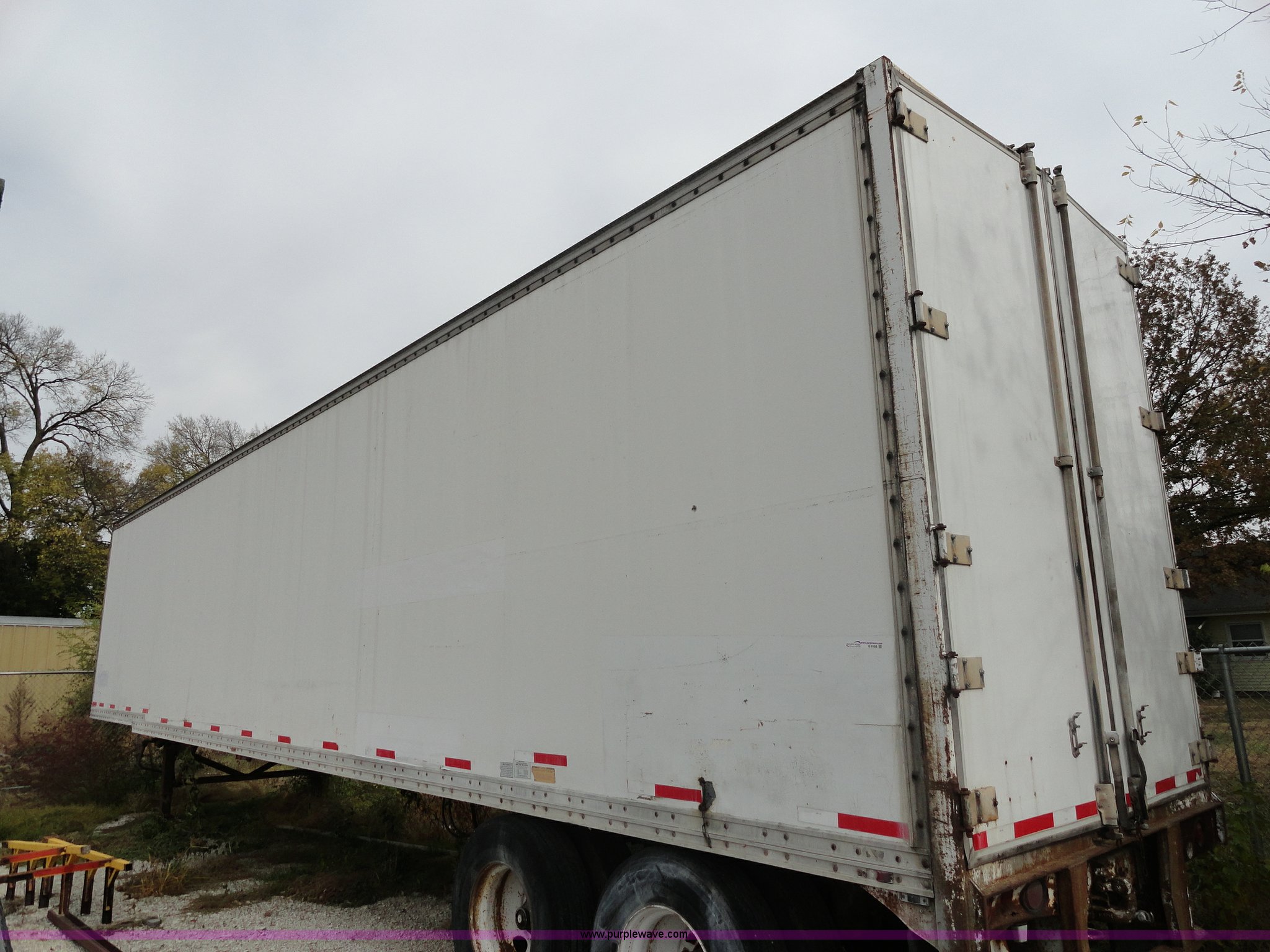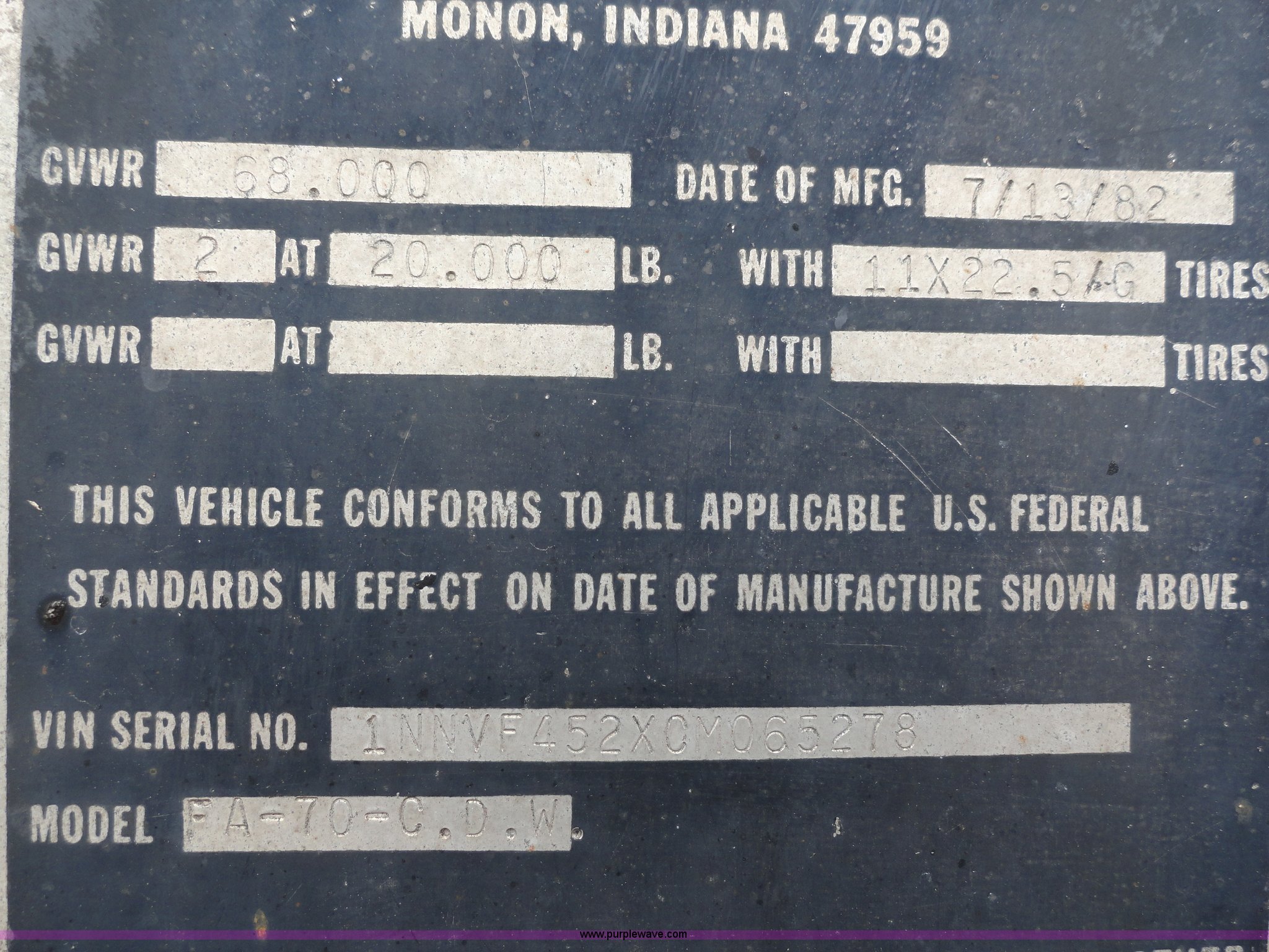 Purple Wave is selling a used Dry Van Trailer in Kansas. This item is a 1982 Monon FA-70-CDW dry van trailer with the following: 45'L x 8'W, 13.5'H, Double rear doors, Wood floor, Spring suspension, Rear pintle hitch and air hookup, 11R22.5 tires, GVWR 68,000 lbs, Used as storage, Holes in front of trailer, Frame rust