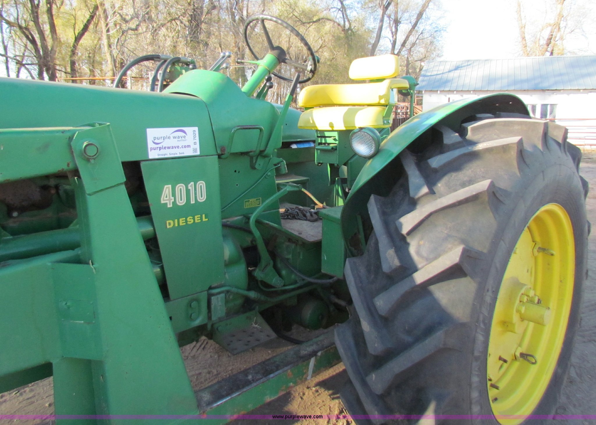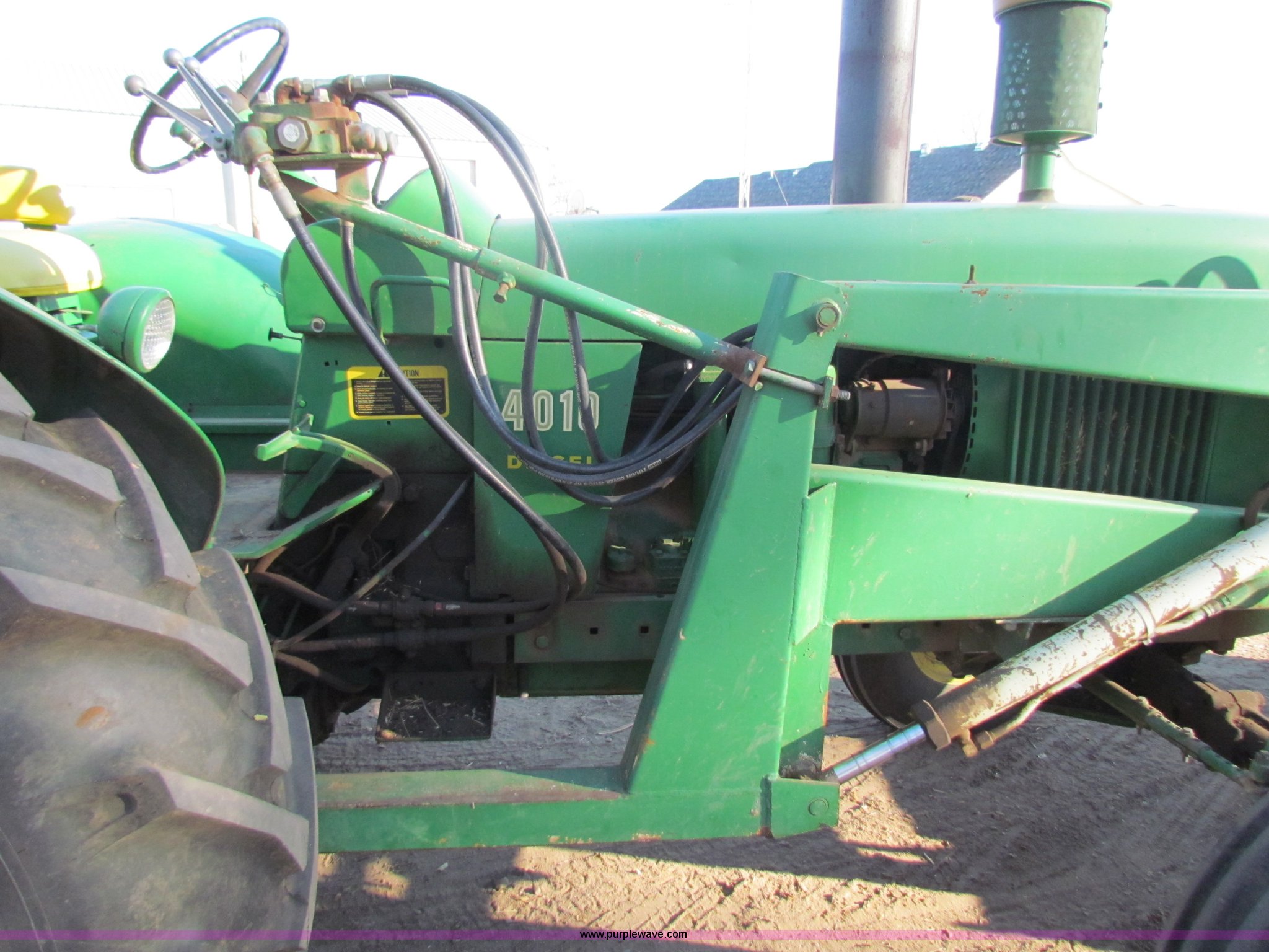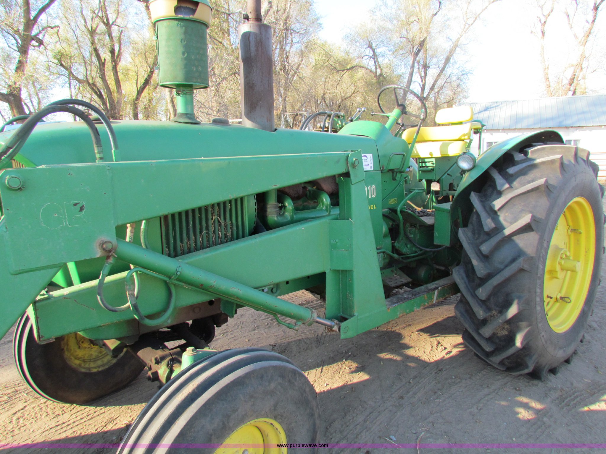 Purple Wave is selling a used Tractor in Kansas. This item is a 1961 John Deere 4010 tractor with the following: 4,010 hours on meter, 1,000 hours on new engine, clutch, pressure plate, and throw out bearing, Three point, 540/1000 PTO, (2) hydraulic remote sets, GB loader with 6' bucket, Quick connect bucket system, Bale spike, New rear wheels, New 18.4-34 rear tires, 10.00-16 front tires, Serial 2211136