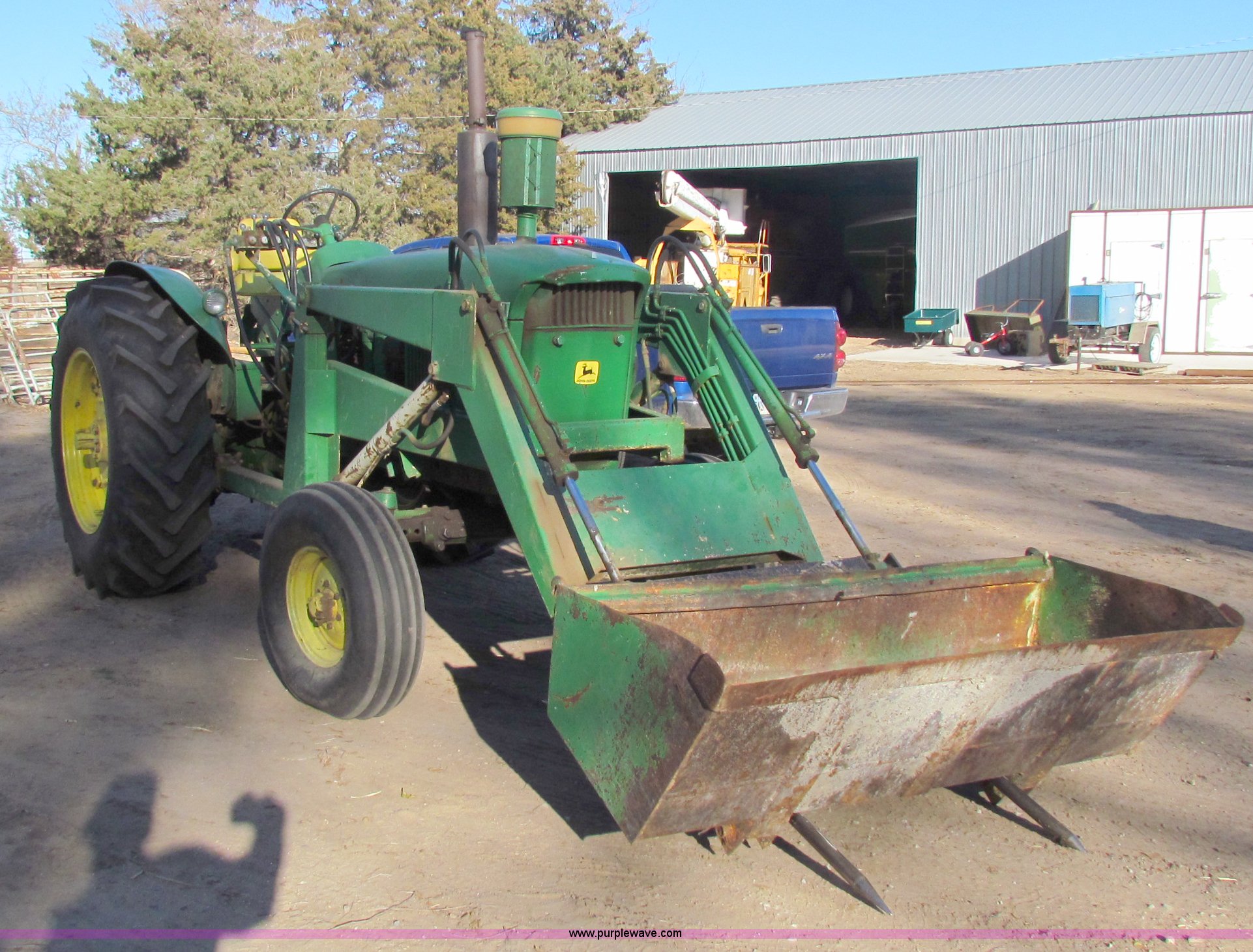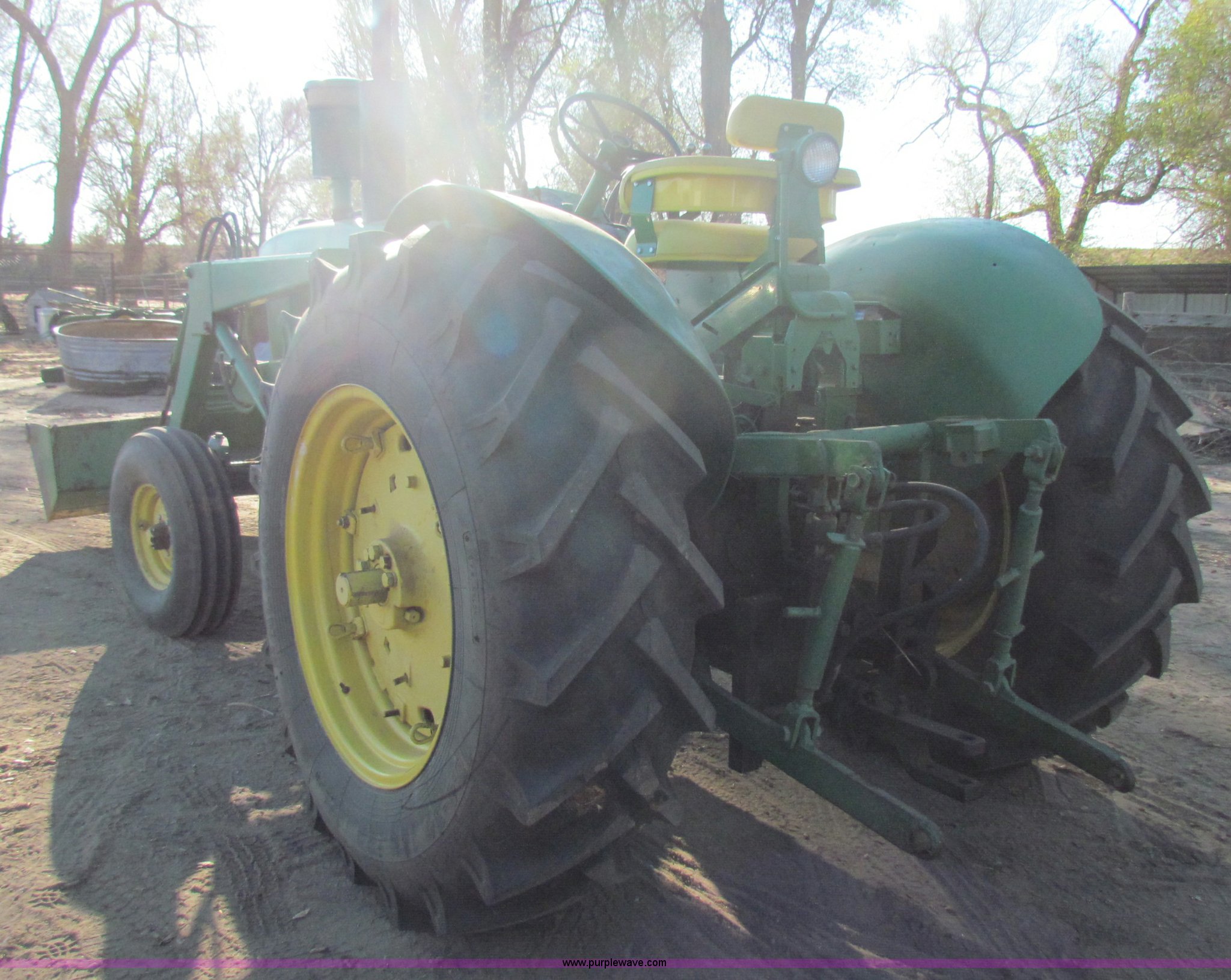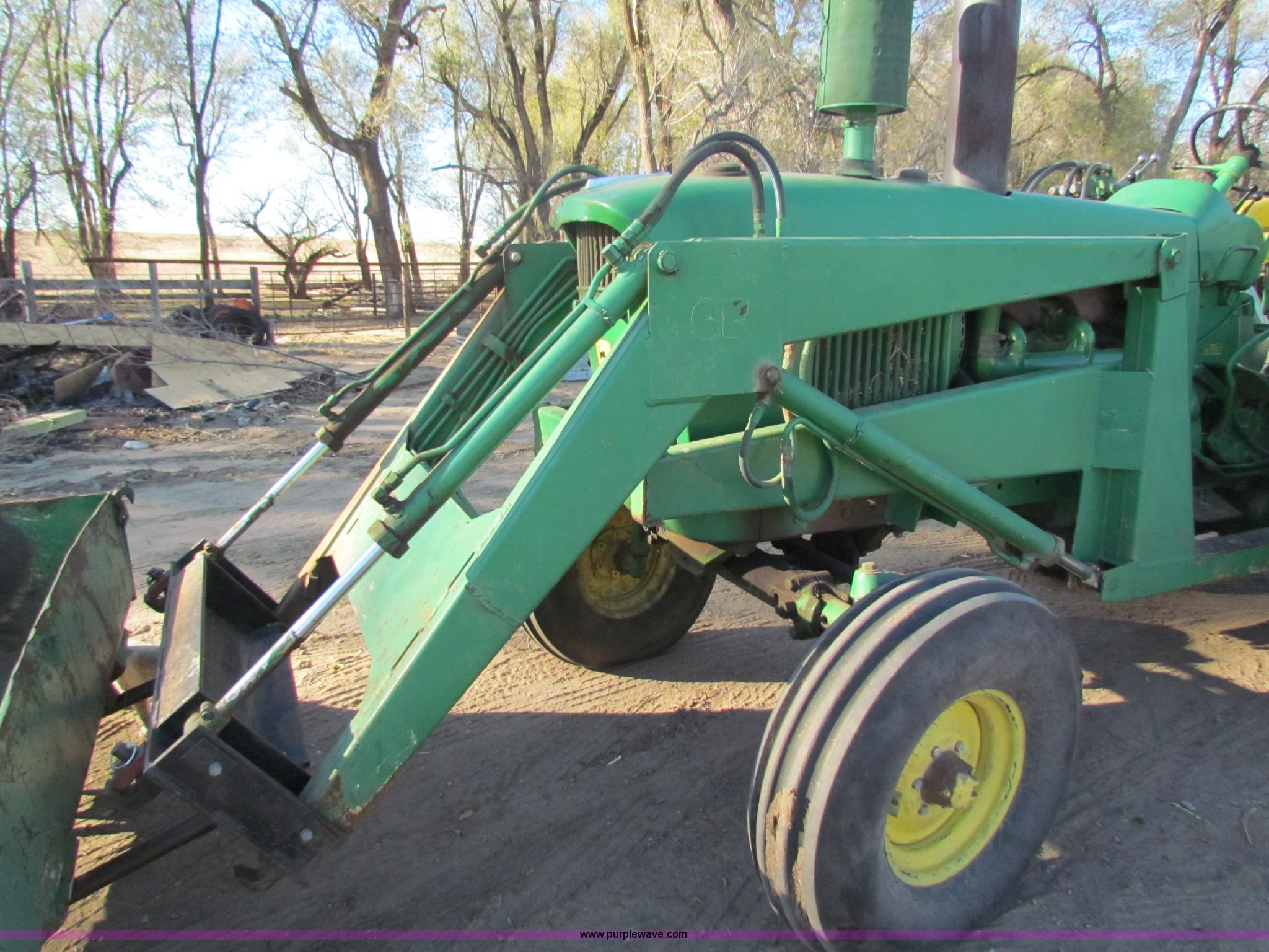 Purple Wave is selling a used Tractor in Kansas. This item is a 1961 John Deere 4010 tractor with the following: 4,010 hours on meter, 1,000 hours on new engine, clutch, pressure plate, and throw out bearing, Three point, 540/1000 PTO, (2) hydraulic remote sets, GB loader with 6' bucket, Quick connect bucket system, Bale spike, New rear wheels, New 18.4-34 rear tires, 10.00-16 front tires, Serial 2211136
