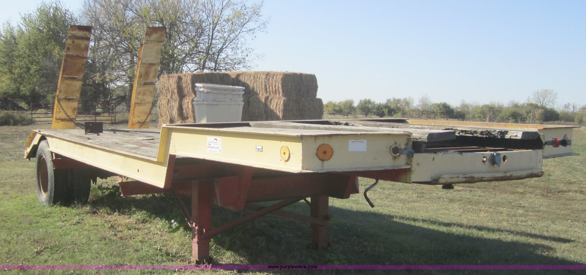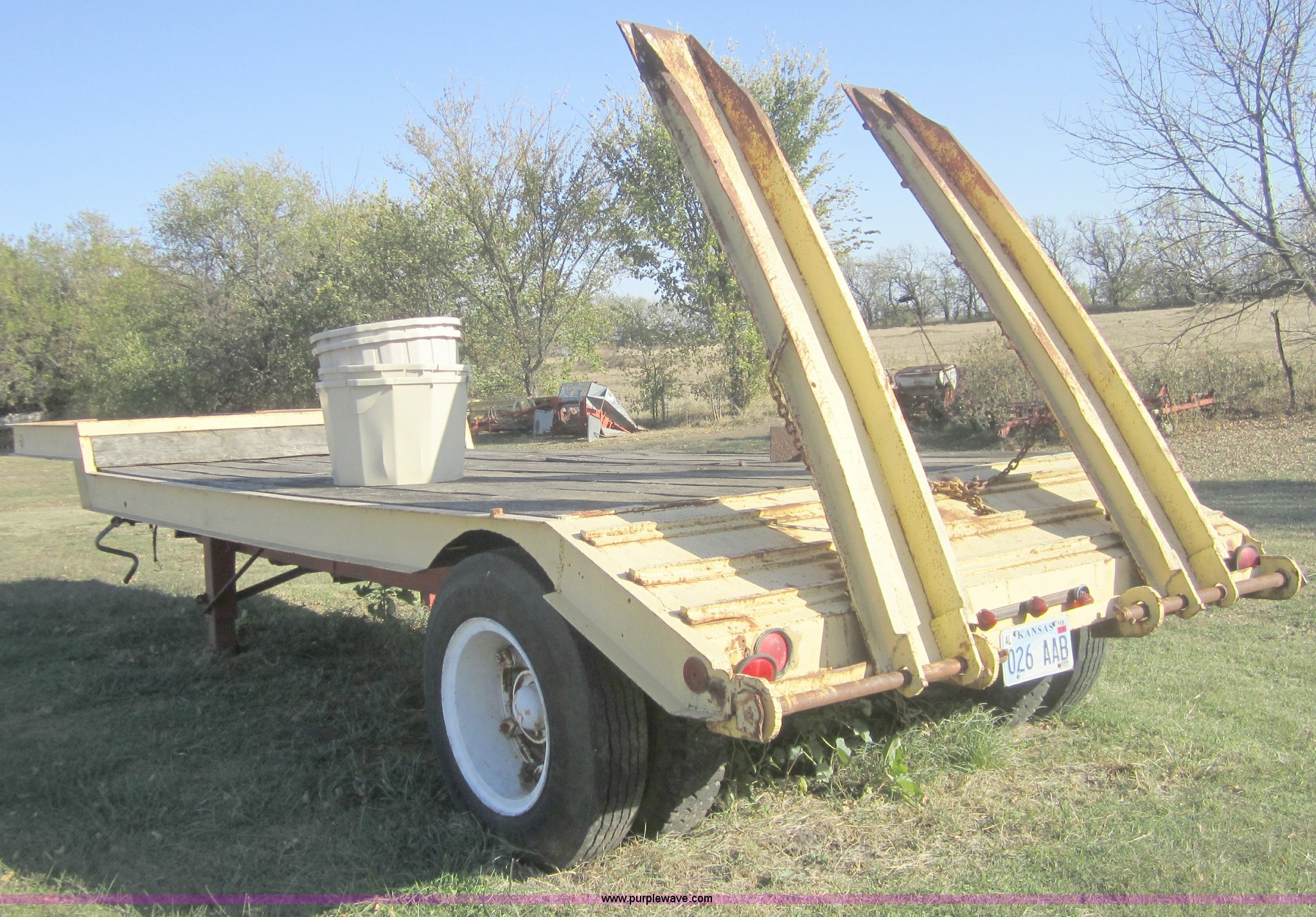 Purple Wave is selling a used Flat or Drop Deck Trailer in Kansas. This item is a 1974 24' flatbed semi trailer with the following: 17' deck, 2' dove tail with ramps, 7' nose, Wood deck, 8.25R20 tires, Brakes not working