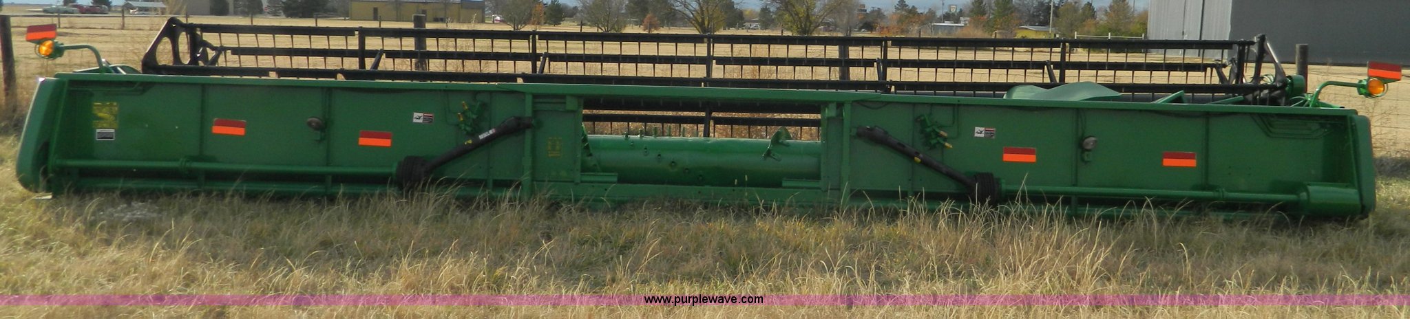 Purple Wave is selling a used Platform or Stripper Head in Kansas. This item is a 2000 John Deere 930F 30' flex head with the following: Contour Master, Full finger auger, Tined reel, Row crop dividers, Recently painted, Serial H00930F691180