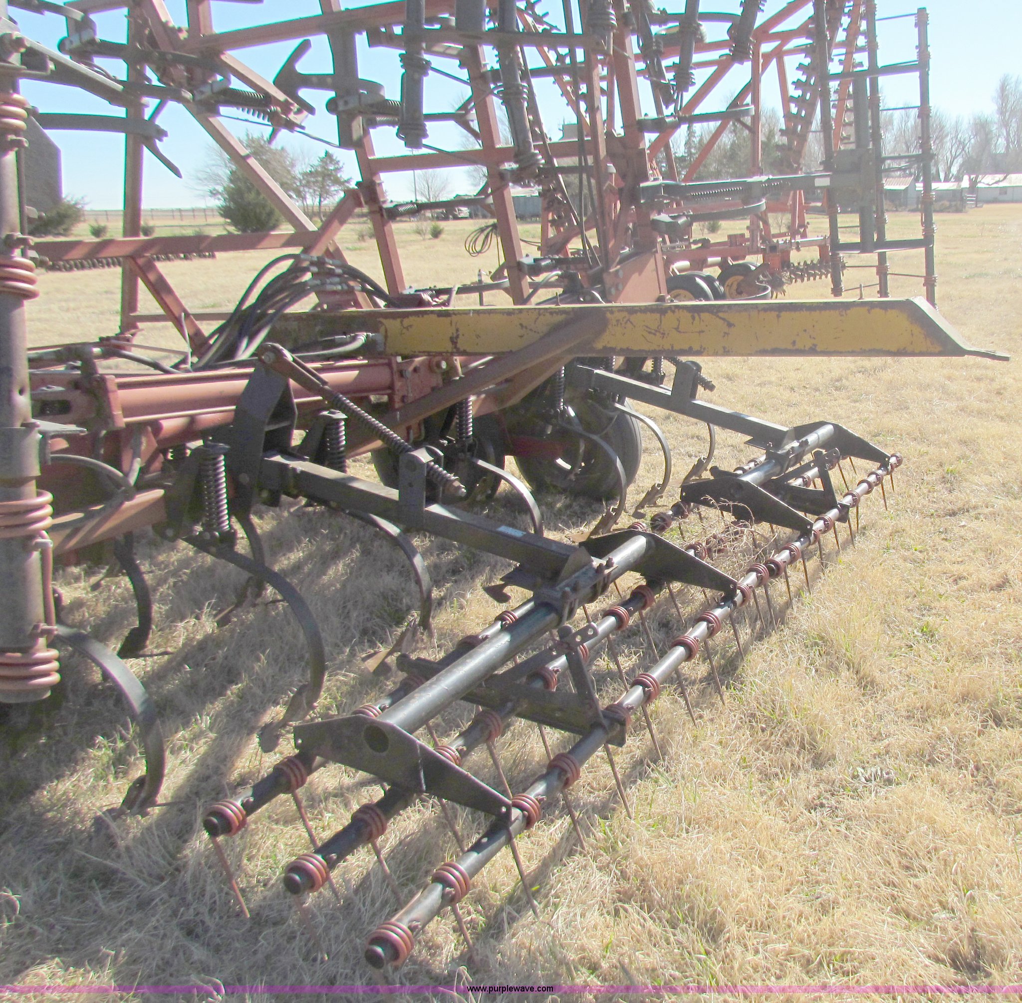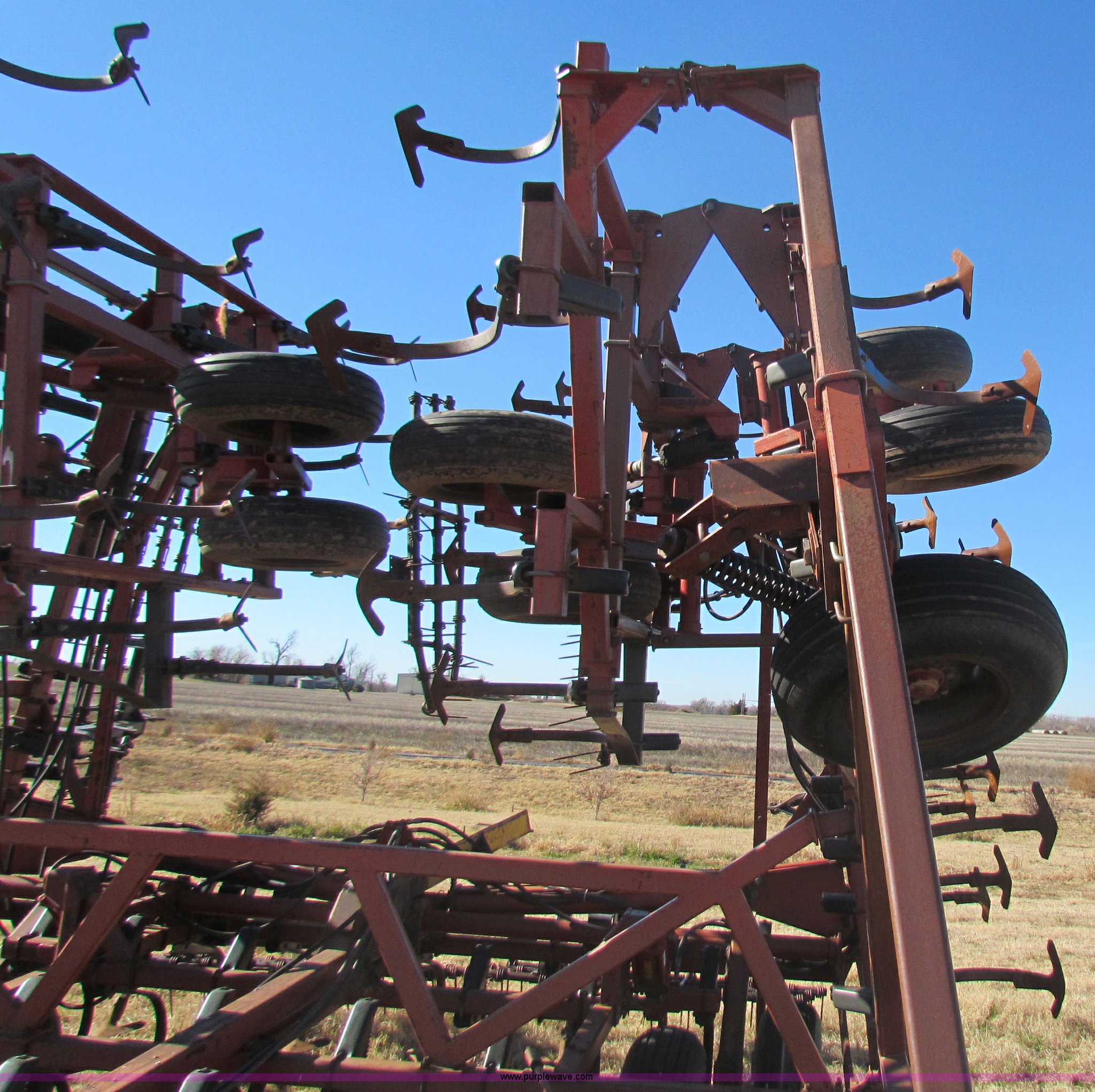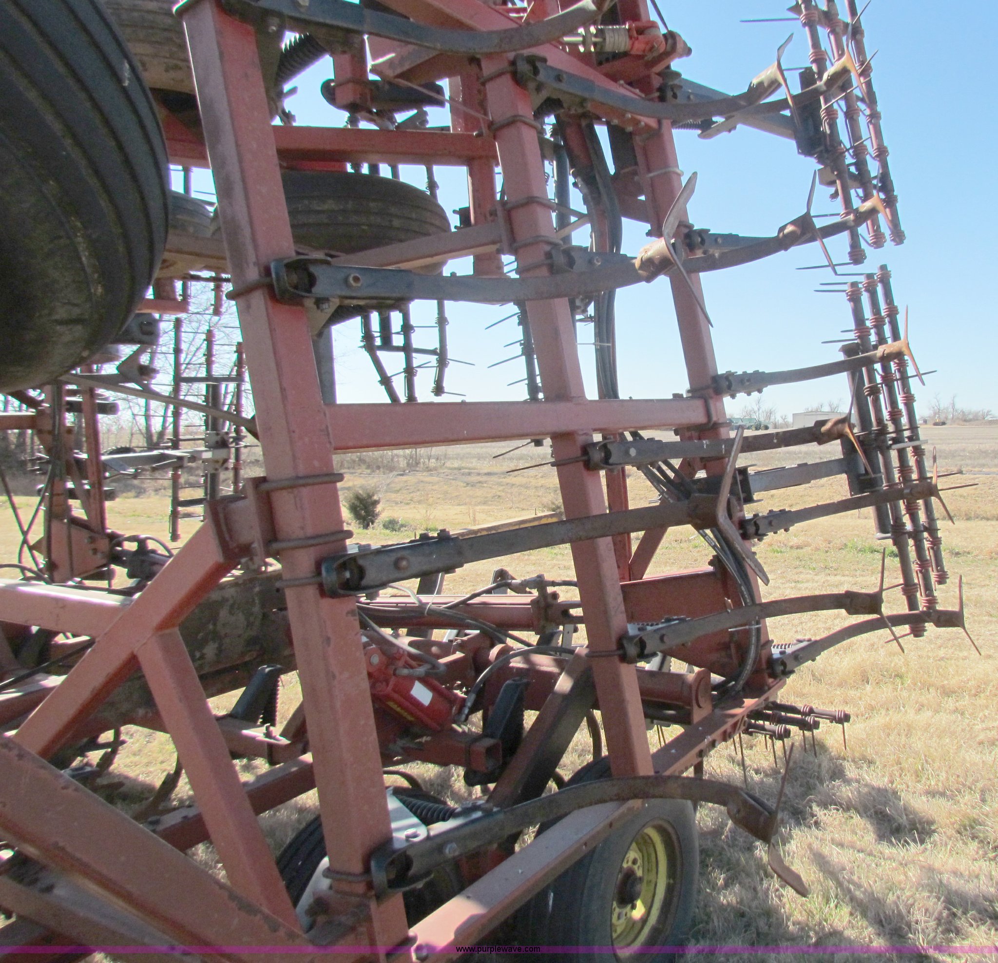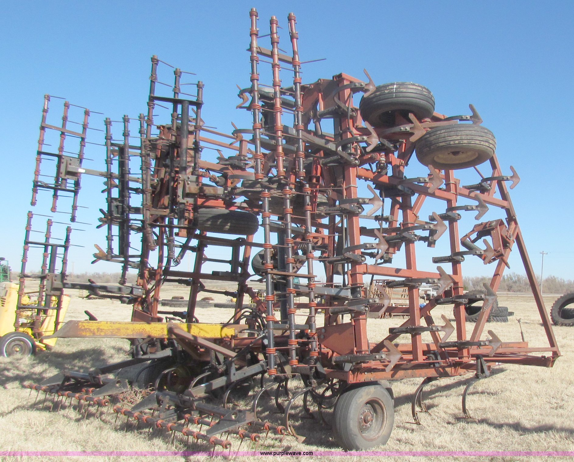 Purple Wave is selling a used Field Cultivator or Sweep Plow in Kansas. This item is a Hiniker 42' field cultivator with the following: (5) sections, Three-bar coil tine harrow, Knock on sweeps, Rear hitch, 9.5-L15 tires, Some tires been replaced, Main frame cylinder been replaced