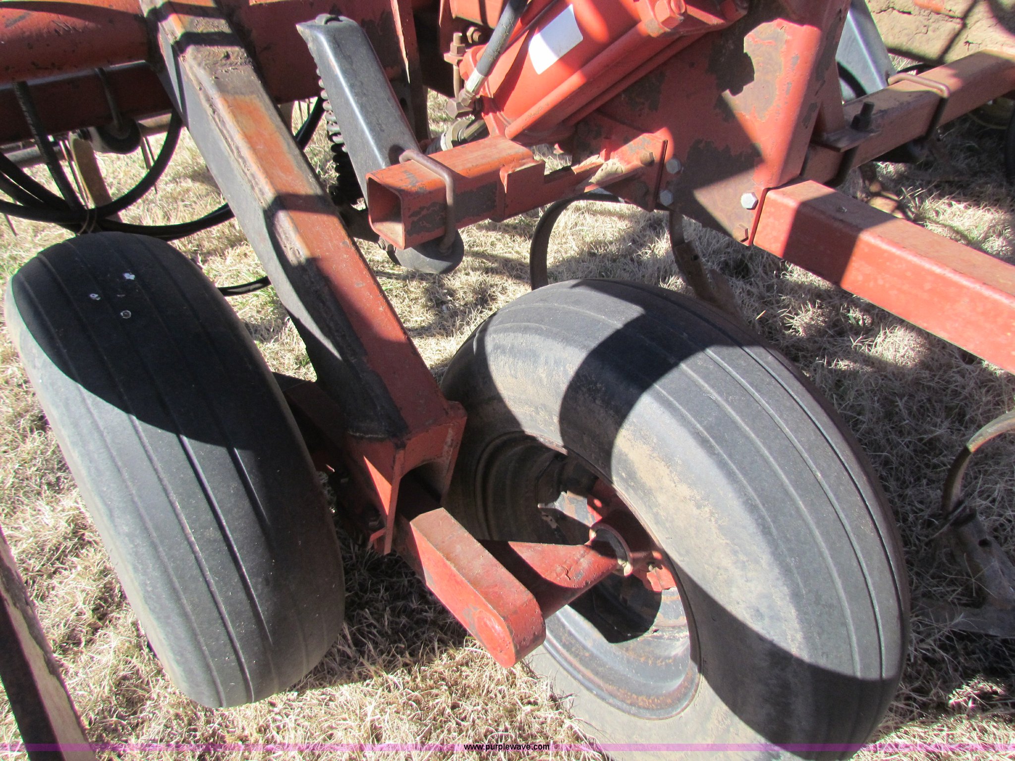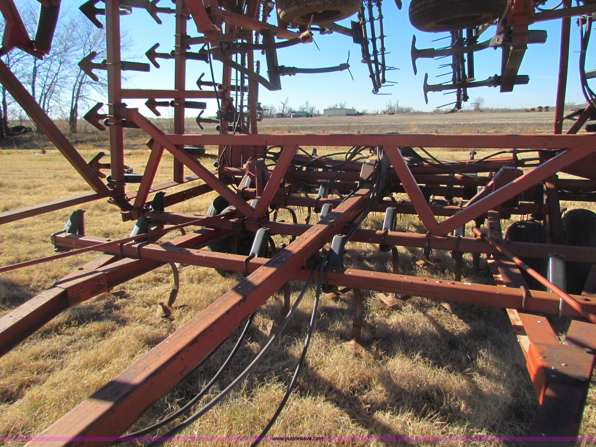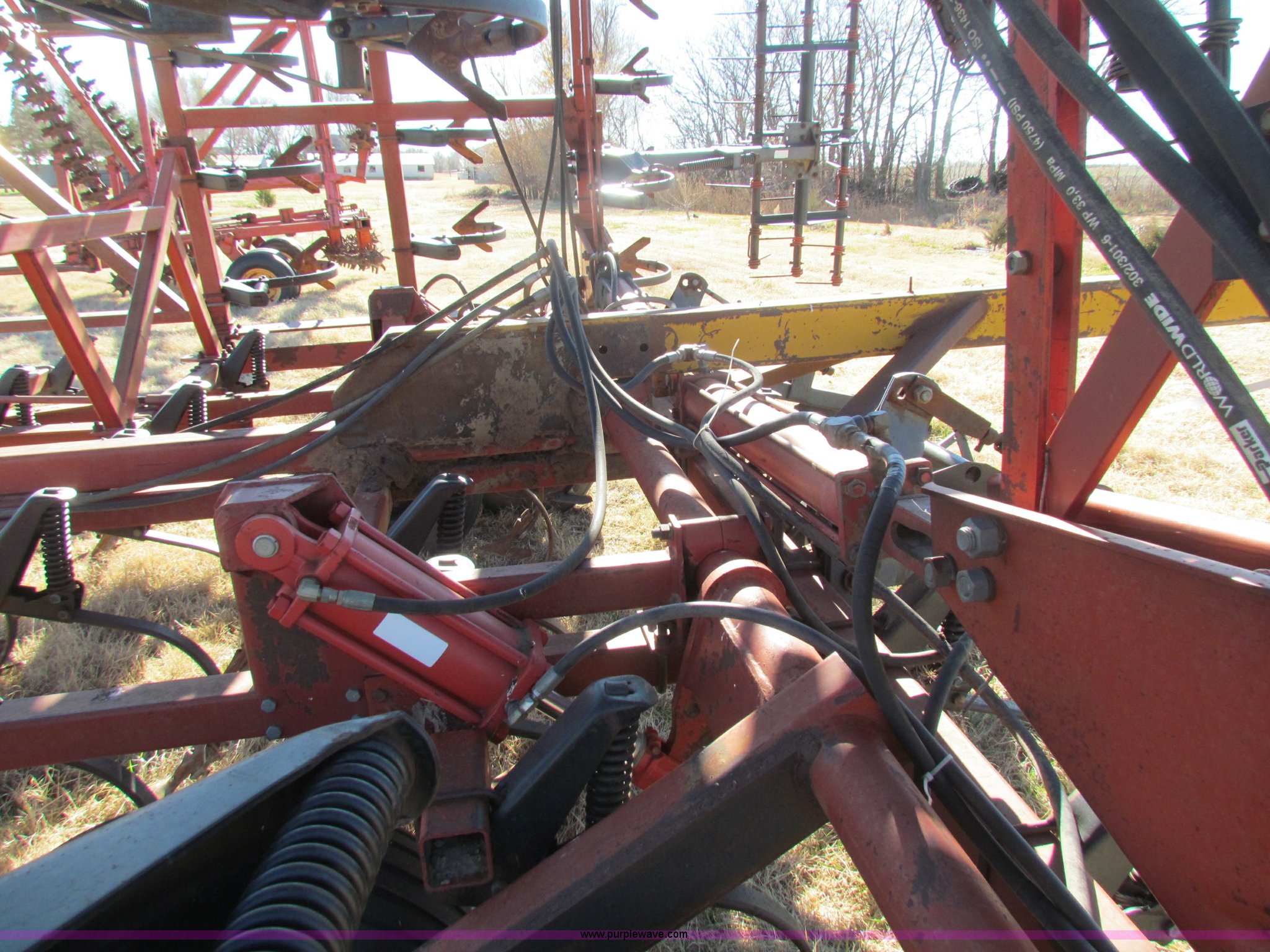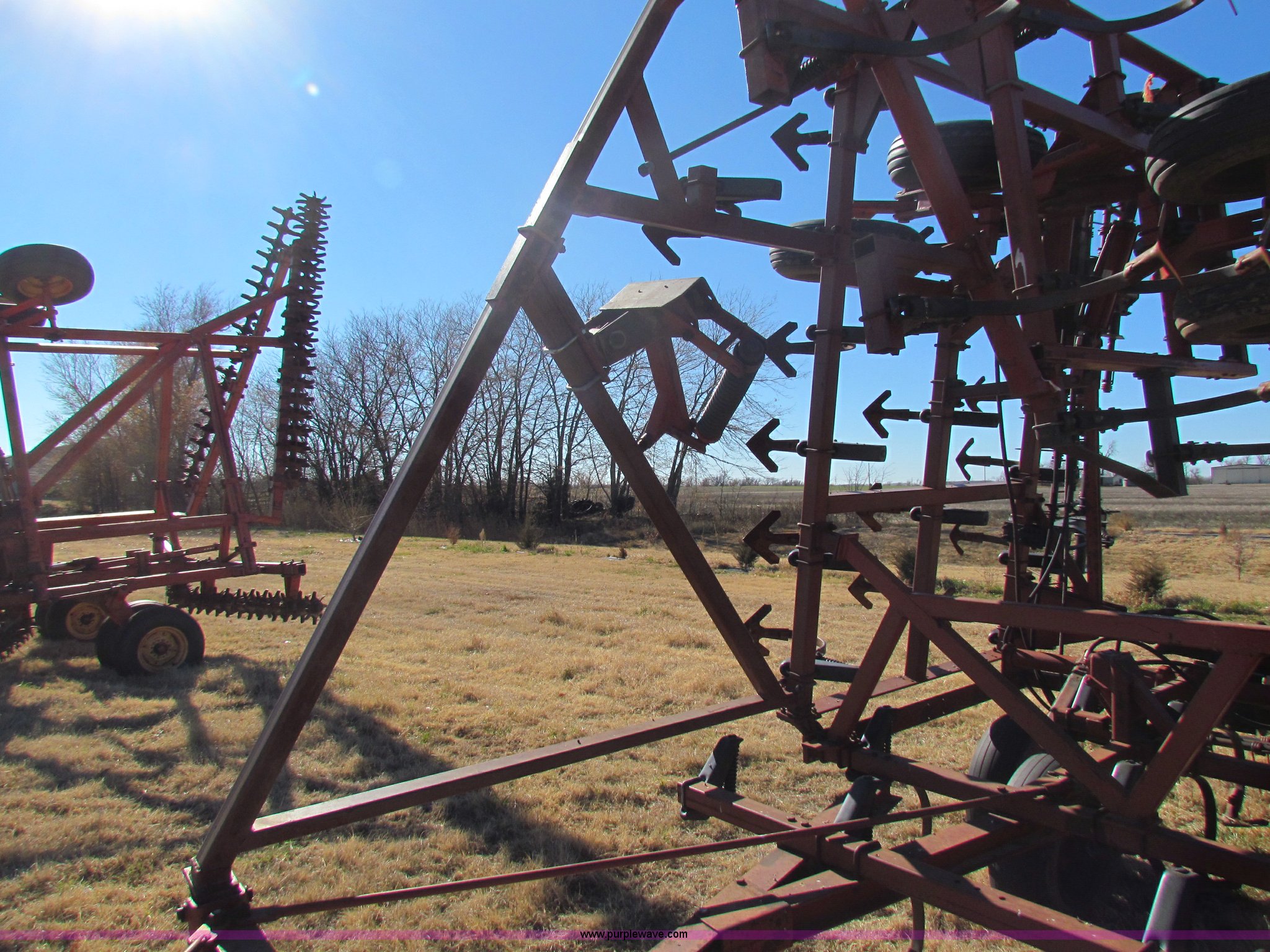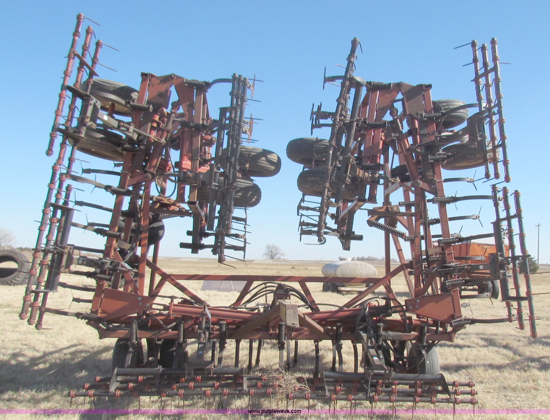 Purple Wave is selling a used Field Cultivator or Sweep Plow in Kansas. This item is a Hiniker 42' field cultivator with the following: (5) sections, Three-bar coil tine harrow, Knock on sweeps, Rear hitch, 9.5-L15 tires, Some tires been replaced, Main frame cylinder been replaced