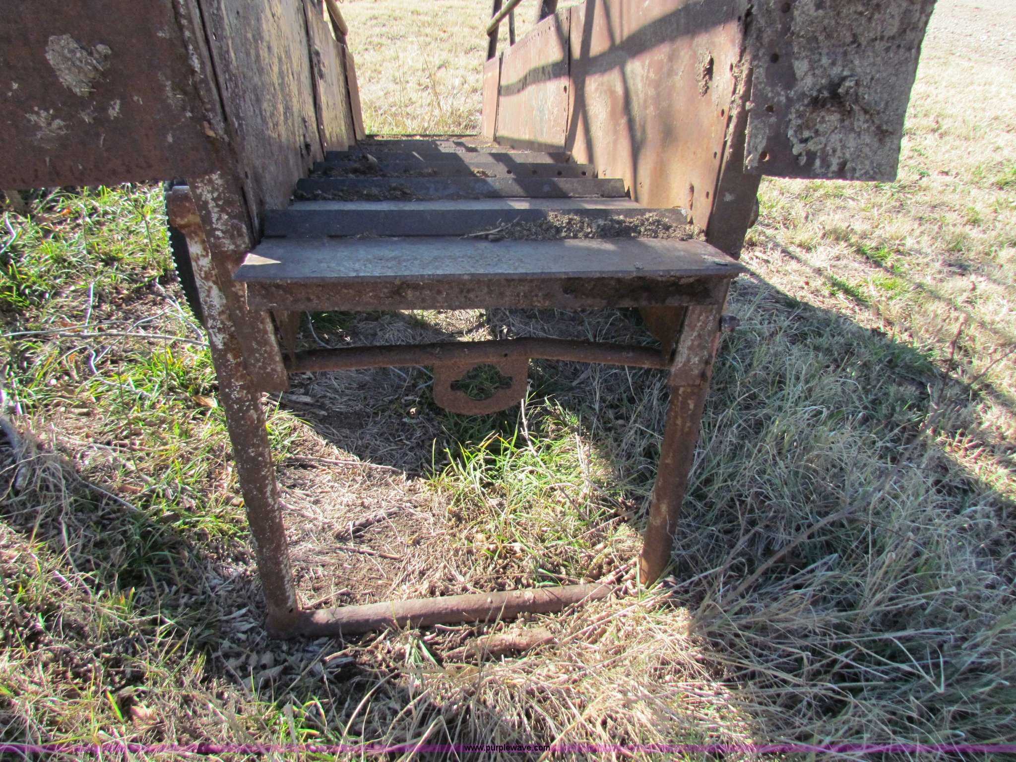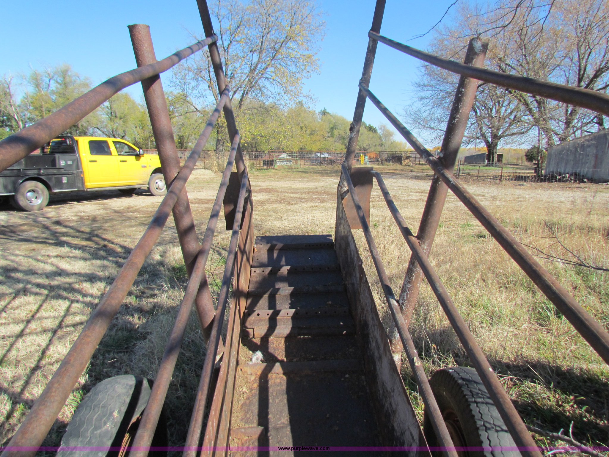 Purple Wave is selling a used Livestock Equip. in Kansas. This item is a Cattle loading chute with the following: 10'L x 24"W, Steel floor, 7.50-16 tires
