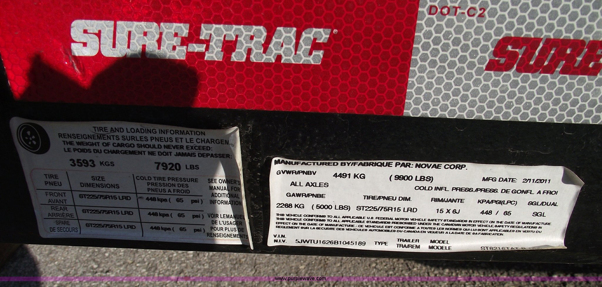 2011 Sure Trac 16' equipment trailer. 16'L x 82"W, 13" rail, 48" heavy duty fold down ramp, (2) 5,000 lb axles, Steel fenders, (8) D-rings, Electric brakes, Safety brake-away system, Tongue jack, 2 5/16" ball, LED taillights, 225-75-15 tires, Spare tire and wheel, Cust# 310072. 5JWTU1626B1045189. Shipping quotes available. Black and Veatch. 11401 Lamar Ave. Overland Park, KS 66211