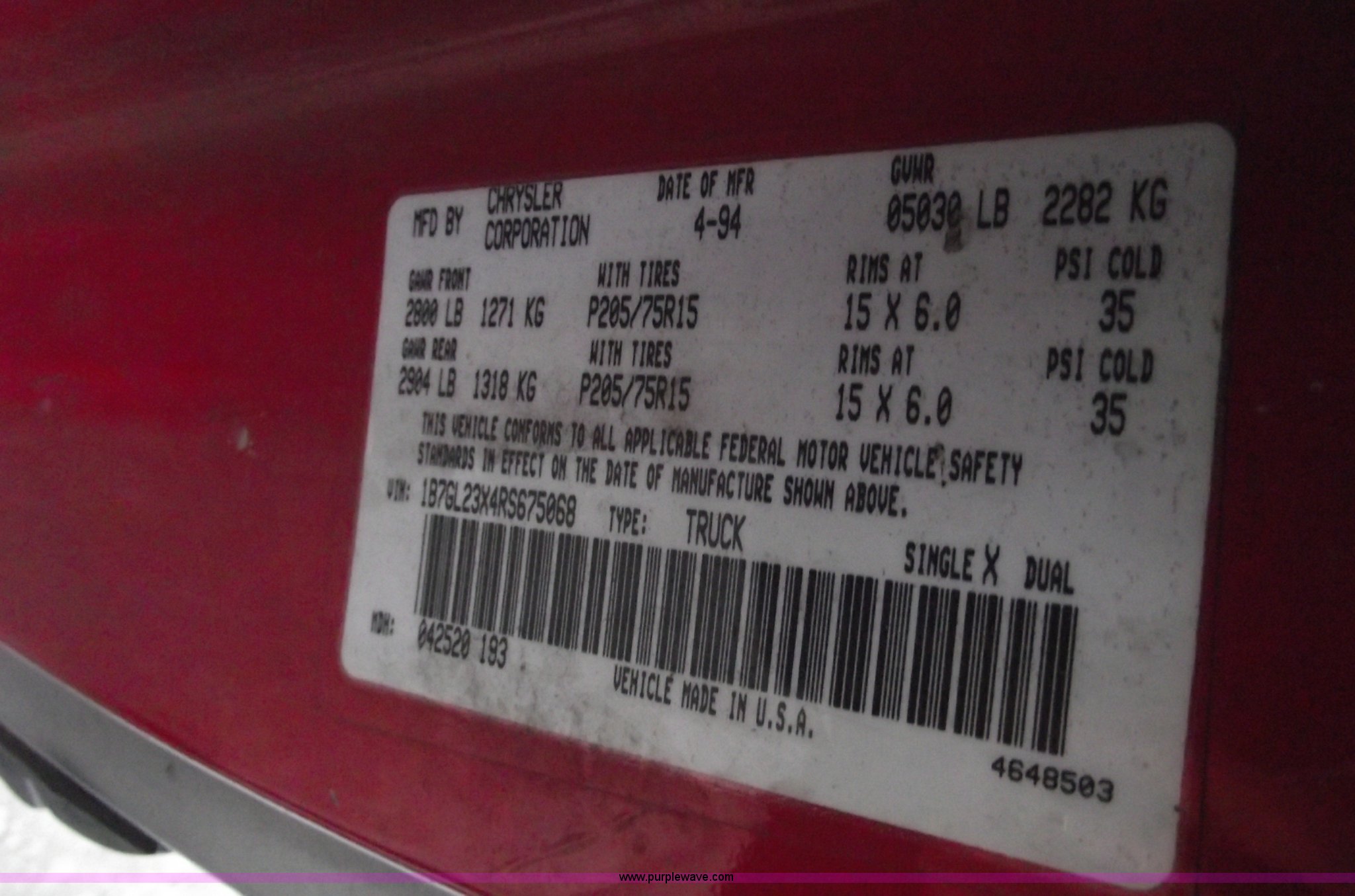 Purple Wave is selling a used Passenger Vehicle in Missouri. This item is a 1994 Dodge Dakota SLT extended cab pickup with the following: 186,435 miles on odometer, 3.9L V6 OHV 12V gas engine, Automatic transmission with overdrive, Heat and AC, Tilt and cruise, Power windows, locks and mirrors, Cloth interior, 205-75R15 tires, Aluminium wheels, Ball hitch, Trailer wiring, Bed liner, Two-tone