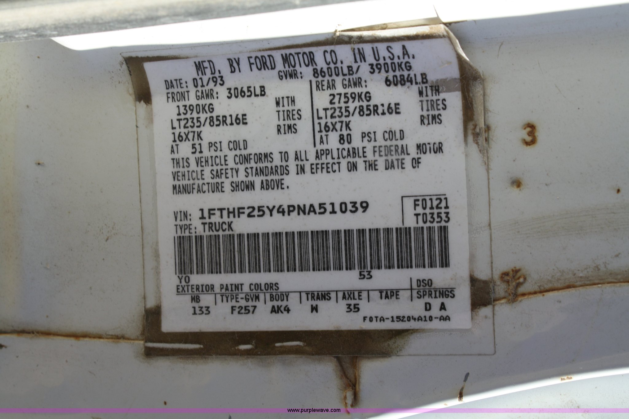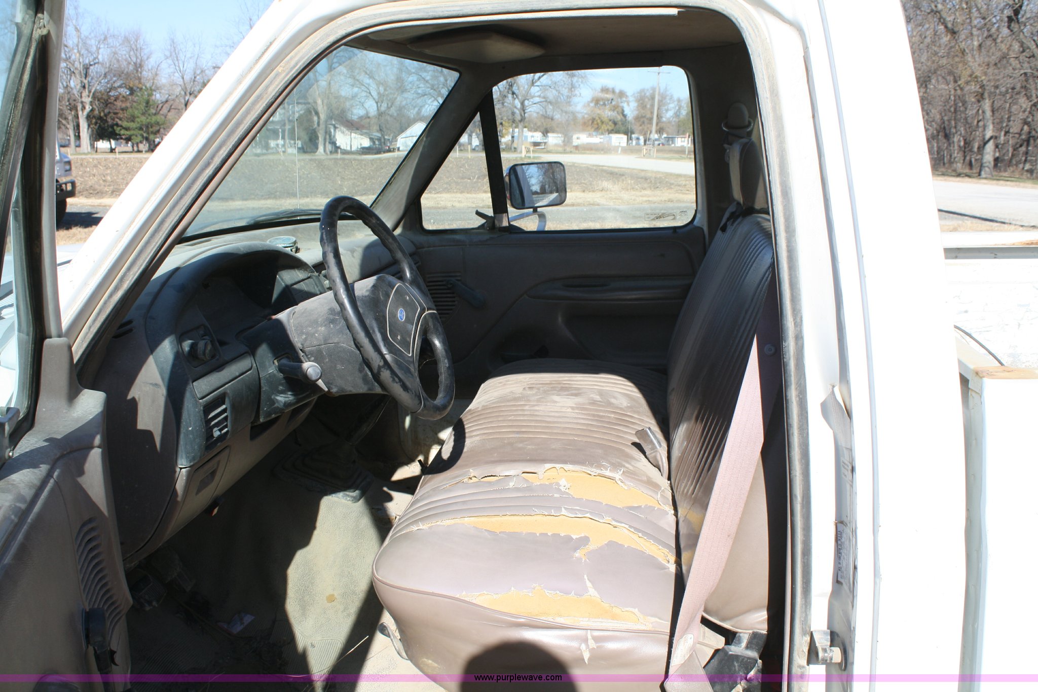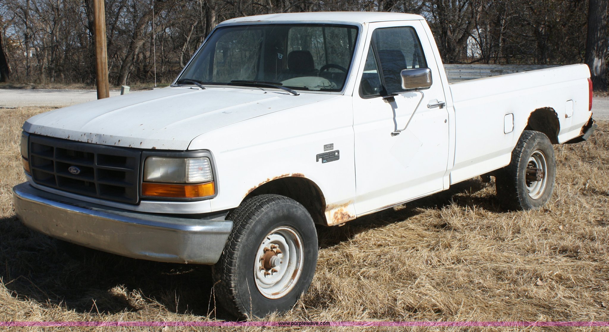 Purple Wave is selling a used Passenger Vehicle in Kansas. This item is a 1993 Ford F250 XL pickup truck with the following: Mileage unknown, 4.9L I6 EFI gas engine, Five speed manual transmission, 265/75R16 tires, Heat and AC, AM/FM, Manual windows and locks, Vinyl interior, Dead battery, Starter issues, Has not been used in approx. two years, EID P93